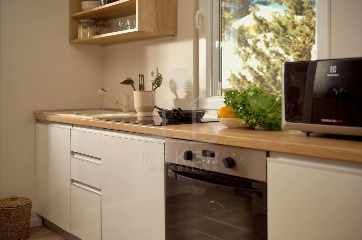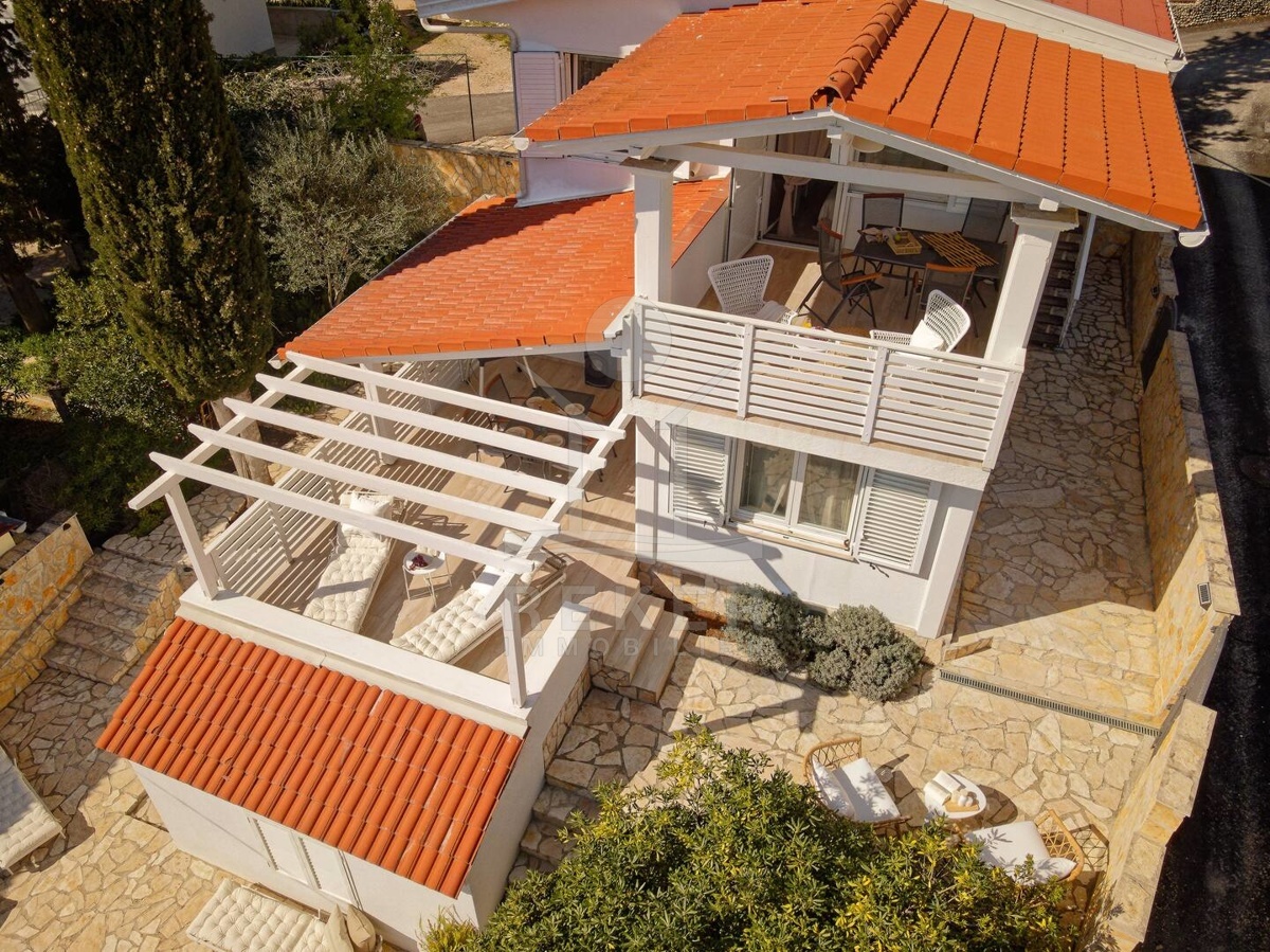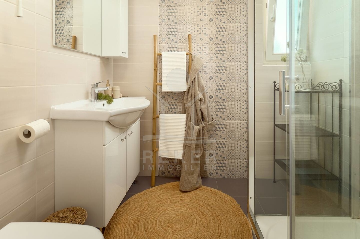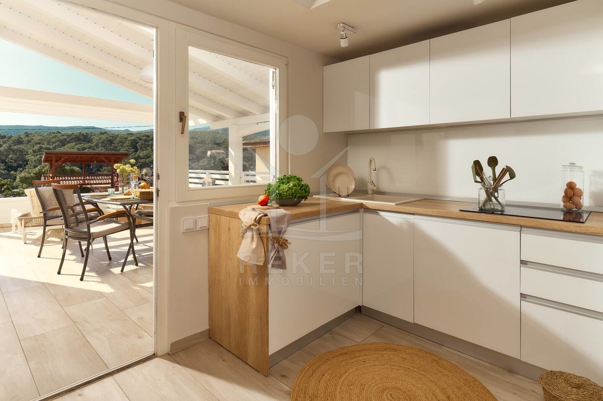 Das ansprechend gestaltete Apartmenthaus befindet sich auf einem 340 m² großen Grundstück, das nach Südosten ausgerichtet ist. Umgeben von einer Steinmauer, bietet der mediterrane Garten mit einheimischen Pflanzen eine ruhige und entspannte Atmosphäre. Das Gebäude erstreckt sich über 3 Etagen und bietet eine Wohnfläche von 150 m², die kürzlich im Jahr 2024 stilvoll renoviert und dekoriert wurde. Privatsphäre ist hier garantiert, und die beiden Stellplätze sorgen für eine bequeme Anreise.