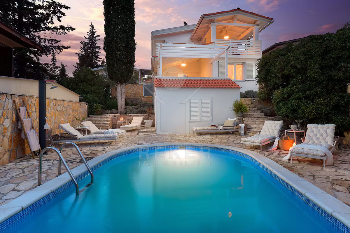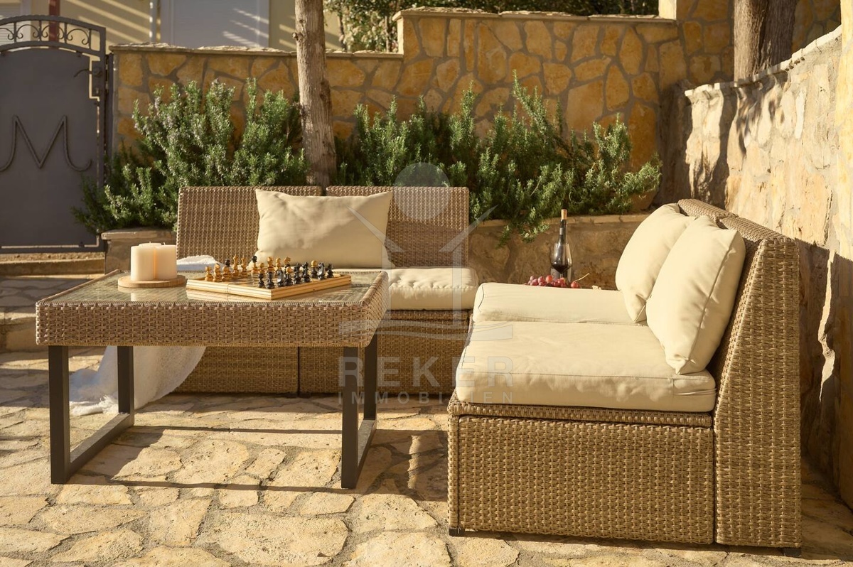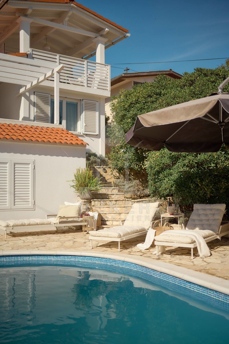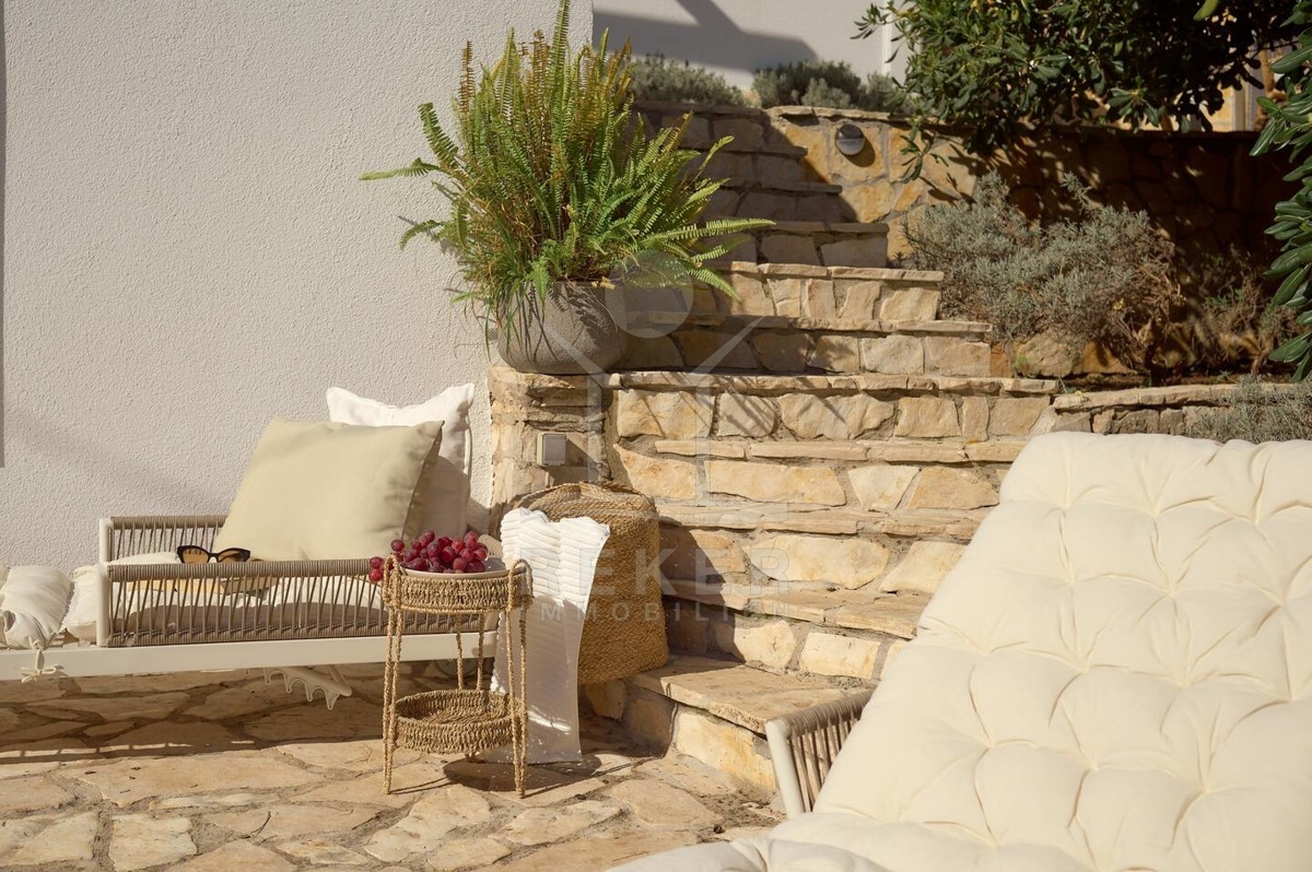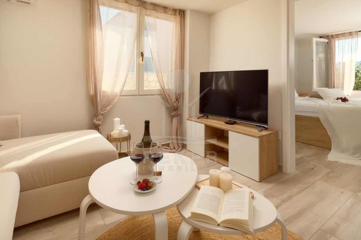 Das ansprechend gestaltete Apartmenthaus befindet sich auf einem 340 m² großen Grundstück, das nach Südosten ausgerichtet ist. Umgeben von einer Steinmauer, bietet der mediterrane Garten mit einheimischen Pflanzen eine ruhige und entspannte Atmosphäre. Das Gebäude erstreckt sich über 3 Etagen und bietet eine Wohnfläche von 150 m², die kürzlich im Jahr 2024 stilvoll renoviert und dekoriert wurde. Privatsphäre ist hier garantiert, und die beiden Stellplätze sorgen für eine bequeme Anreise.