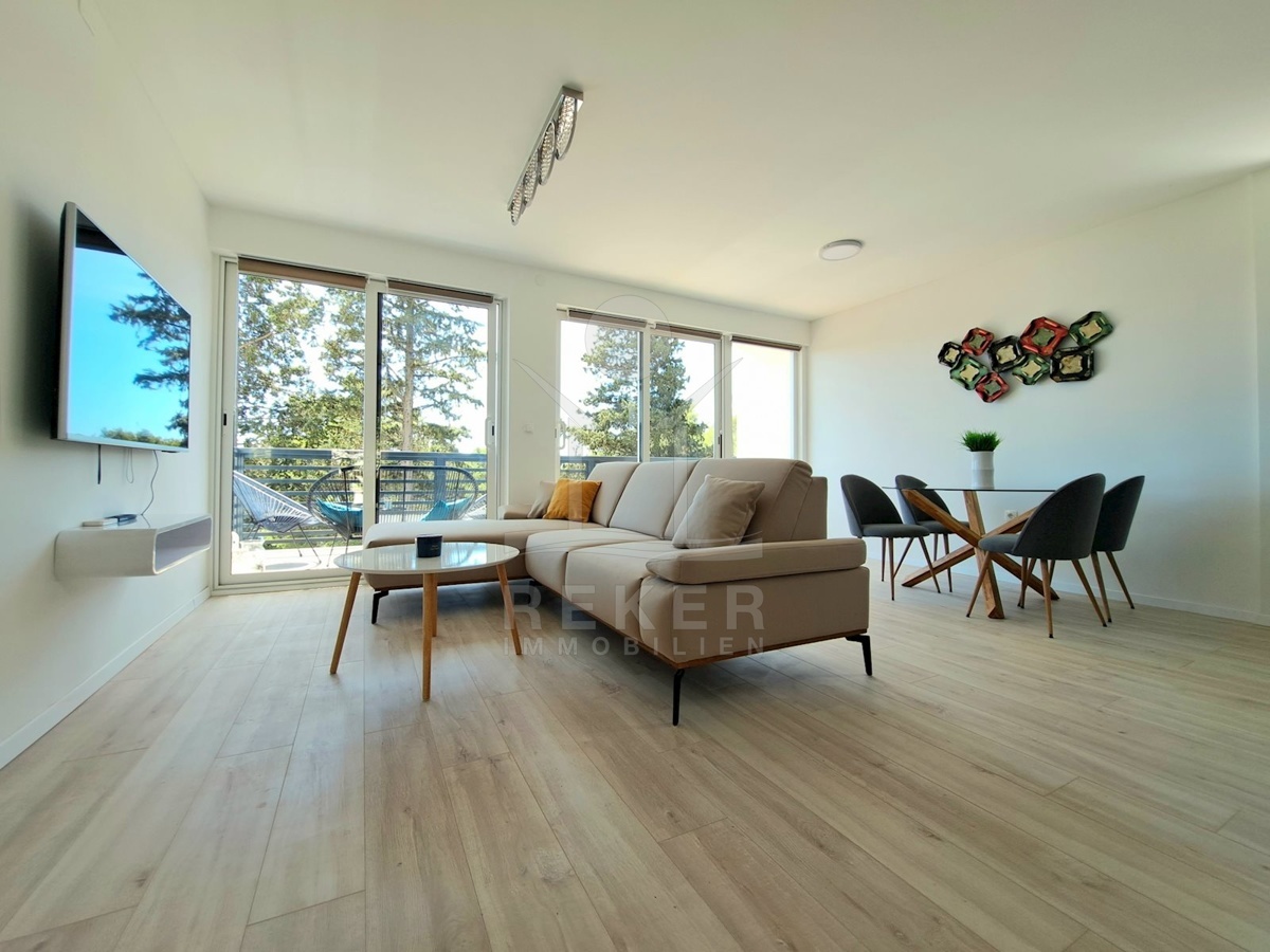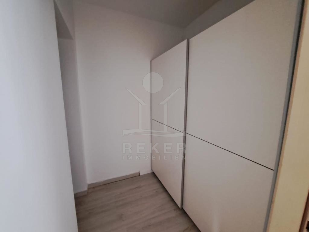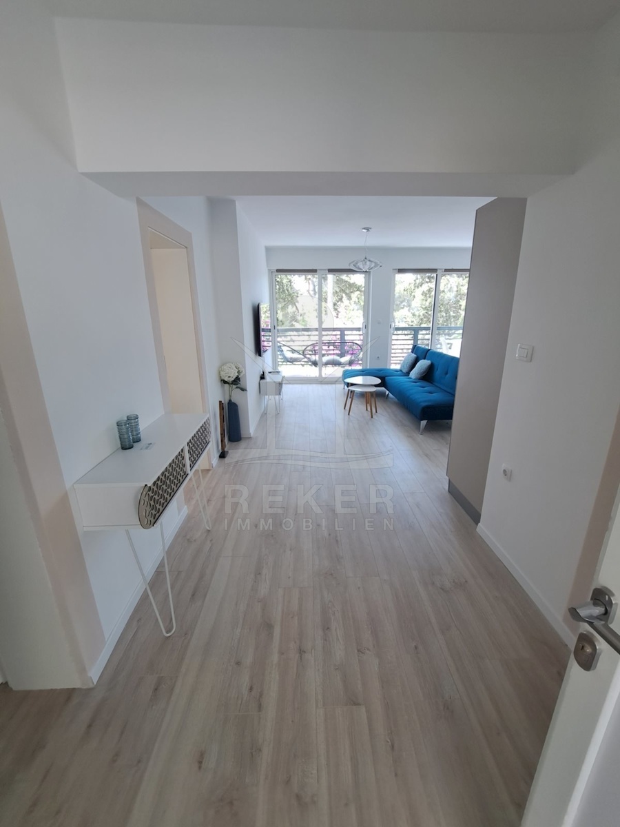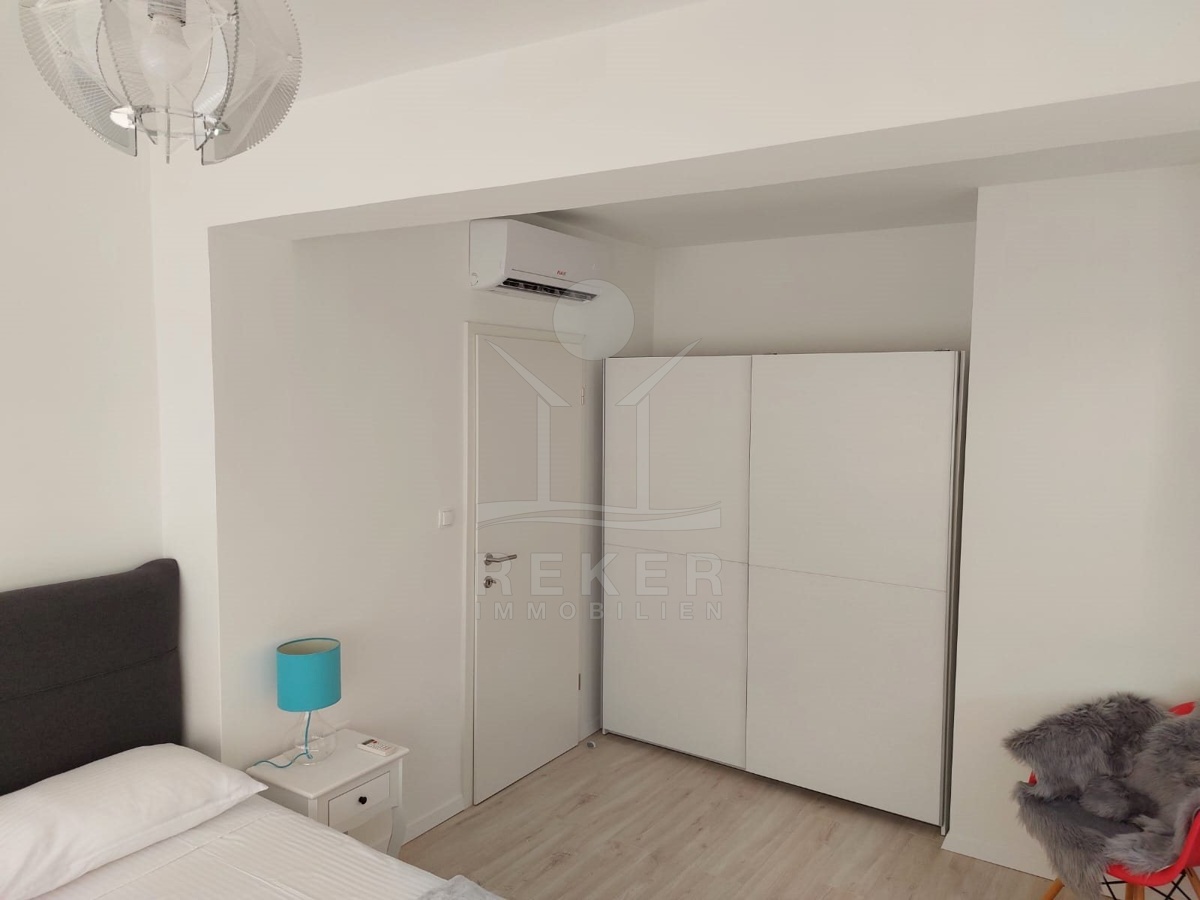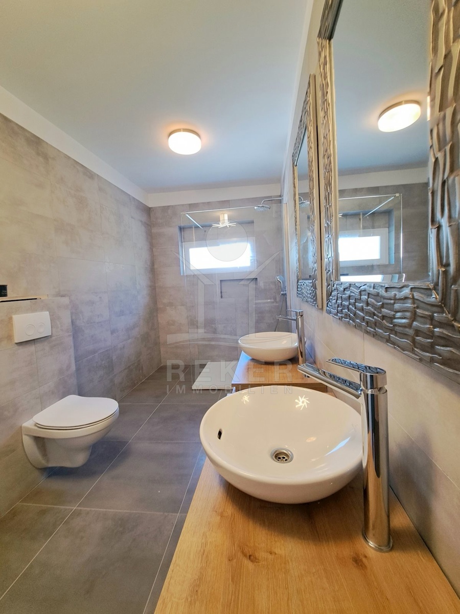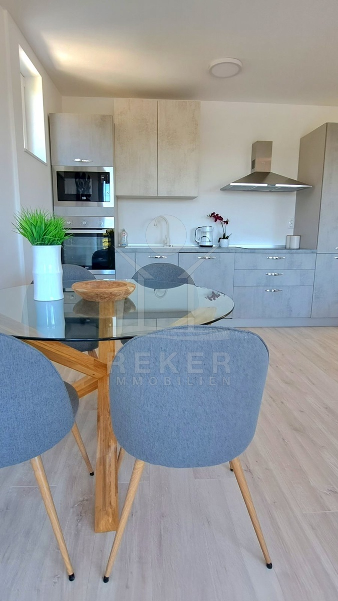 Im ersten Stock erwartet Sie ein geräumiges Apartment mit einer Wohnfläche von 80 m². Es verfügt über ein Wohn-, Ess- und Küchenbereich, zwei Schlafzimmer, ein Badezimmer und einen Balkon mit Blick auf das Meer.