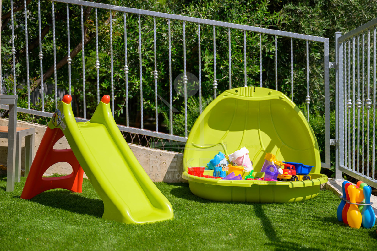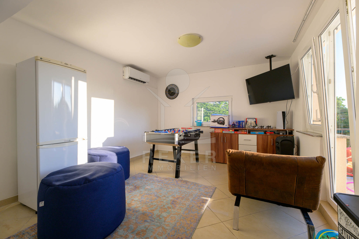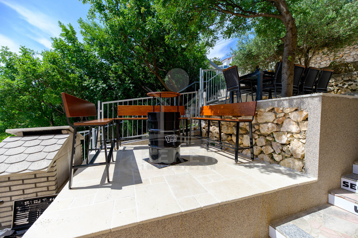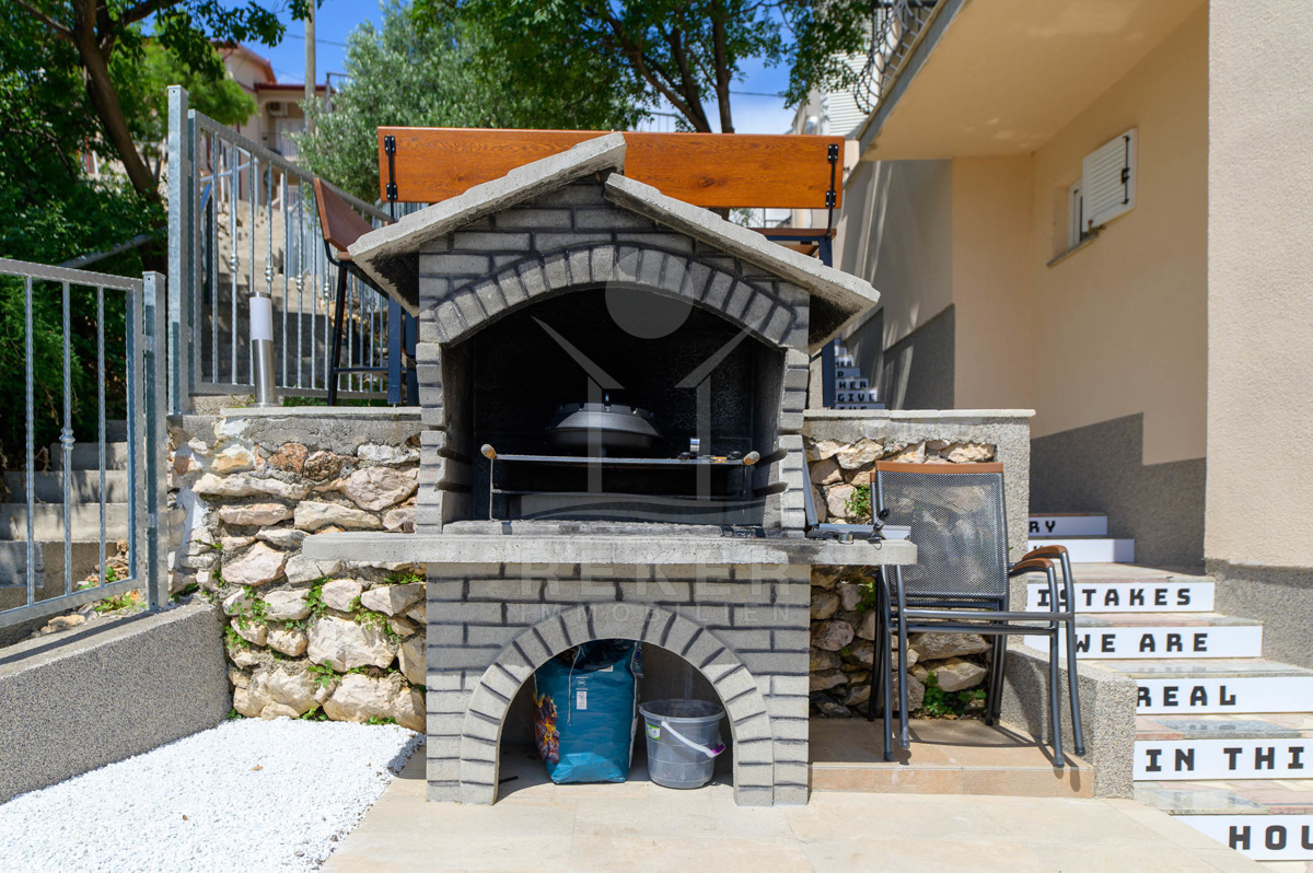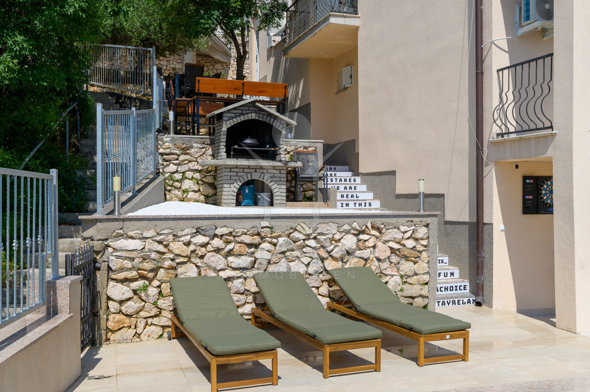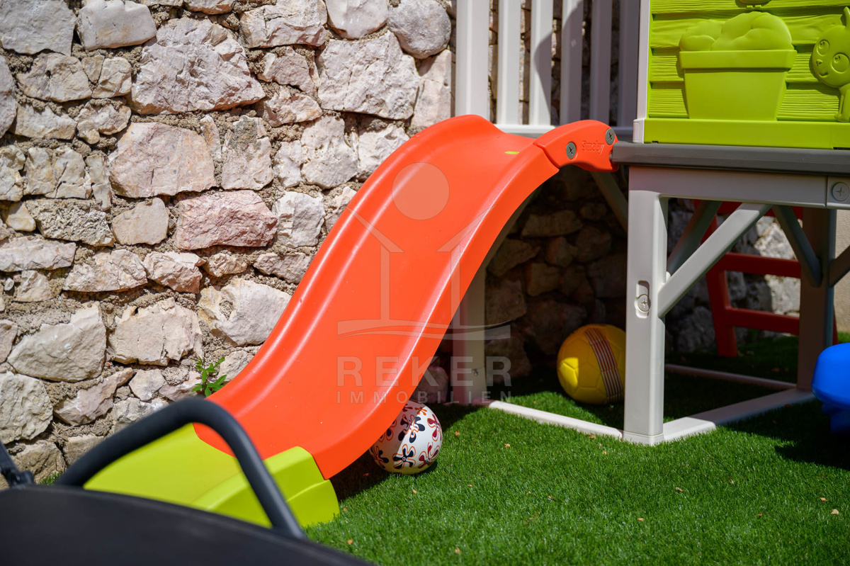 Darüber hinaus befindet sich oberhalb des Grundstücks ein traditioneller Steingrill, der perfekt für gemeinsame Grillabende geeignet ist. Zusätzlich ist ein Spielplatz für die kleinen Gäste vorgesehen. Mit ausreichend Parkplätzen für vier Fahrzeuge ist dieses Apartmenthaus eine rundum perfekte Wahl für Wohnkomfort und Entspannung.