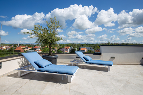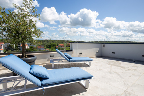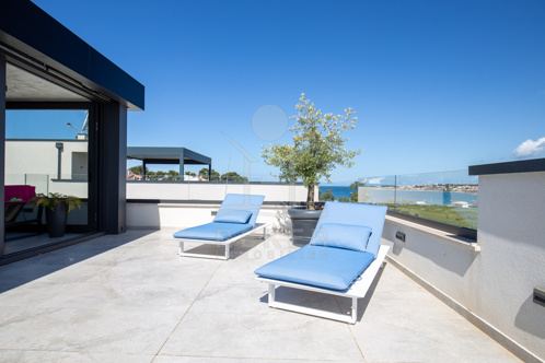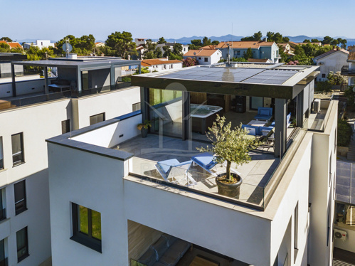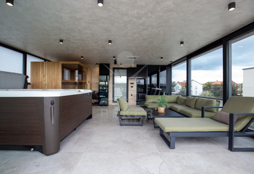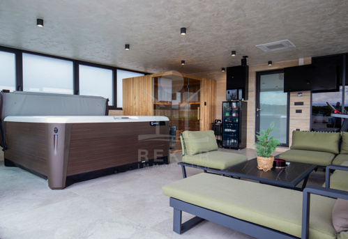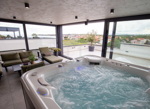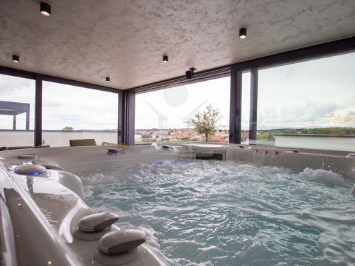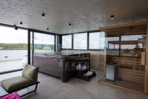 Die Dachterrasse des letzten Stocks ist ein wahre Wellness- und Wohlfühloase. Hier finden Sie einen gemeinschaftlichen Raum mit einem geschlossenen Bereich, der einen Whirlpool, eine Sauna, ein Badezimmer mit WC und Dusche sowie eine Sitzlounge für die Erholung bietet. Dieser Bereich kann bei Bedarf dank Schiebeelementen bequem geöffnet werden. Der offene Freiluftbereich der Dachterrasse besticht mit einem atemberaubenden Meerblick und lädt dazu ein, die Umgebung zu bewundern und die Sonne zu genießen.