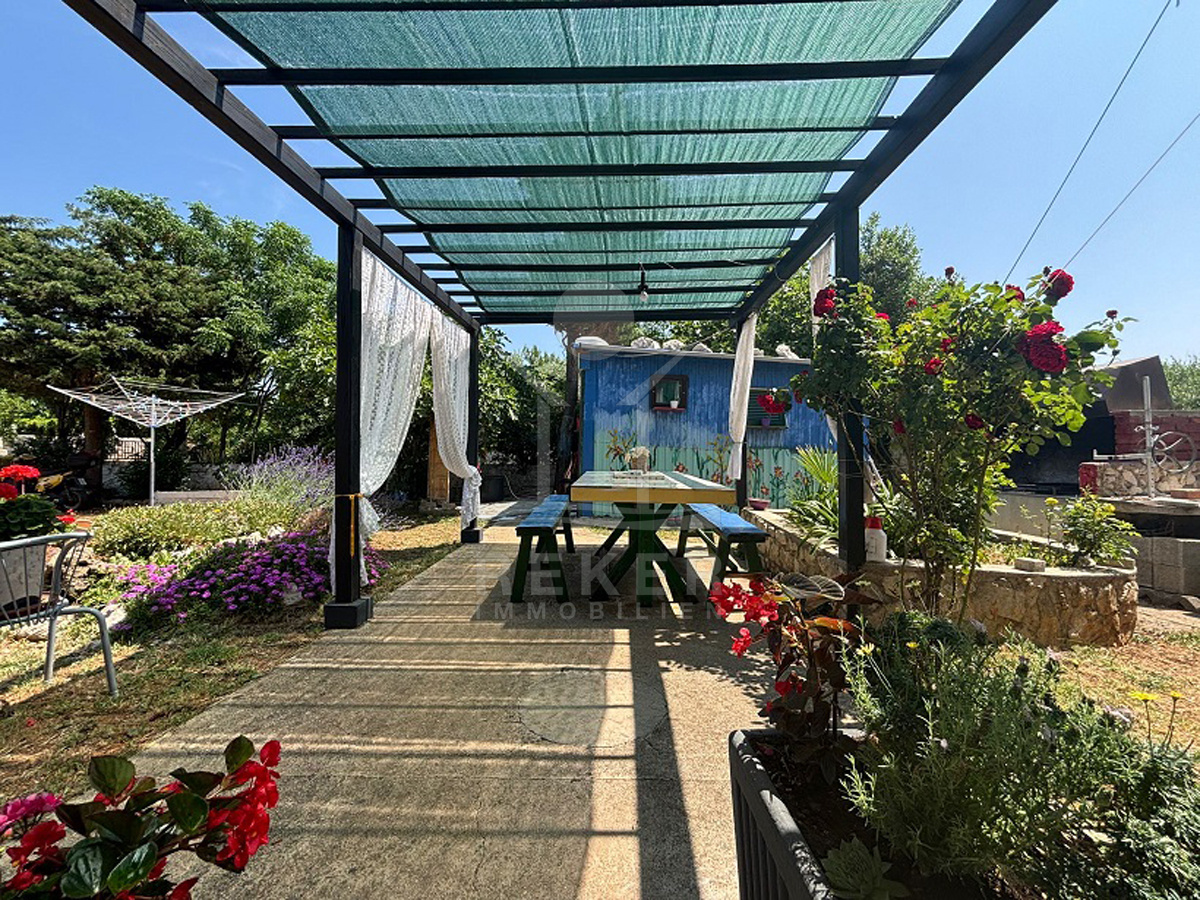 Vor dem Haus finden Sie eine überdachte Terrasse mit Pergola. Das 391 m² große Grundstück ist mit mediterranen Pflanzen angelegt und hält viele Annehmlichkeiten bereit: einen Steingrill für gesellige Abende, eine Außendusche für die Erfrischung nach dem Strand und einen Abstellraum für zusätzlichen Stauraum.