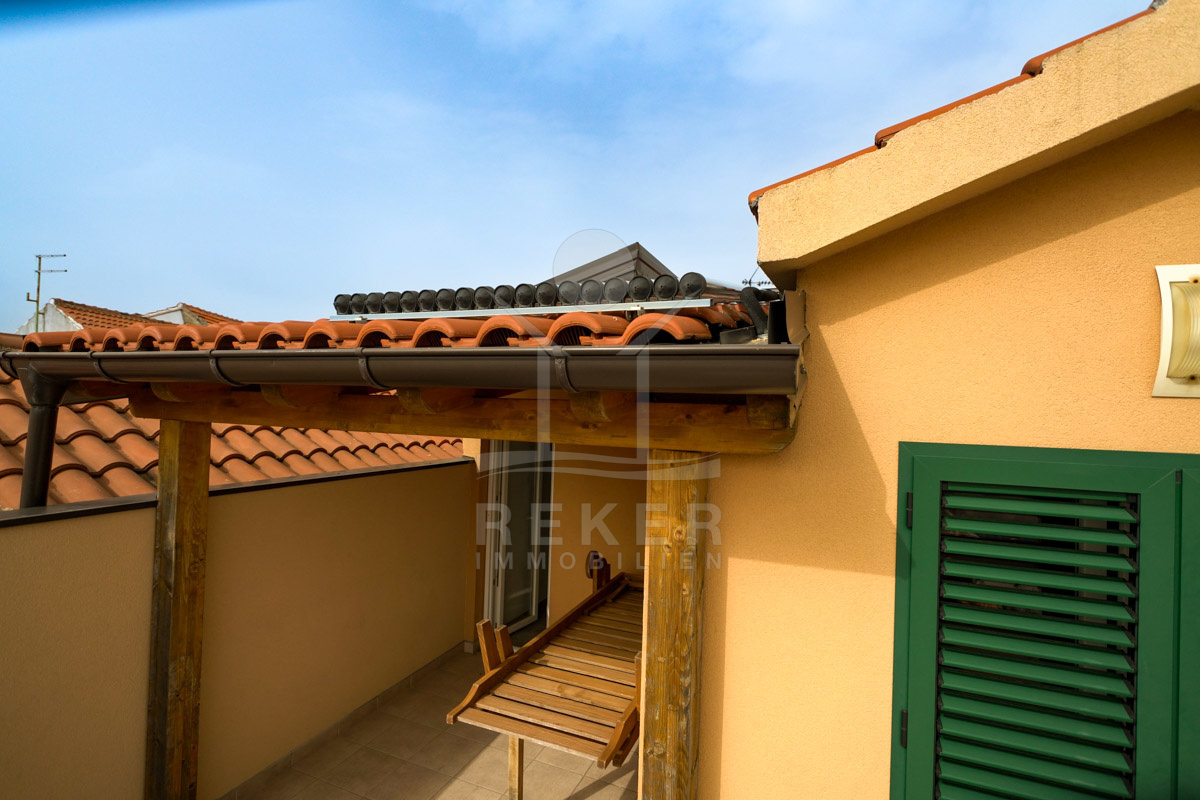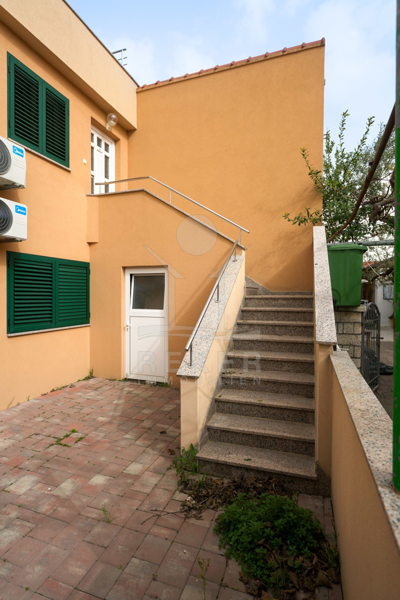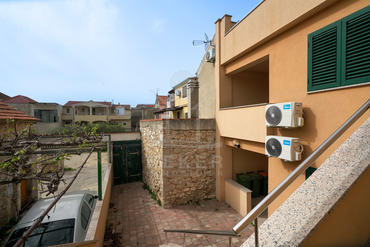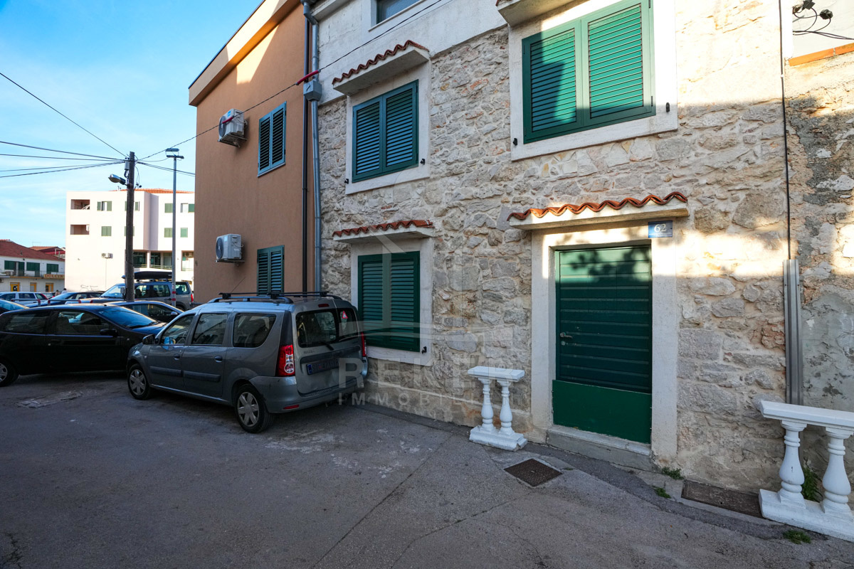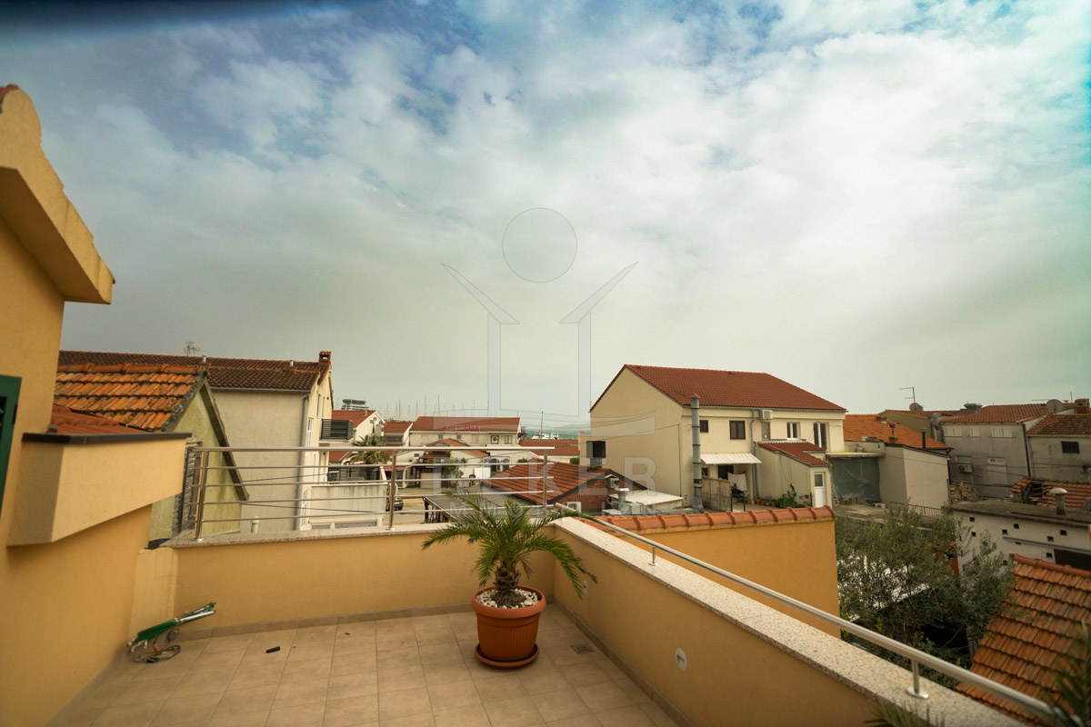 Das Haus in Vodice bietet vielfältige Wohnmöglichkeiten auf drei Etagen. Im Erdgeschoss und ersten Stock befinden sich jeweils voll möblierte Wohnungen mit 2 Schlafzimmern, Küche, Wohnzimmer und Badezimmer. Der 2. Stock beherbergt eine geräumige 3-Zimmerwohnung mit Zugang zur Terrasse, die bereits für einen Whirlpool vorbereitet ist. Der Außenbereich bietet einen Blick auf das Meer und einen überdachten Essbereich im Freien.