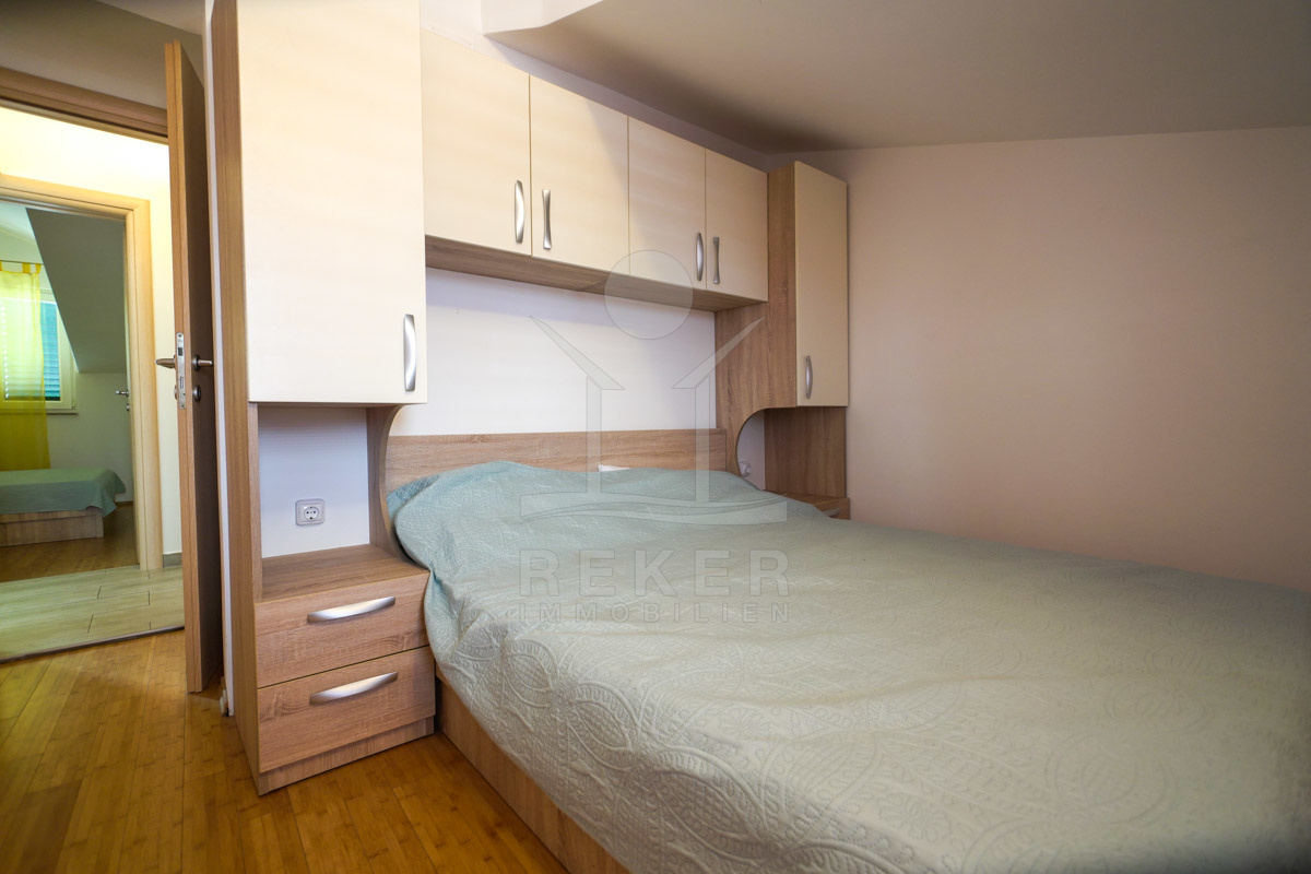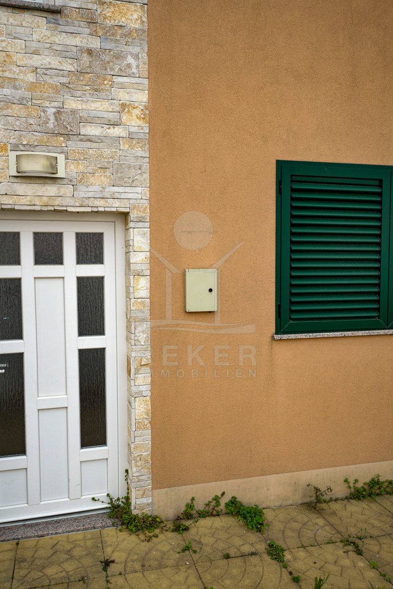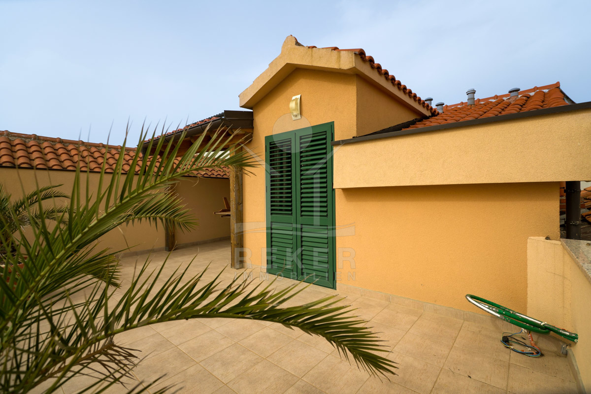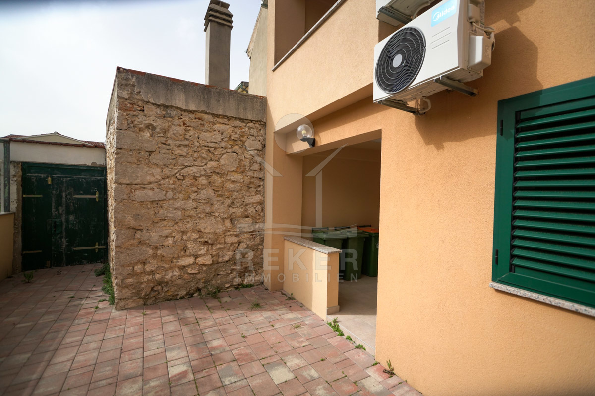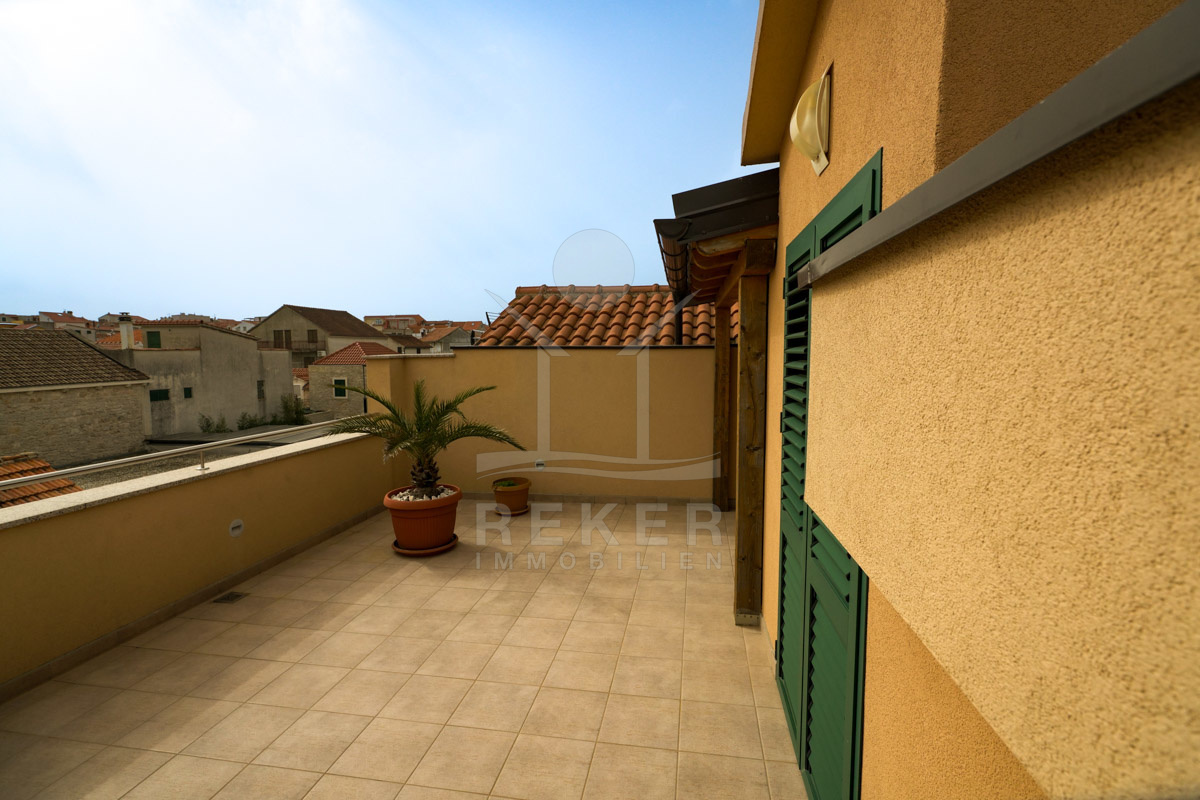 Das Haus in Vodice bietet vielfältige Wohnmöglichkeiten auf drei Etagen. Im Erdgeschoss und ersten Stock befinden sich jeweils voll möblierte Wohnungen mit 2 Schlafzimmern, Küche, Wohnzimmer und Badezimmer. Der 2. Stock beherbergt eine geräumige 3-Zimmerwohnung mit Zugang zur Terrasse, die bereits für einen Whirlpool vorbereitet ist. Der Außenbereich bietet einen Blick auf das Meer und einen überdachten Essbereich im Freien.