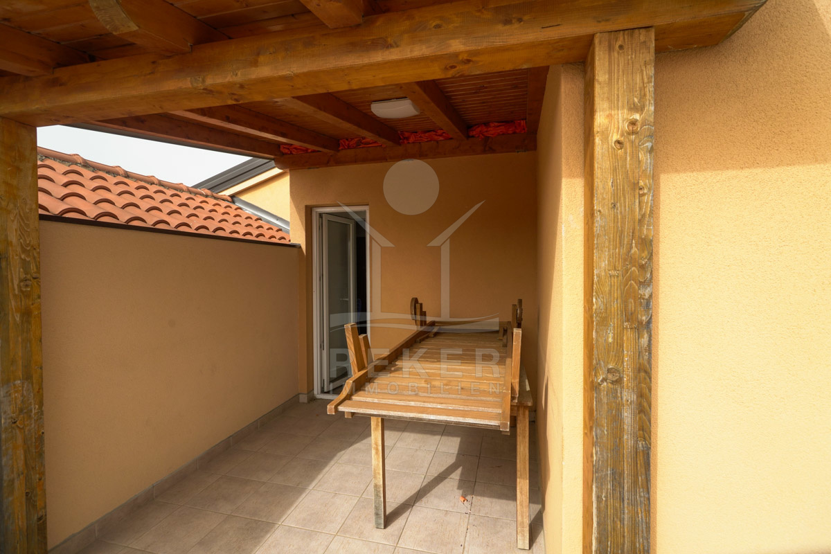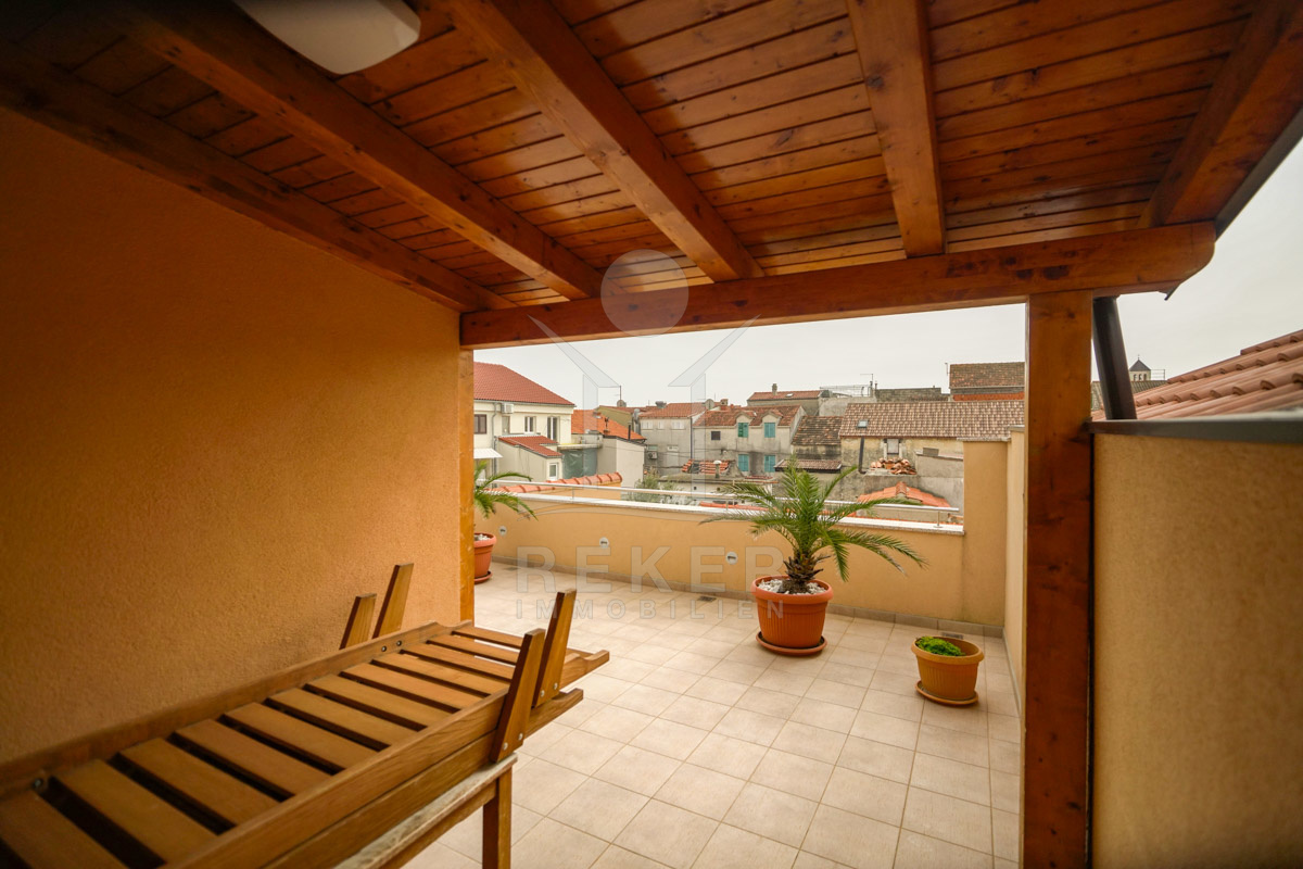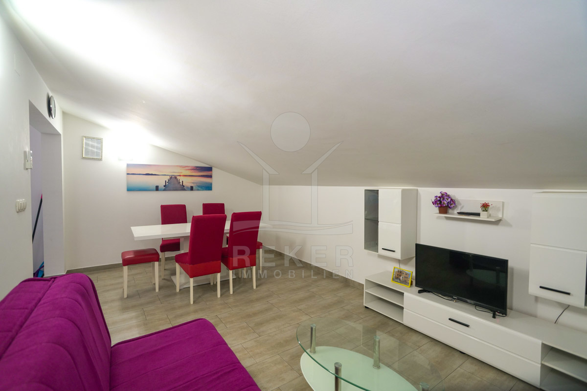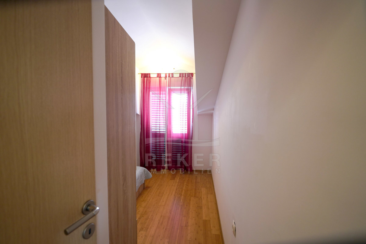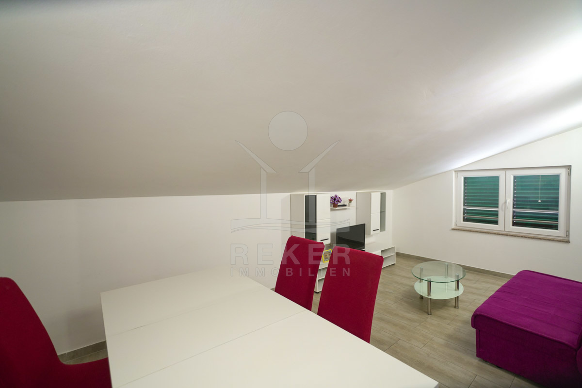 Das Haus in Vodice bietet vielfältige Wohnmöglichkeiten auf drei Etagen. Im Erdgeschoss und ersten Stock befinden sich jeweils voll möblierte Wohnungen mit 2 Schlafzimmern, Küche, Wohnzimmer und Badezimmer. Der 2. Stock beherbergt eine geräumige 3-Zimmerwohnung mit Zugang zur Terrasse, die bereits für einen Whirlpool vorbereitet ist. Der Außenbereich bietet einen Blick auf das Meer und einen überdachten Essbereich im Freien.