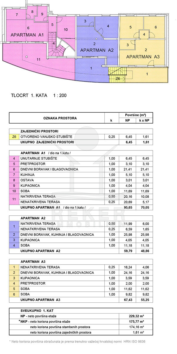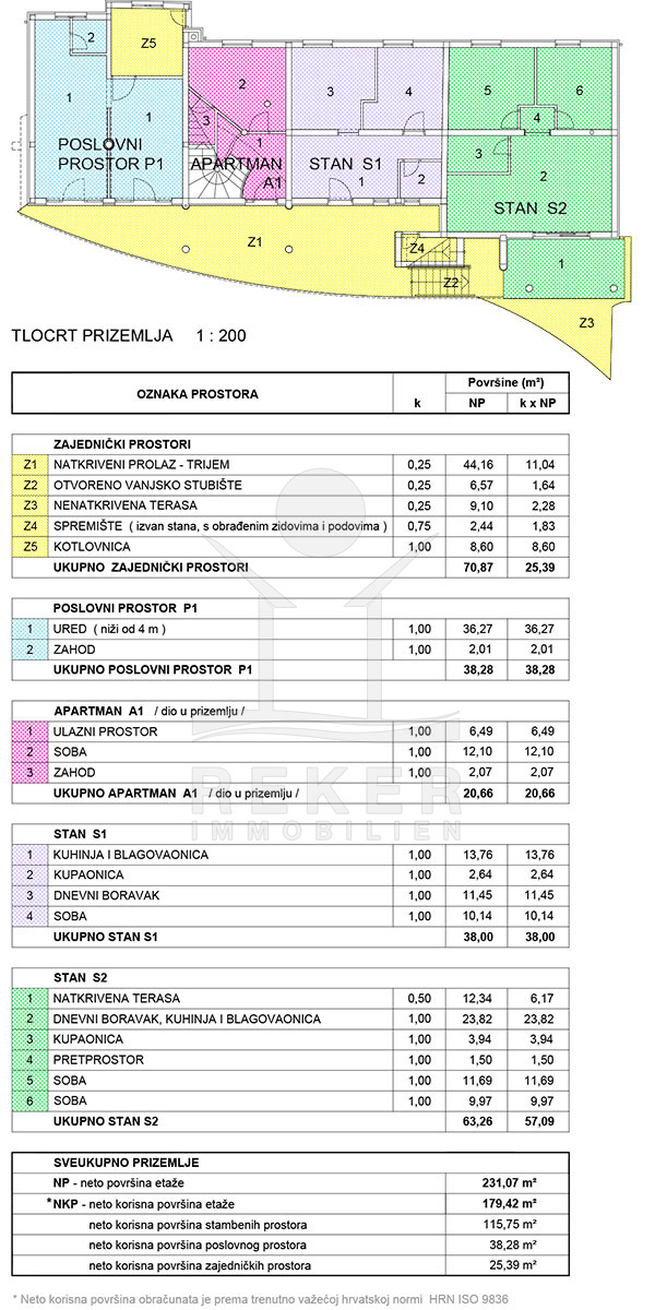 Im Erdgeschoss gibt es einen Büroraum, ein 20 m² großes Studio-Apartment und 2 Wohnungen, von denen eine 1 Schlafzimmer und die andere 2 Schlafzimmer hat. Zudem gibt es eine Maisonette-Wohnung mit 2 Zimmern, einem Abstellraum und 2 Terrassen, von denen eine überdacht und die andere nicht überdacht ist.