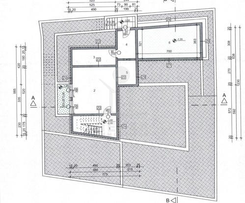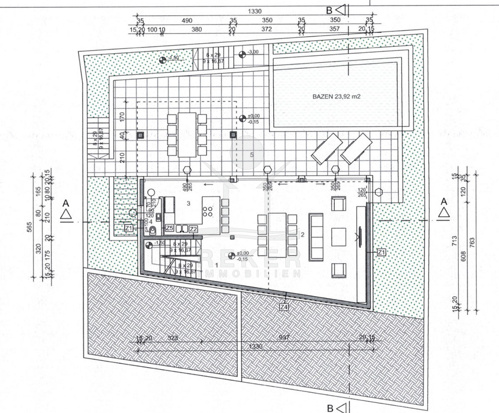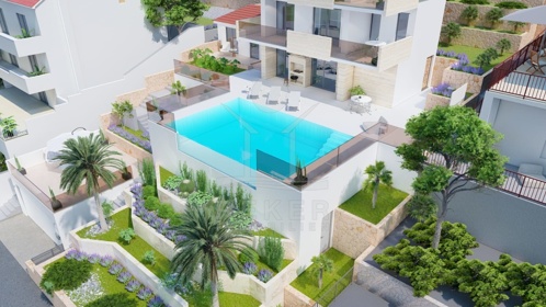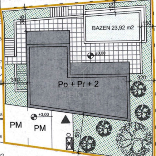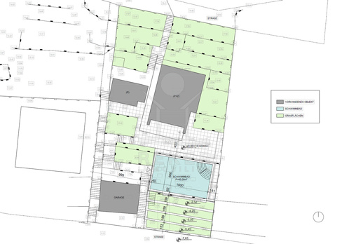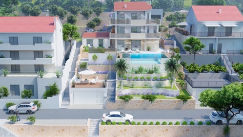 Das Baugrundstück mit 756 m² bietet die Möglichkeit, eine große Villa zu errichten, bestehend aus einem Erdgeschoss, einem Obergeschoss und einem zweiten Obergeschoss mit einer Terrasse und einem Pool. Zudem gehört eine Garage zum Bauvorhaben dazu.