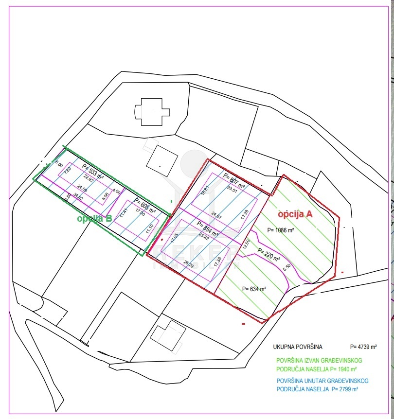 Das Grundstück Nr. 3 umfasst 807 m² und bietet zusätzlich 1.086 m² landwirtschaftliche Nutzfläche. Das Grundstück Nr. 4 erstreckt sich über eine Fläche von 854 m² und verfügt zudem über 634 m² Ackerland. Es gibt außerdem eine 220 m² Straße (auf dem Plan als Opatija A gekennzeichnet).