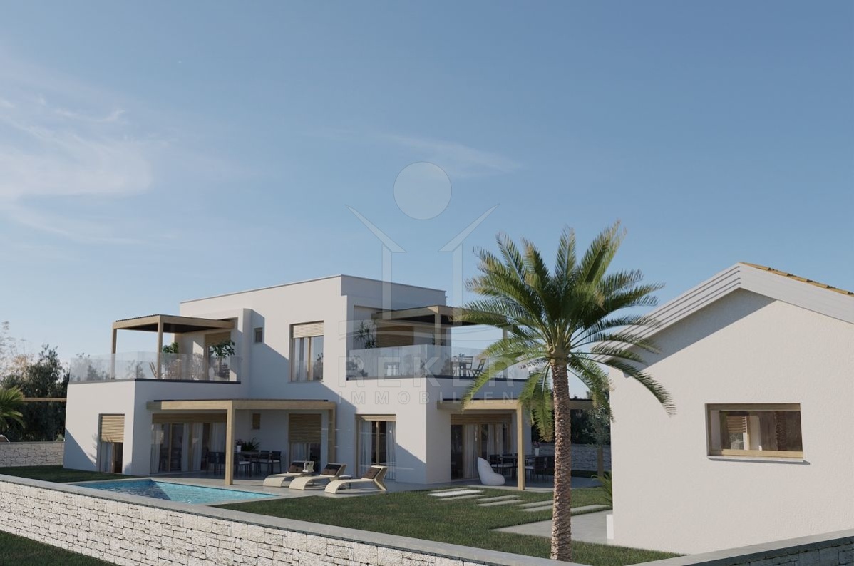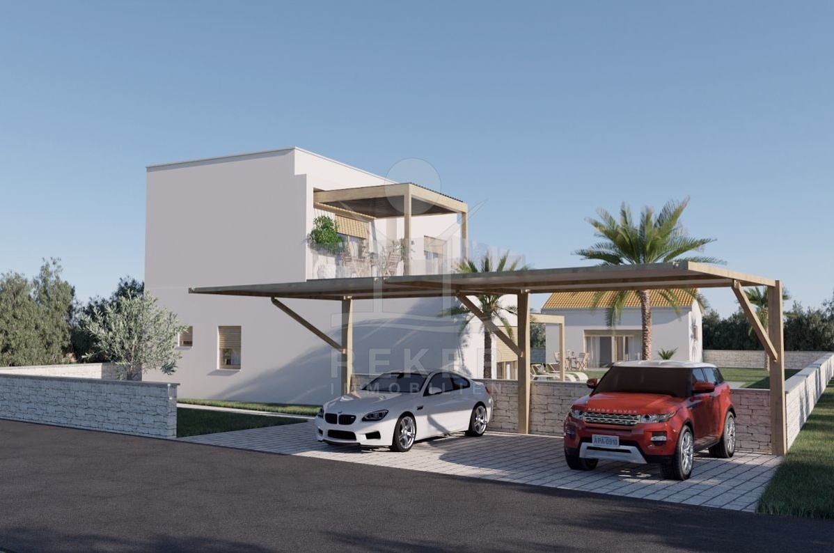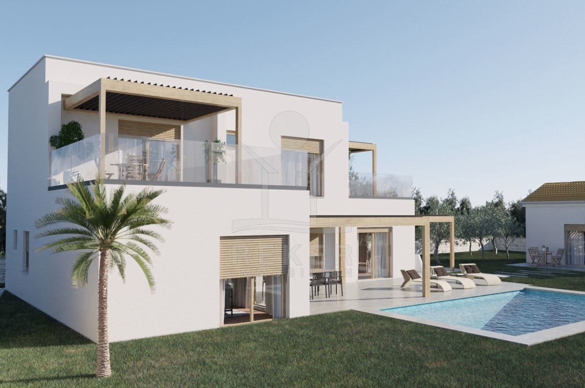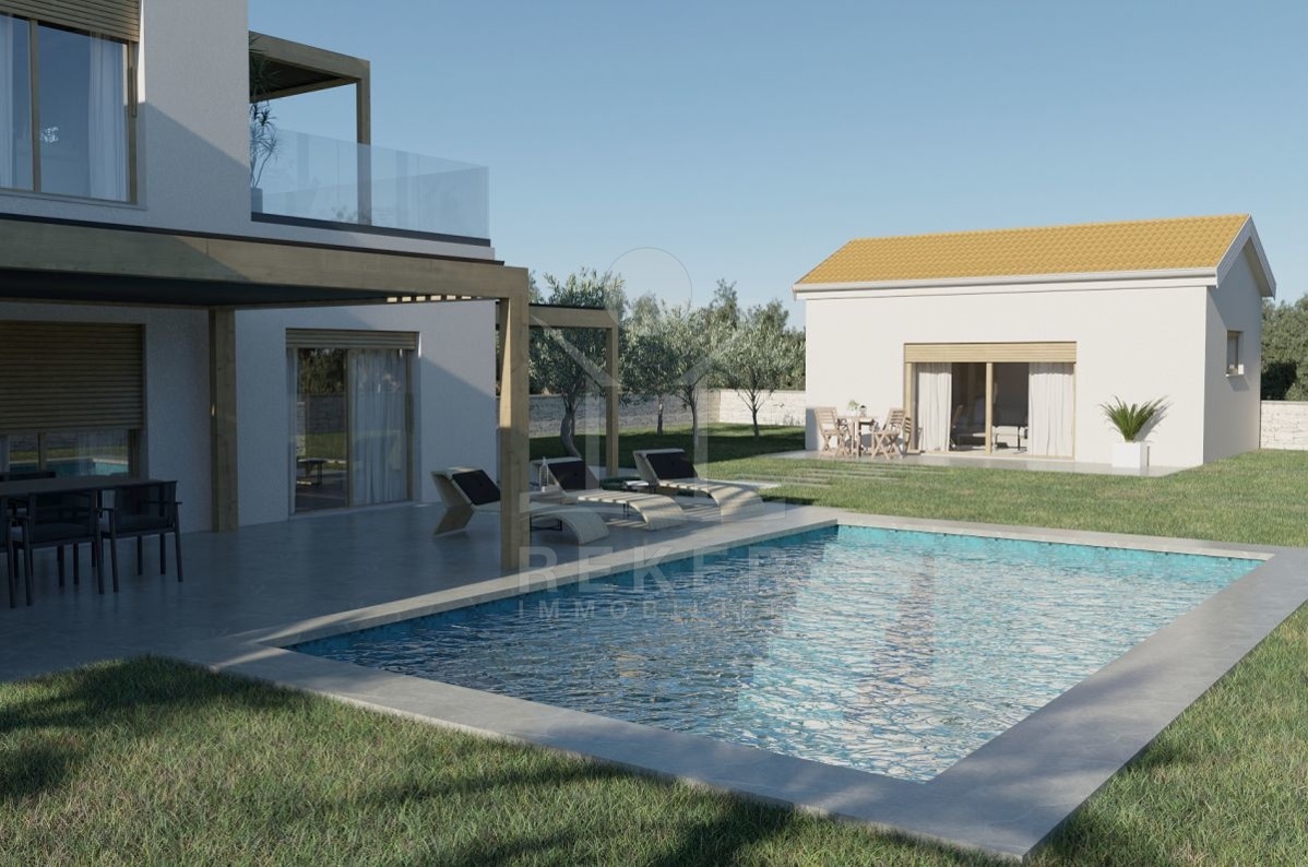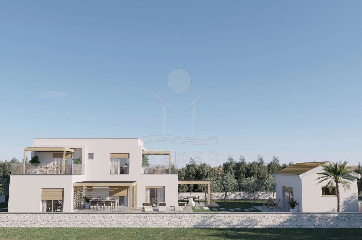 Das Einfamilienhaus umfasst im Erdgeschoss ein Wohnzimmer, eine Küche, einen Essbereich, zwei Schlafzimmer, zwei Badezimmer, ein Gäste-WC, einen Abstellraum, einen Flur und eine Terrasse. Im ersten Stock befinden sich zwei weitere Schlafzimmer, zwei Badezimmer und zwei Terrassen. Zusätzlich ist ein Nebengebäude mit einer Fläche von 40 m² geplant, sowie ein Pool. Das Baugrundstück bietet somit die Möglichkeit, eine luxuriöse und geräumige Villa und ein gemütliches Nebengebäude zu errichten.
