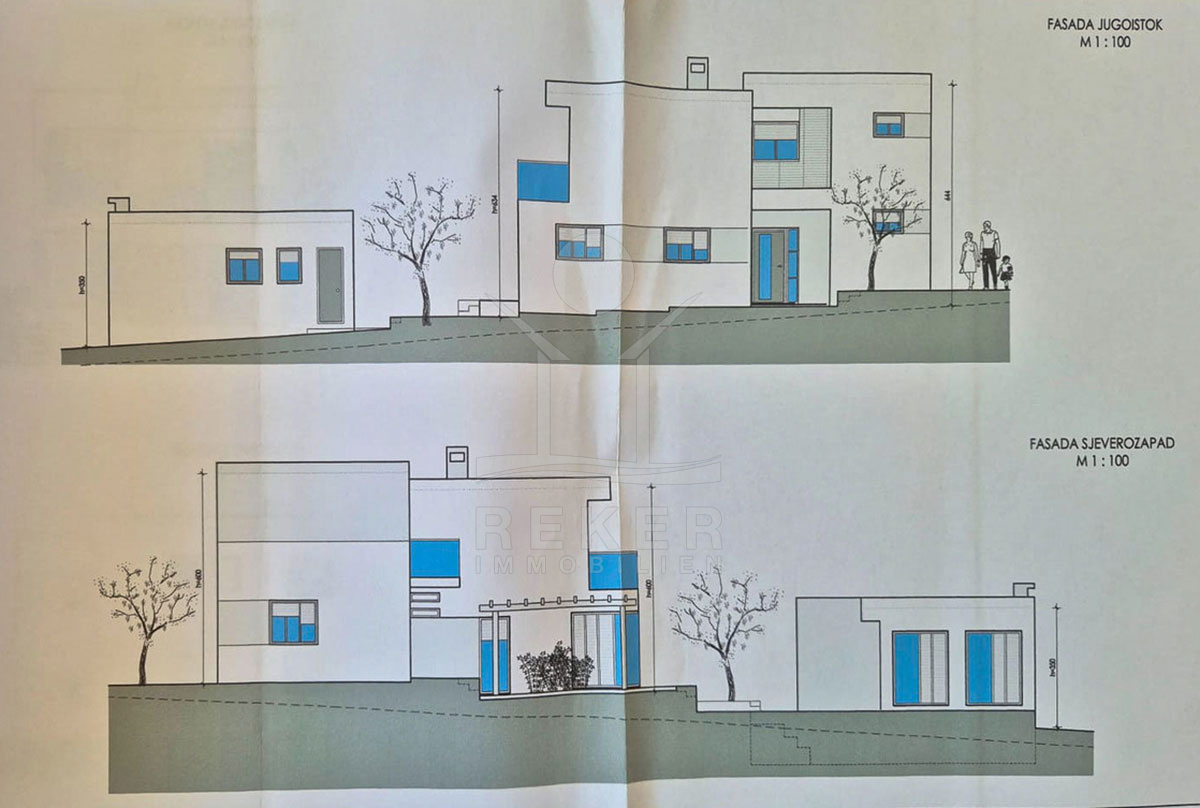 Zum Angebot gehört ein Projekt für eine moderne Villa mit Swimmingpool und Nebengebäude. Die Architektur setzt auf klare Linien und große Fensterfronten. Auf zwei Etagen sind großzügige Wohnbereiche geplant, die viel Raum für Komfort schaffen. Die Genehmigungsunterlagen sind bereits eingereicht. Damit ist ein rascher Baubeginn möglich.