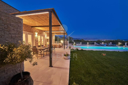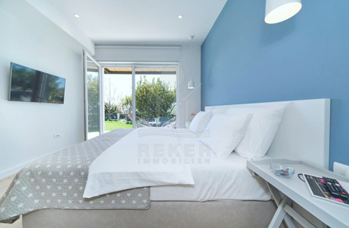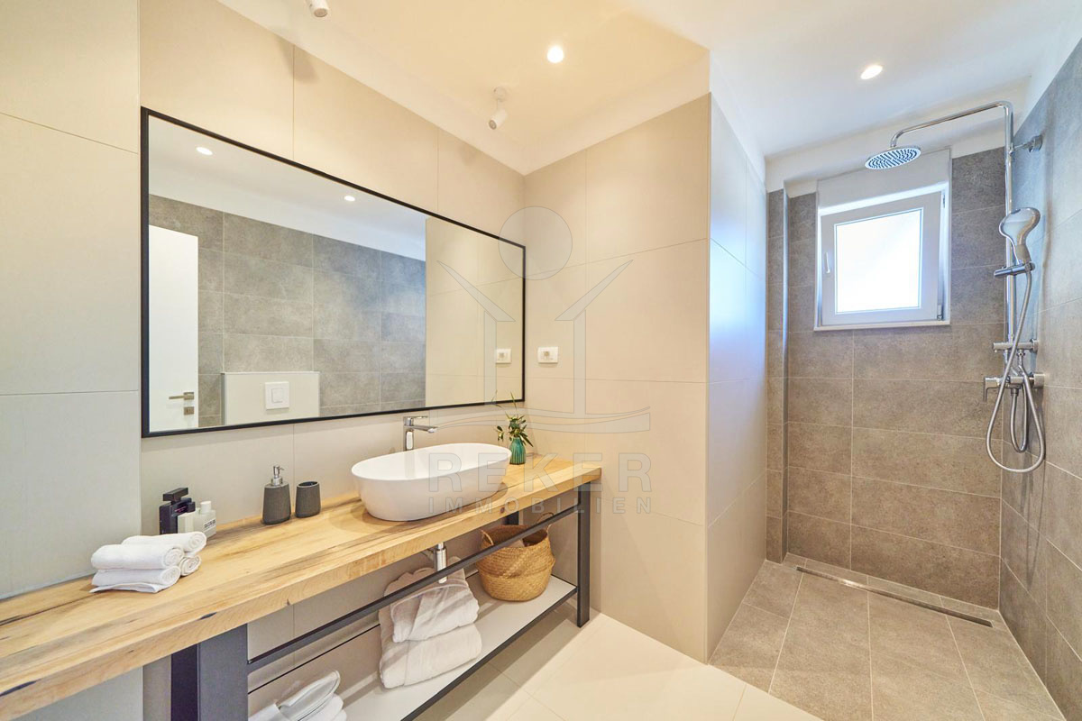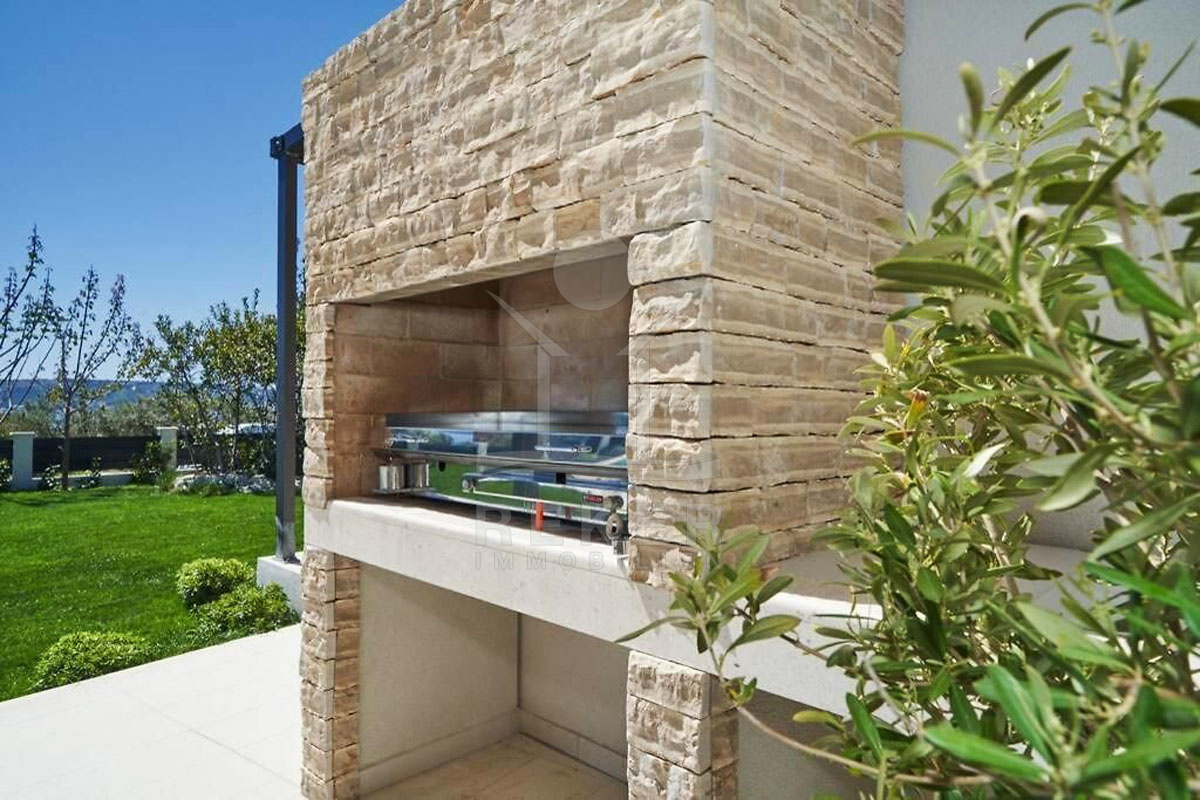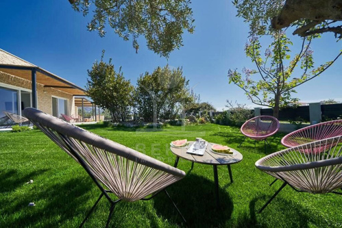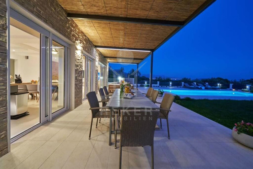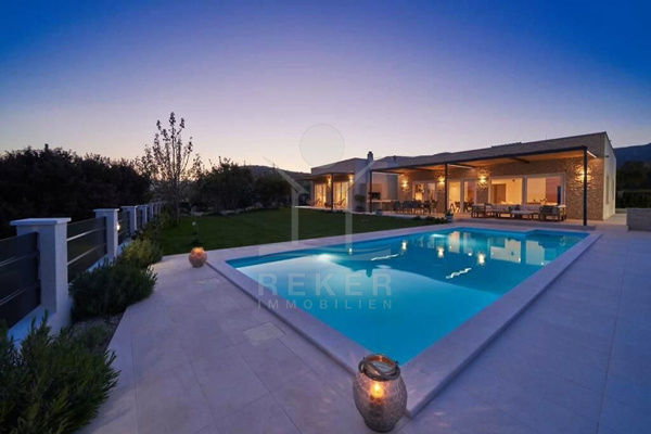 Die Luxusvilla, erbaut im Jahr 2020, bietet Ihnen eine großzügige Wohnfläche von 180 m² und beeindruckt durch ihre friedliche Lage mit einer schönen Gartenlandschaft, die Privatsphäre und Abgeschiedenheit garantiert. Das ebenerdige Gebäude sorgt für maximalen Komfort und Leichtigkeit. Das Anwesen mit einer Grundstücksfläche von 1012 m², das in Richtung Süden ausgerichtet ist und von viel Grün umgeben ist – ohne Nachbarhäuser –, bietet Platz für bis zu 5 Autos, darunter 2 mit überdachtem Parkplatz. Ein wahres Wohnparadies!