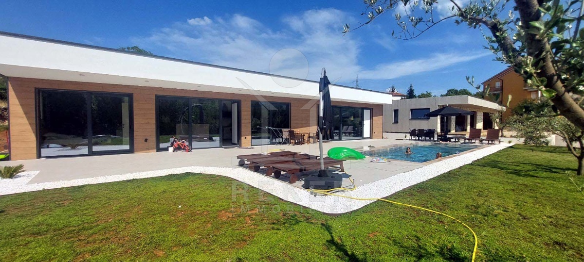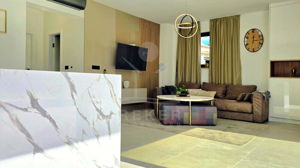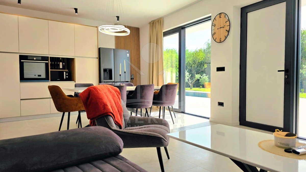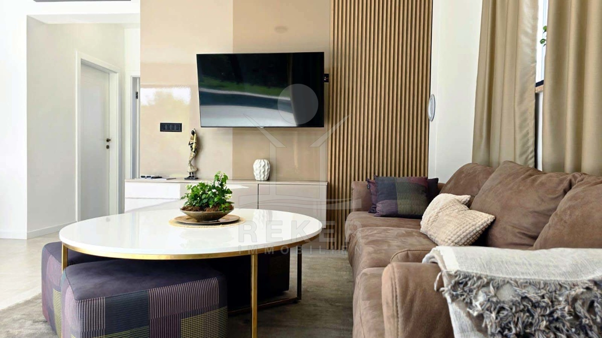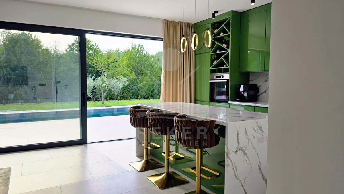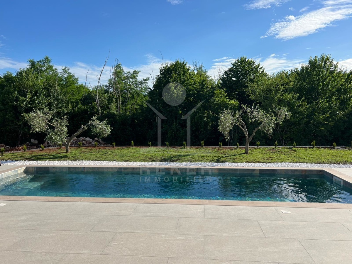 Wer in Labin naturnah leben möchte und trotzdem schnell in der Stadt sein will, findet hier die perfekte Balance. Diese neu gebaute Villa liegt in einer ruhigen Umgebung, nur acht Minuten vom Zentrum entfernt. Die nächste Einkaufsmöglichkeit erreichen Sie in wenigen Minuten mit dem Auto. Das Beste: Vor der Villa erstreckt sich eine unbebaubare Fläche – Ihr freier Blick ins Grüne bleibt Ihnen sicher erhalten.