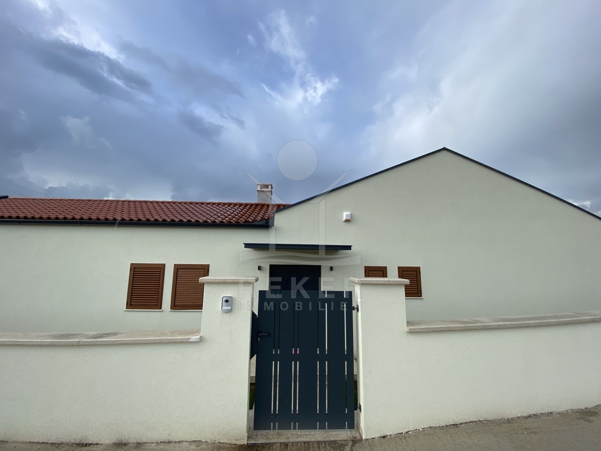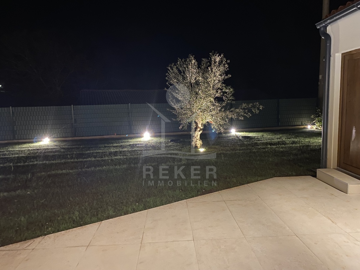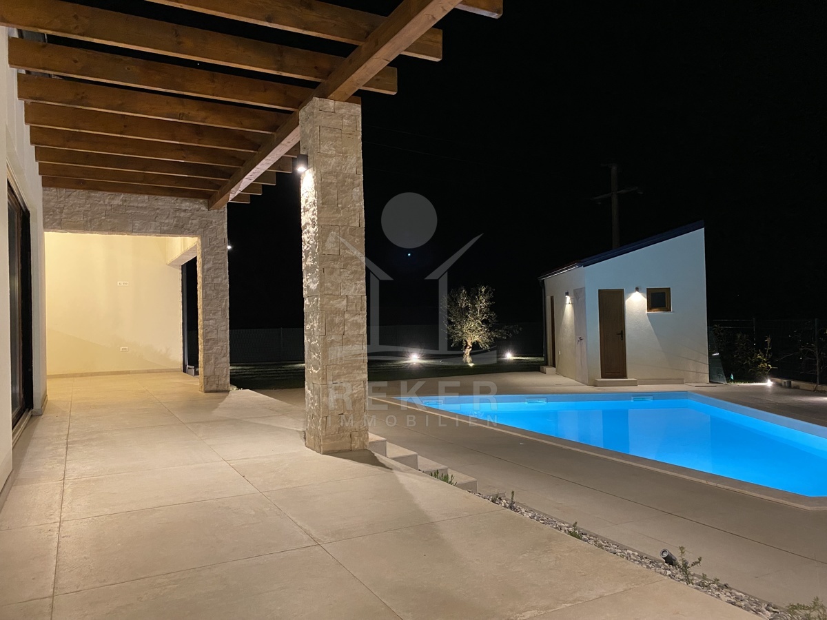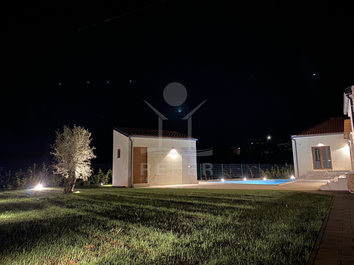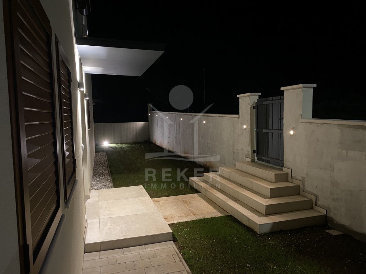 Rund 18 Kilometer von der Küste entfernt, liegt dieses hochwertige Einfamilienhaus eingebettet in die grüne Hügellandschaft bei Tinjan. Die Umgebung ist geprägt von Ruhe, Natur und viel Privatsphäre. Es gibt kaum Nachbarn – dafür Wald, mediterrane Pflanzen und eine wenig befahrene Straße direkt vor dem Grundstück. Wer Natur liebt und Wert auf Ungestörtheit legt, findet hier ein echtes Refugium.
