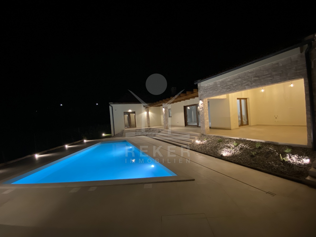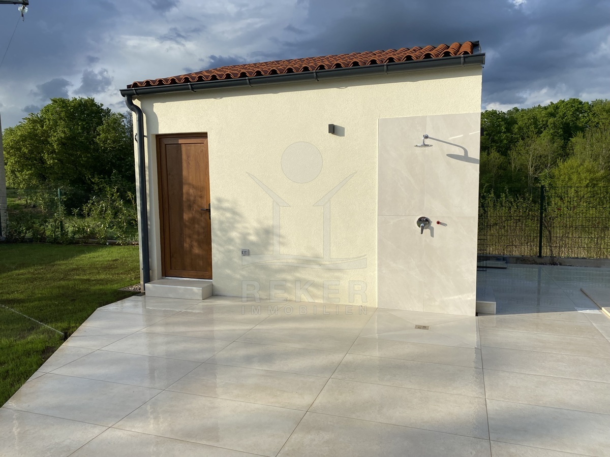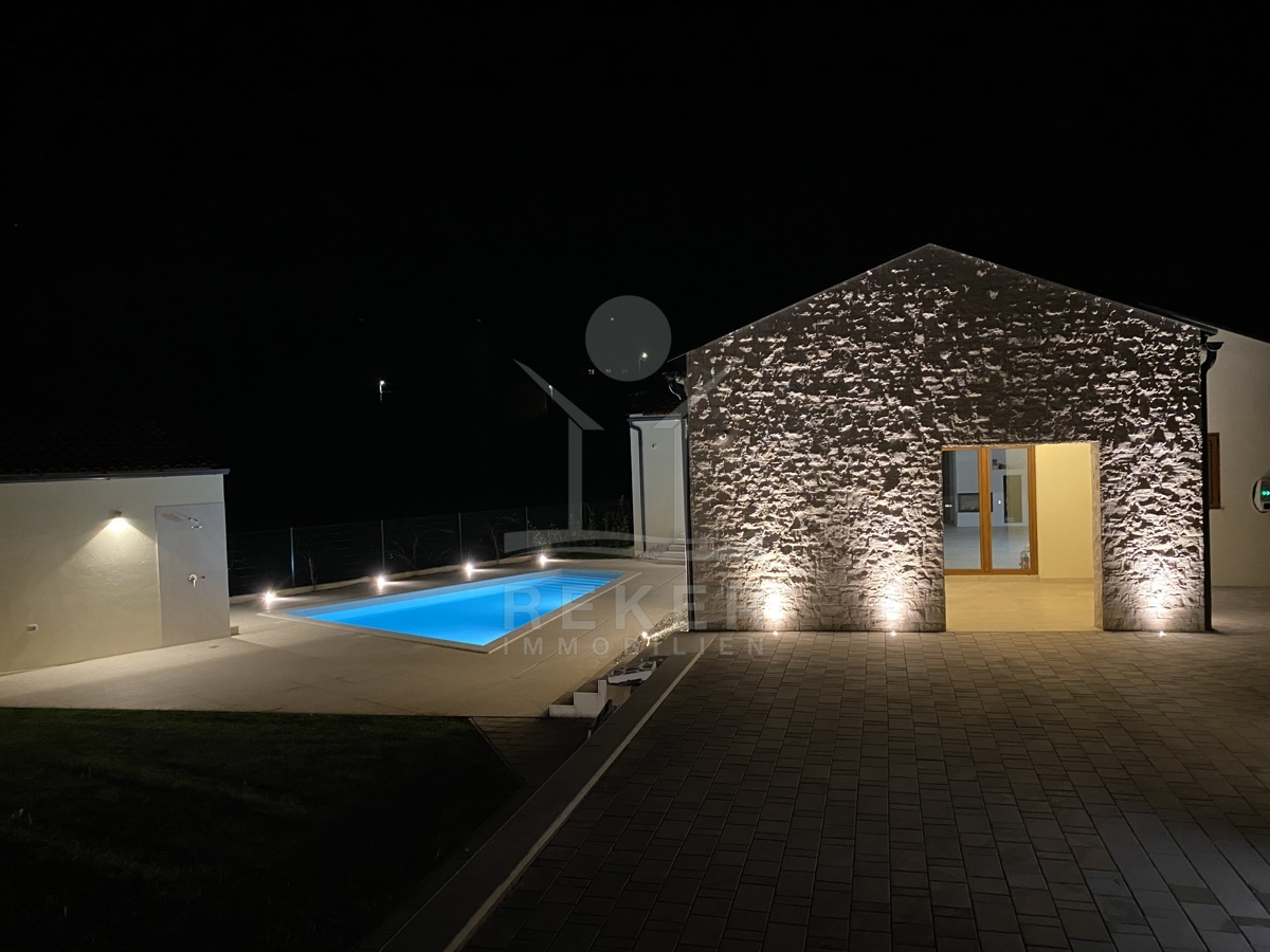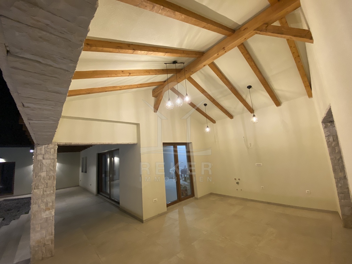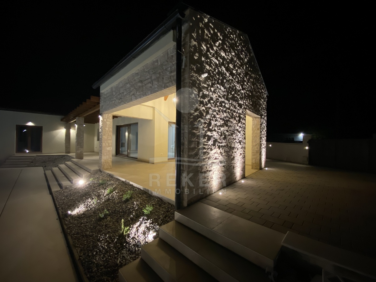 Rund 18 Kilometer von der Küste entfernt, liegt dieses hochwertige Einfamilienhaus eingebettet in die grüne Hügellandschaft bei Tinjan. Die Umgebung ist geprägt von Ruhe, Natur und viel Privatsphäre. Es gibt kaum Nachbarn – dafür Wald, mediterrane Pflanzen und eine wenig befahrene Straße direkt vor dem Grundstück. Wer Natur liebt und Wert auf Ungestörtheit legt, findet hier ein echtes Refugium.