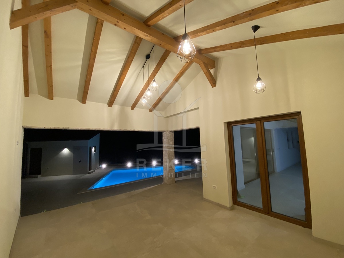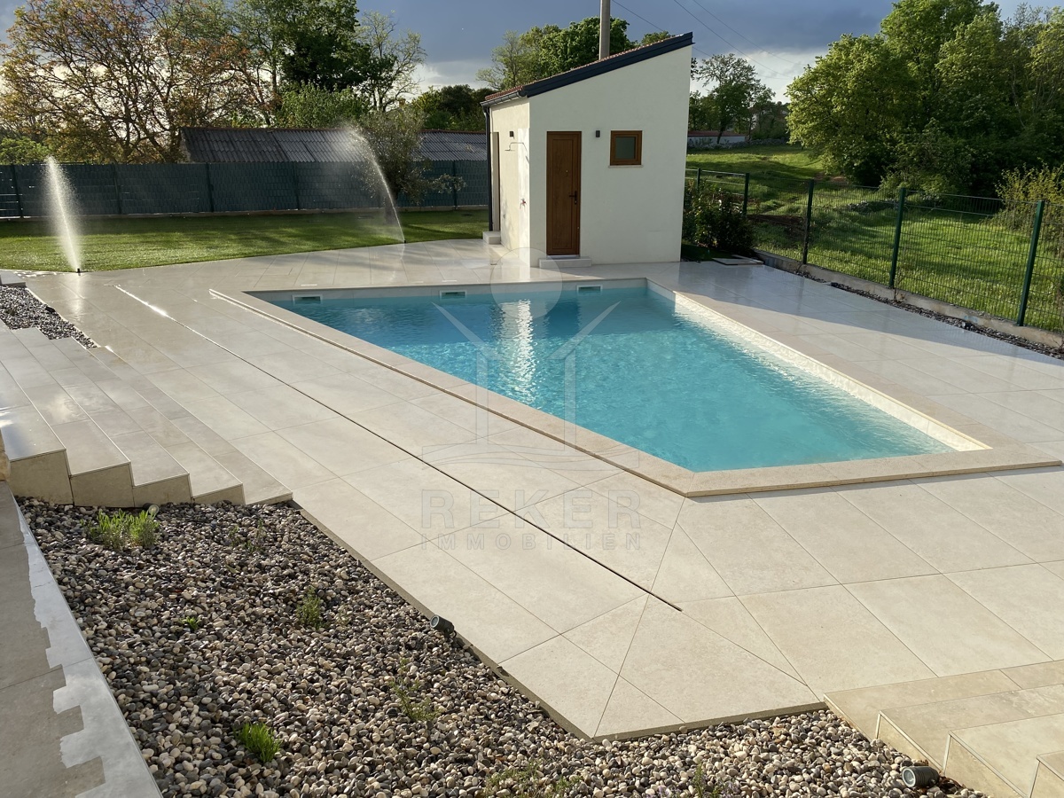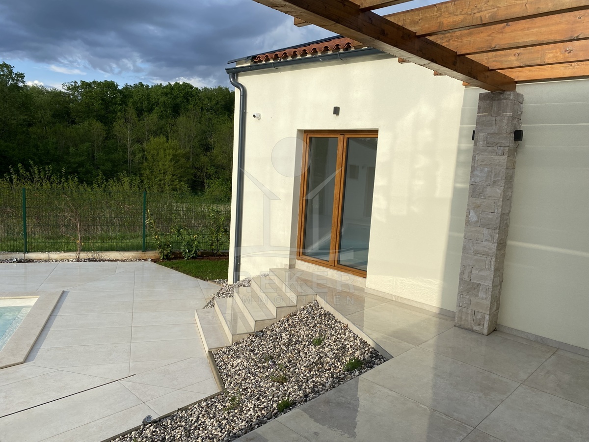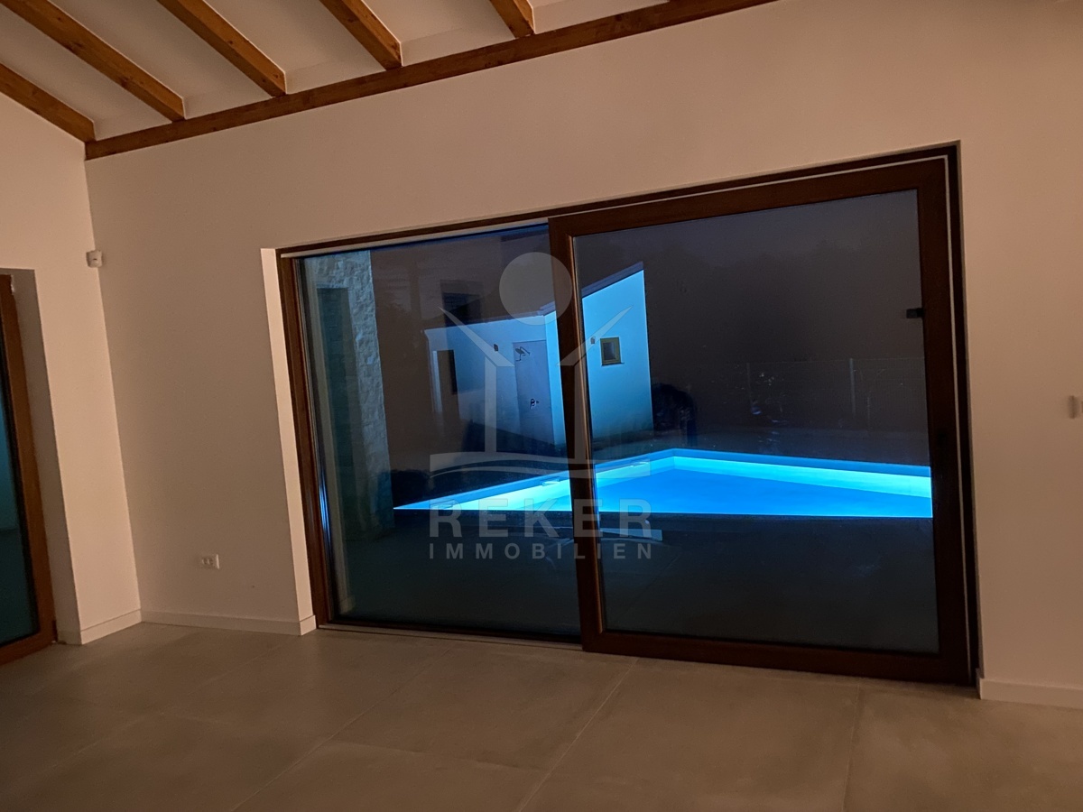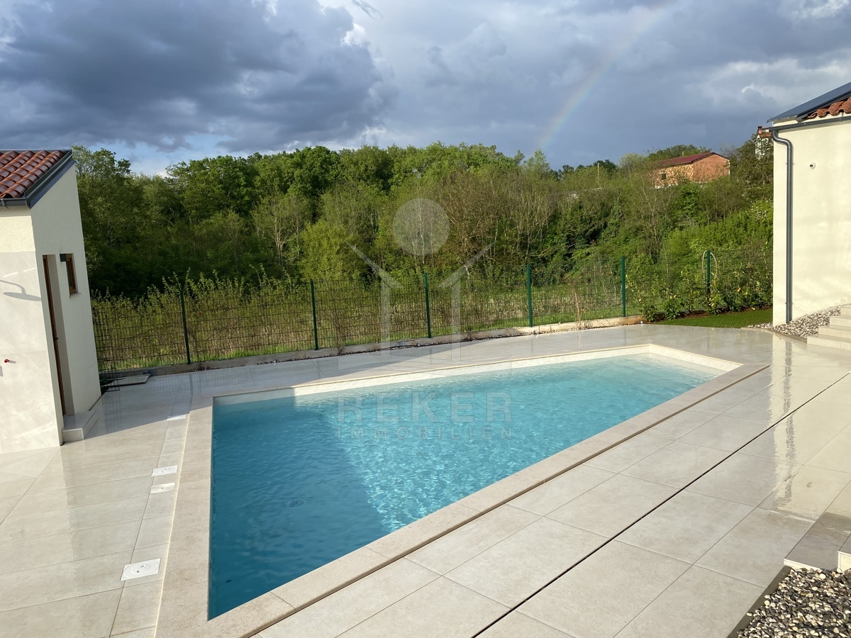 Rund 18 Kilometer von der Küste entfernt, liegt dieses hochwertige Einfamilienhaus eingebettet in die grüne Hügellandschaft bei Tinjan. Die Umgebung ist geprägt von Ruhe, Natur und viel Privatsphäre. Es gibt kaum Nachbarn – dafür Wald, mediterrane Pflanzen und eine wenig befahrene Straße direkt vor dem Grundstück. Wer Natur liebt und Wert auf Ungestörtheit legt, findet hier ein echtes Refugium.