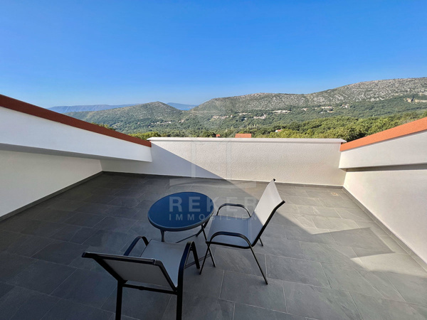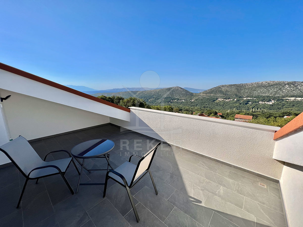 Ein Highlight dieser Wohnung ist die große Dachterrasse mit einem atemberaubenden Panoramablick auf das Meer und das Tal. Hier können Sie entspannen, die Sonne genießen und gesellige Abende beim Grillen verbringen.