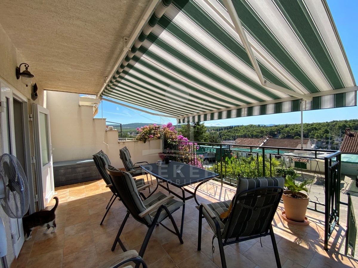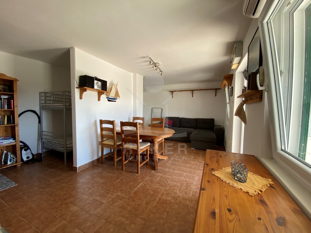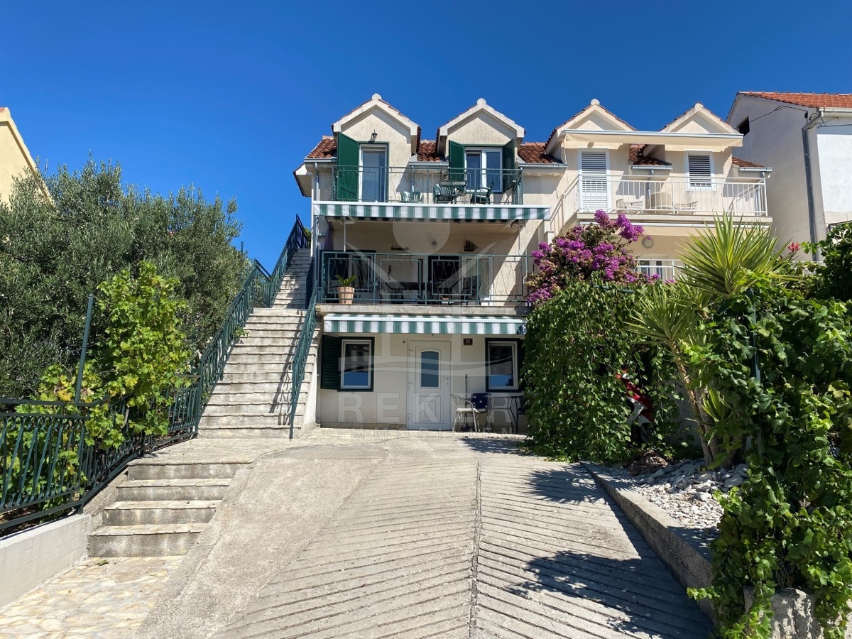 Über eine Außentreppe gelangen Sie in das 1. Obergeschoss mit einem charmanten Zweizimmer-Apartment von 71 m². Der große, überdachte Balkon bietet einen atemberaubenden Blick auf das Meer und die Stadt, während das Apartment über eine Küche, ein Esszimmer, ein Badezimmer sowie 2 Schlafzimmer verfügt. Eines der Schlafzimmer führt auf die ruhige hintere Terrasse mit gepflastertem Innenhof, Außendusche, Steingrill und Abstellraum.