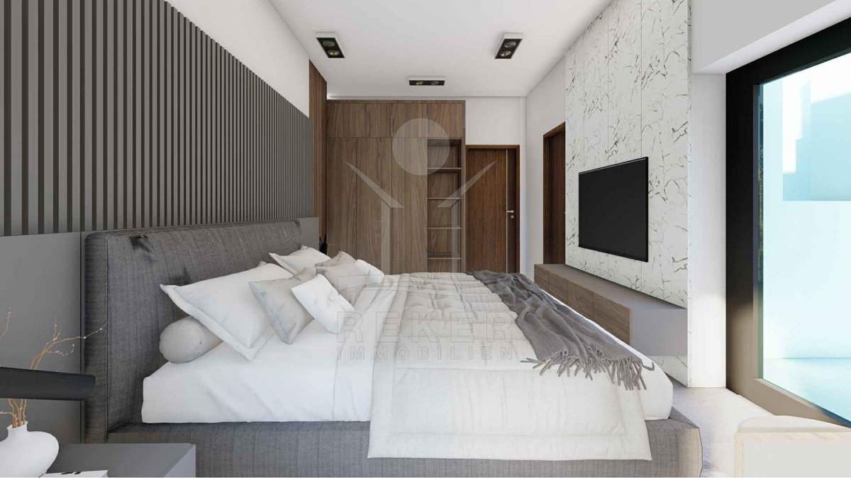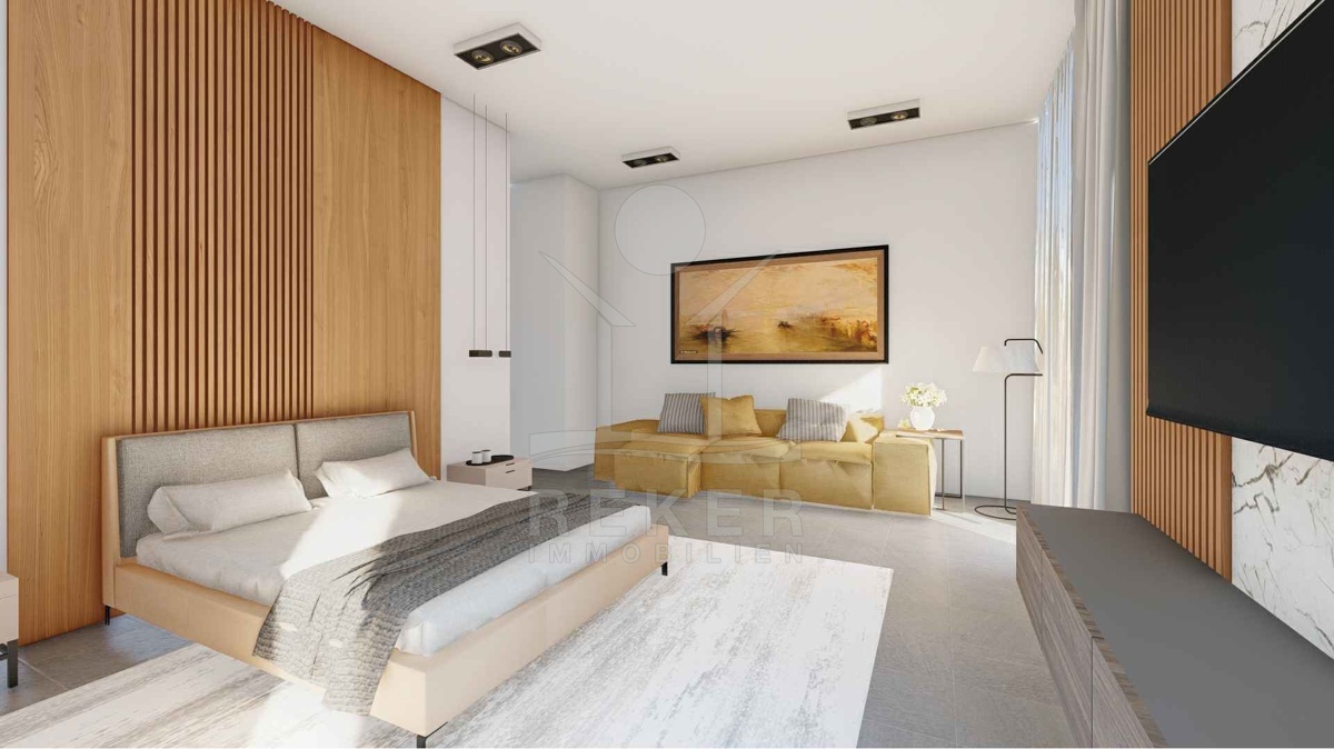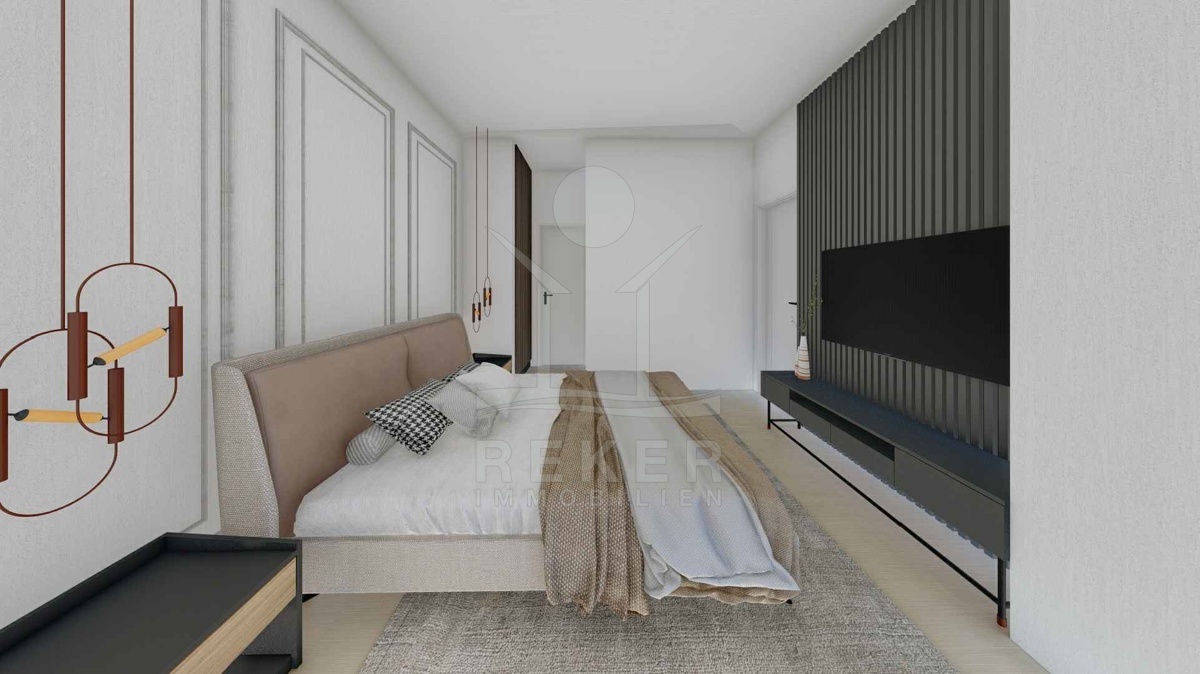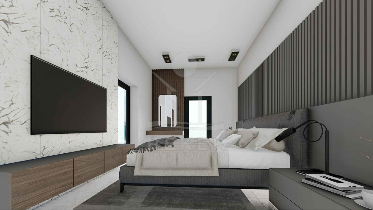 Oben geht’s weiter: drei Schlafzimmer, jedes mit eigenem Bad. Zwei davon haben Zugang zu einem Balkon. Technik? Da ist alles vorbereitet. Heizung per Wärmepumpe. Internet, Alarmanlage, alles da. Fertig ist alles 2026. Und falls Sie mitreden wollen – bei Fliesen und Böden haben Sie ein Wörtchen mitzureden.