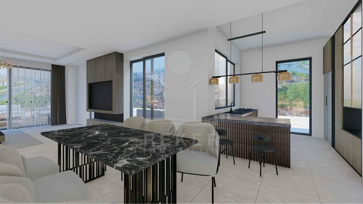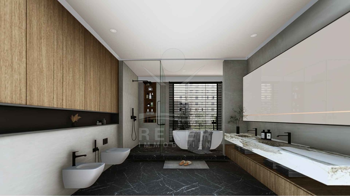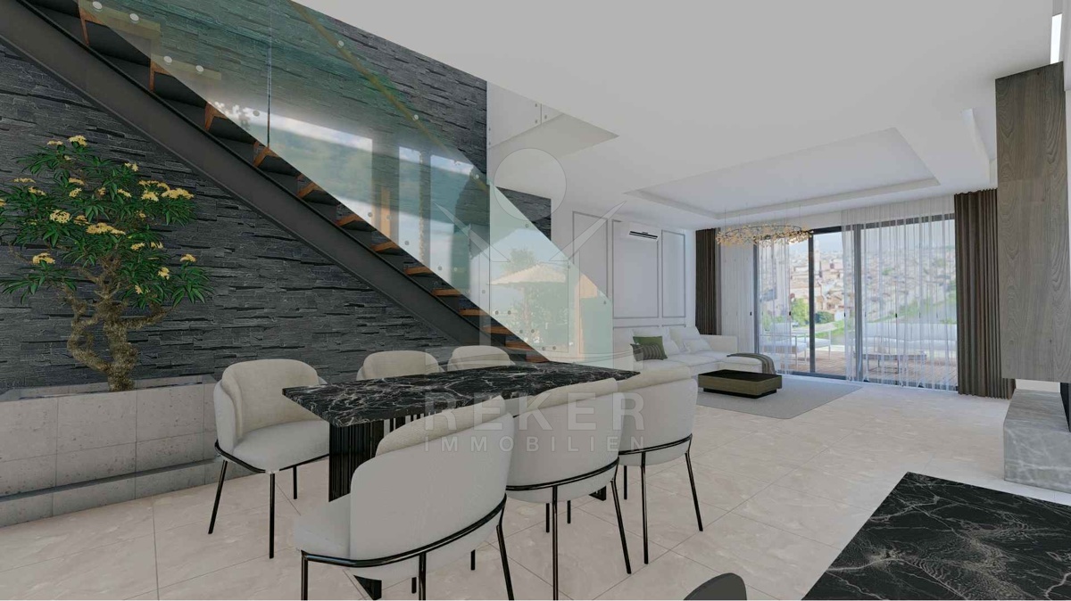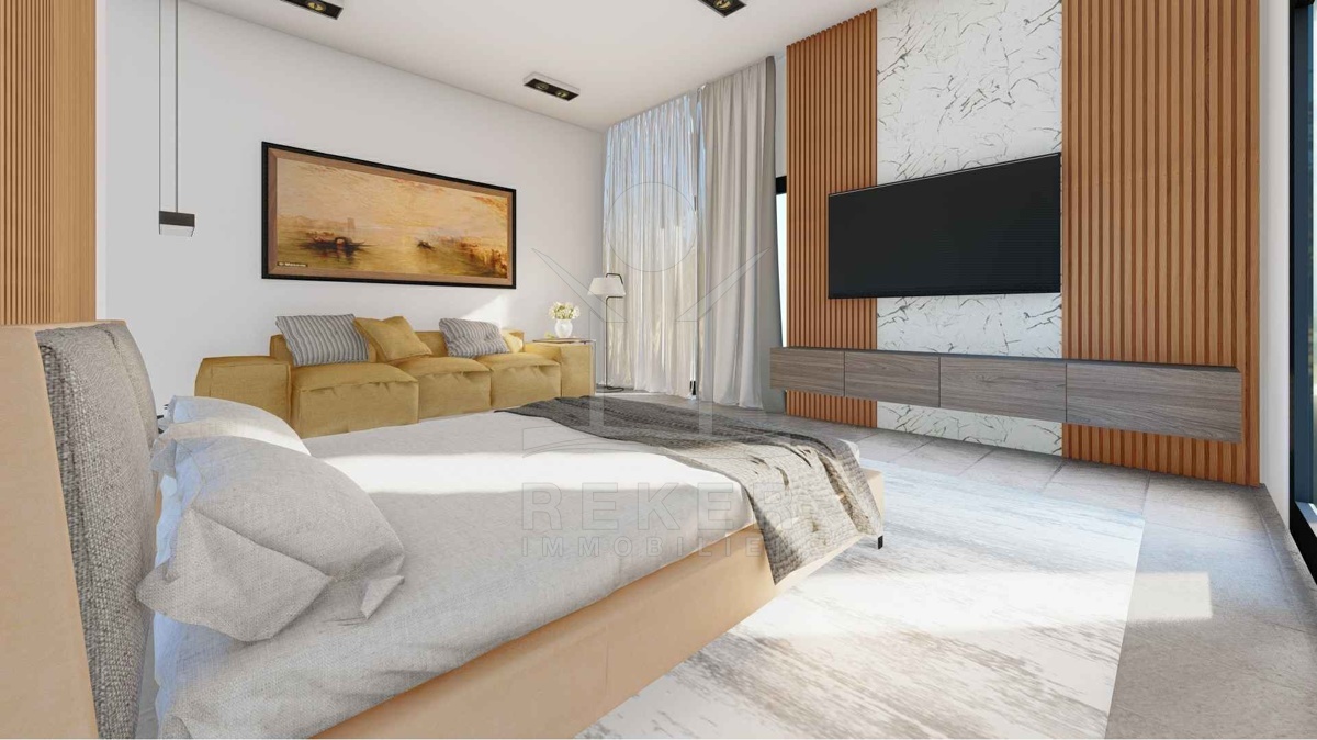 Oben geht’s weiter: drei Schlafzimmer, jedes mit eigenem Bad. Zwei davon haben Zugang zu einem Balkon. Technik? Da ist alles vorbereitet. Heizung per Wärmepumpe. Internet, Alarmanlage, alles da. Fertig ist alles 2026. Und falls Sie mitreden wollen – bei Fliesen und Böden haben Sie ein Wörtchen mitzureden.