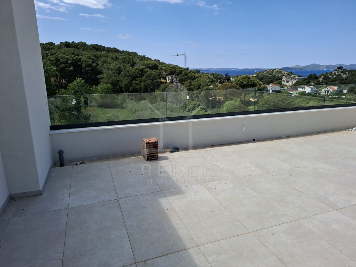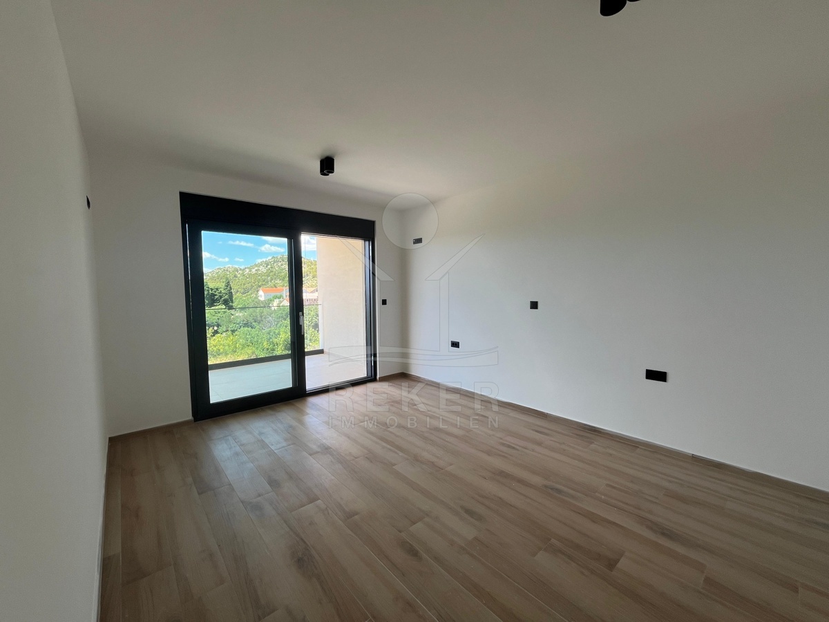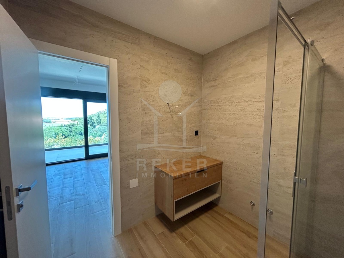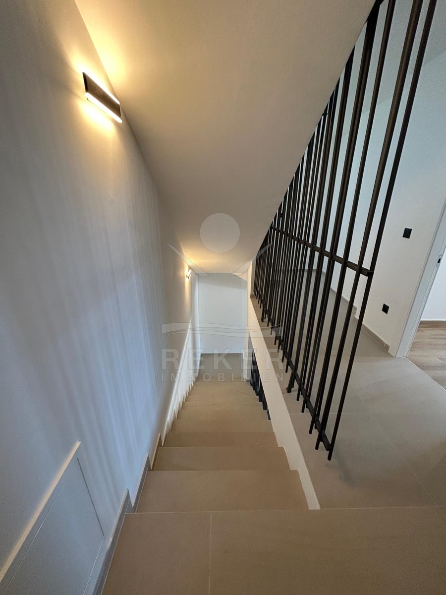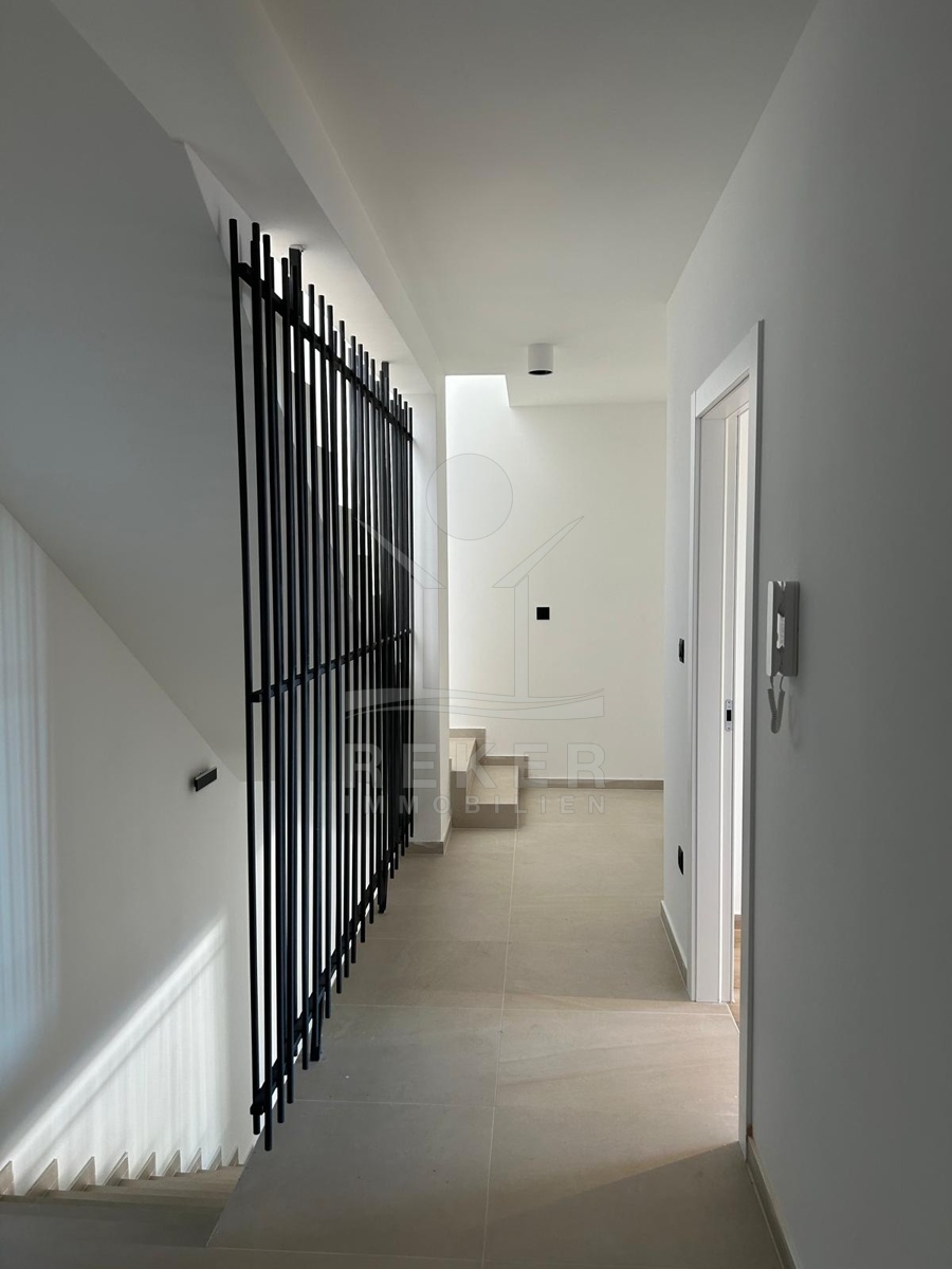 Mit 265 m² Wohnfläche auf drei Etagen bietet das Haus reichlich Platz. Im Erdgeschoss finden Sie einen hellen Wohn- und Essbereich mit moderner Küche, ein Schlafzimmer mit Bad en suite, ein Gäste-WC sowie einen Technik- und Abstellraum. Im Obergeschoss gibt es drei weitere Schlafzimmer, alle mit eigenem Bad und privater Terrasse. Auch hier öffnet sich Ihnen der Blick aufs Meer. Hochwertige Miele-Geräte, maßgefertigte Möbel und stimmungsvolle Beleuchtung von Prggin setzen klare Akzente in Sachen Wohnqualität.