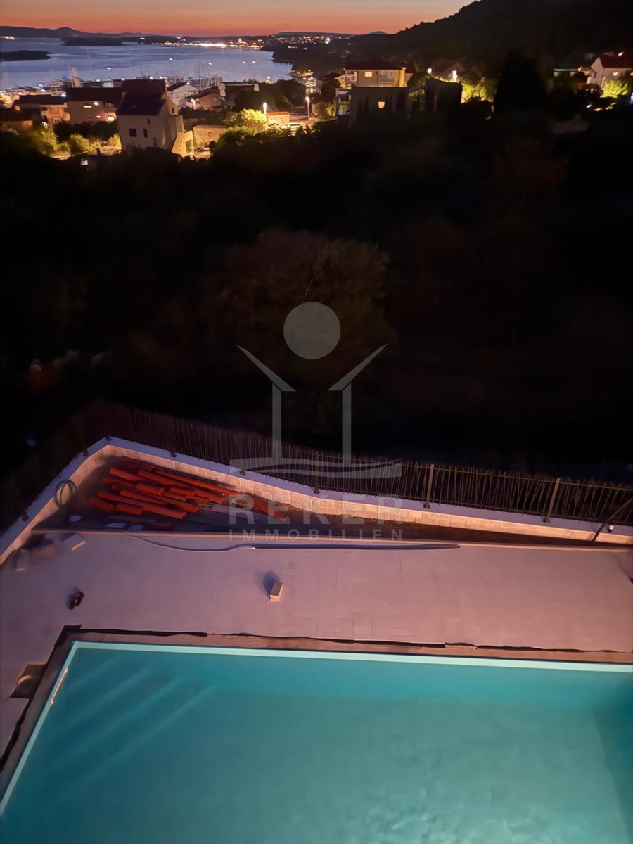 Das Grundstück umfasst rund 300 m² Gartenfläche mit gepflegtem Außenbereich. Vom Erdgeschoss führt der Weg direkt auf die überdachte Terrasse, die an den 8 × 4 m großen Pool mit Sonnendeck anschließt. Ein echtes Highlight ist die Dachterrasse: Whirlpool, Lounge-Zone, viel Privatsphäre und ein weiter Blick aufs Meer.