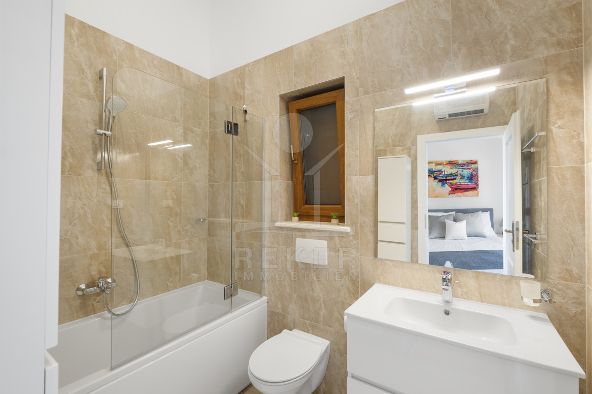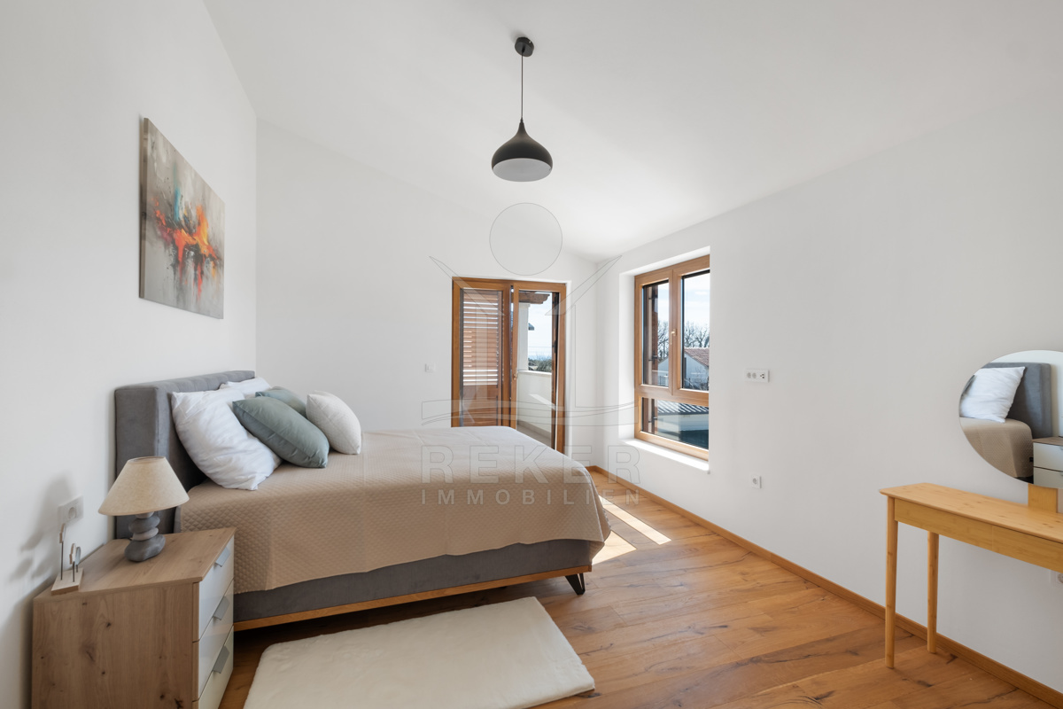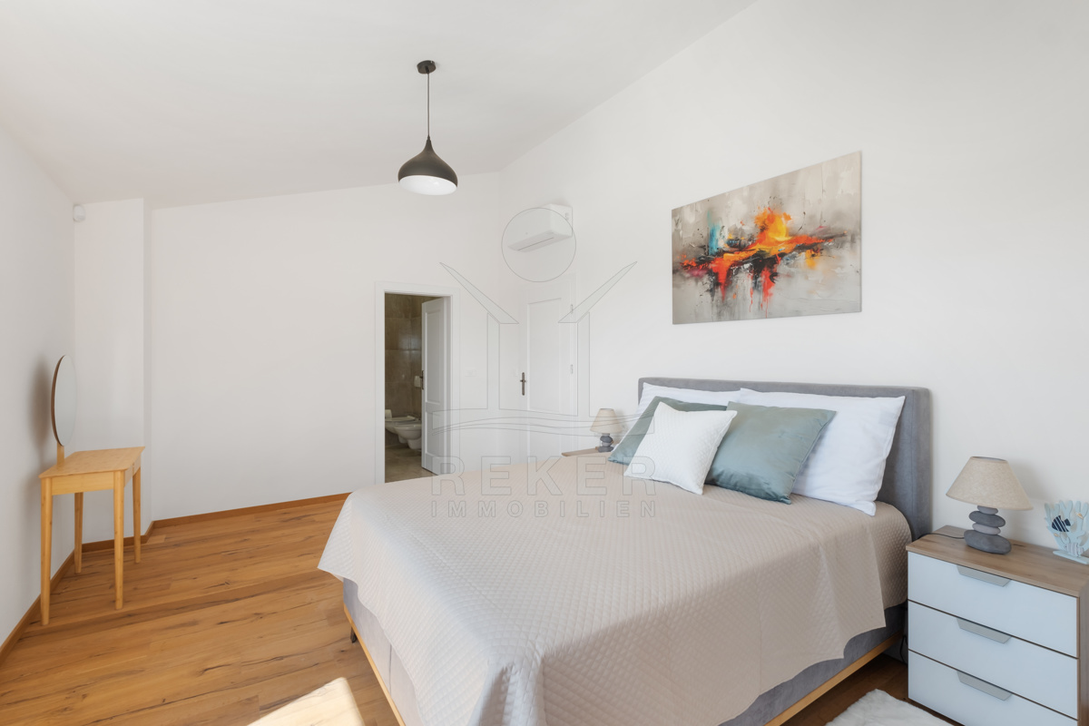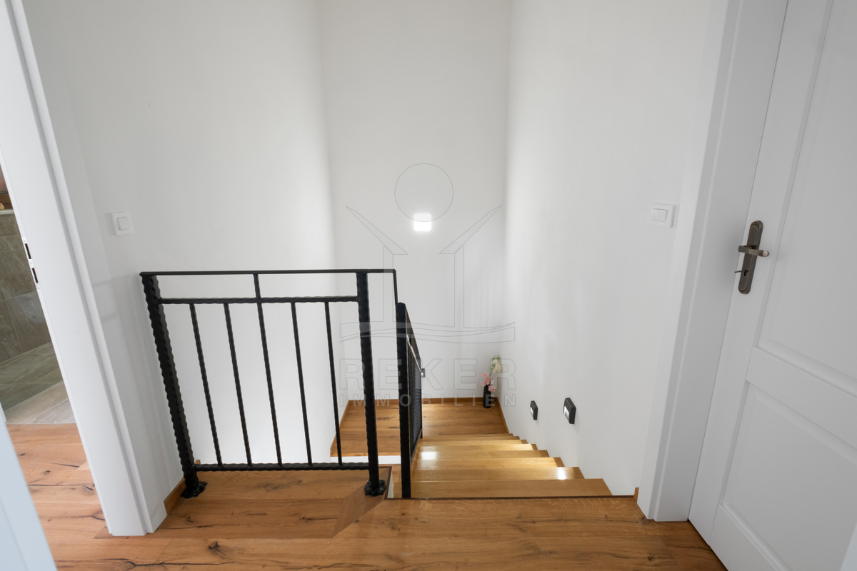Unten: großer Wohnbereich mit Essplatz, separate Küche, Bad, zwei Eingänge. Oben: drei Schlafzimmer, jedes mit eigenem Bad. Ein Balkon gehört dazu. Fensterrahmen aus PVC, Mückennetze, doppelt verglaste Fenster – gut durchdacht. Der Boden: Parkett und Keramikfliesen. Die Räume sind hell. Baujahr 2023. Die Möbel sind inklusive.