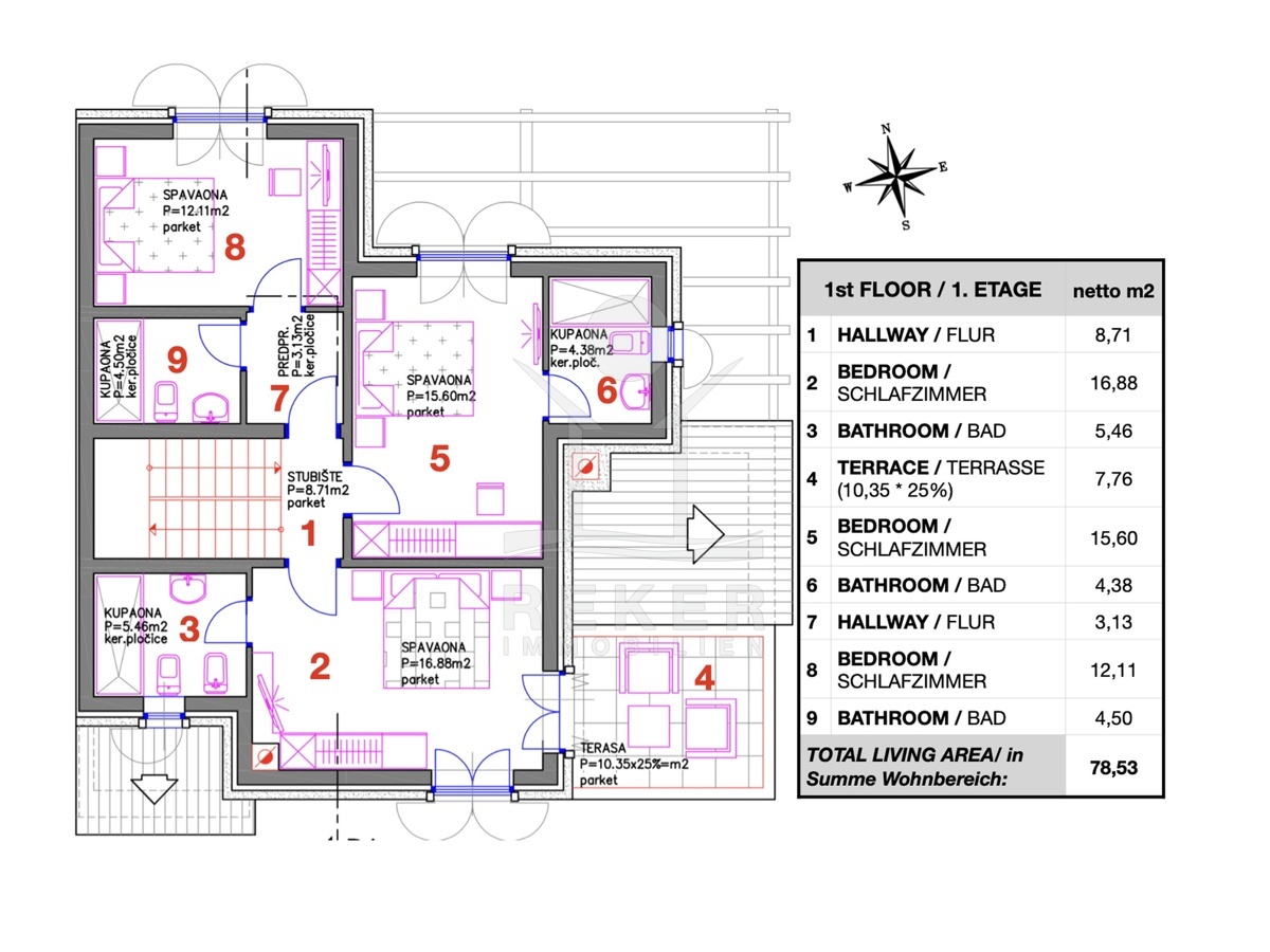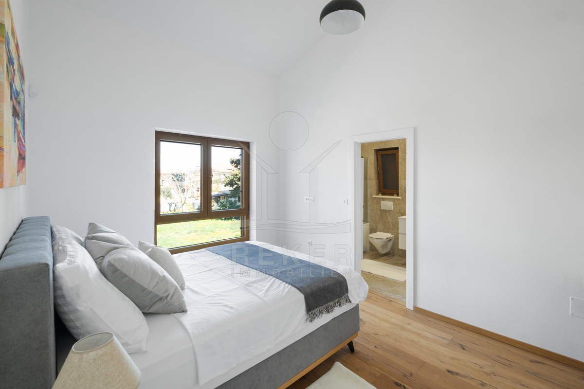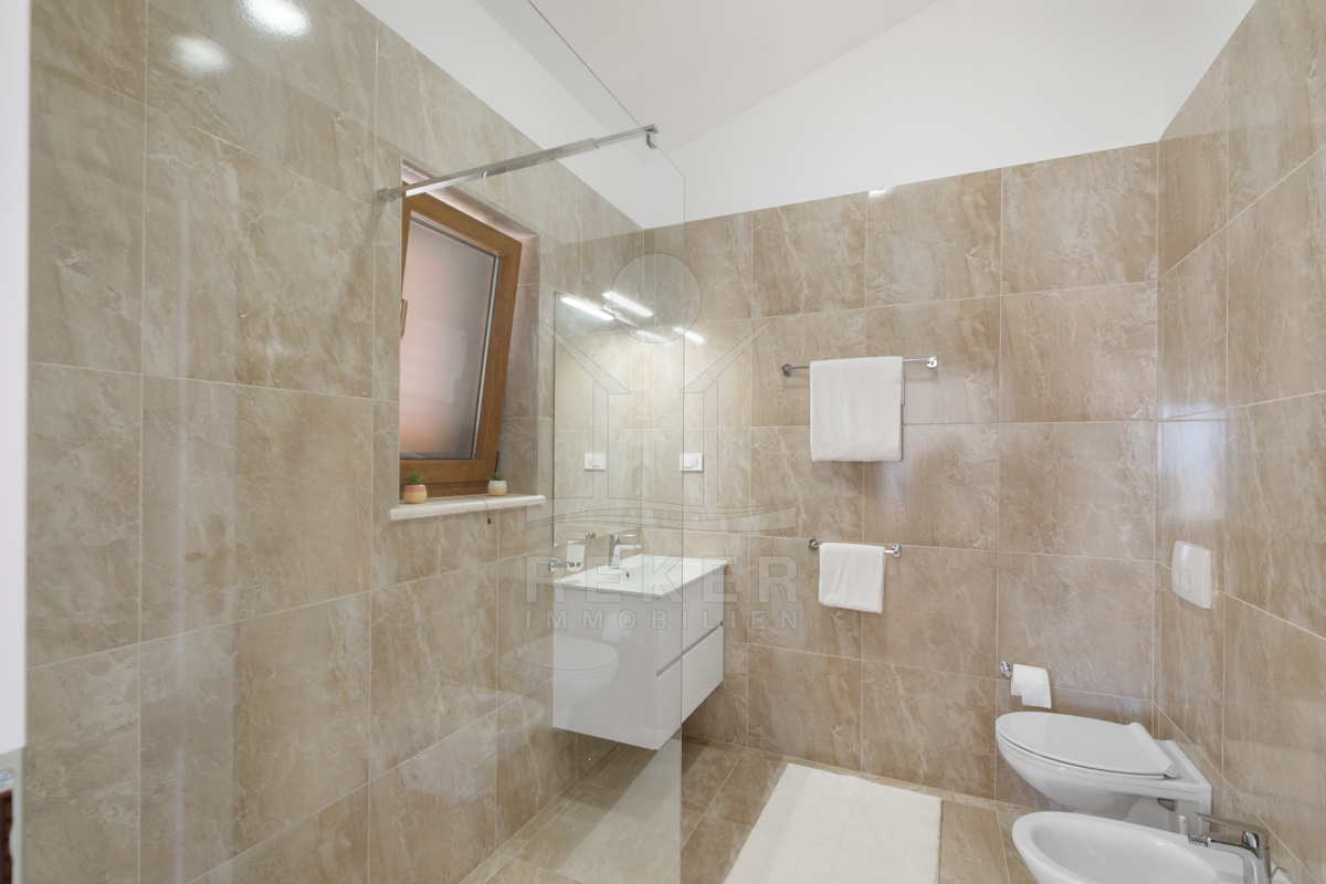 Unten: großer Wohnbereich mit Essplatz, separate Küche, Bad, zwei Eingänge. Oben: drei Schlafzimmer, jedes mit eigenem Bad. Ein Balkon gehört dazu. Fensterrahmen aus PVC, Mückennetze, doppelt verglaste Fenster – gut durchdacht. Der Boden: Parkett und Keramikfliesen. Die Räume sind hell. Baujahr 2023. Die Möbel sind inklusive.