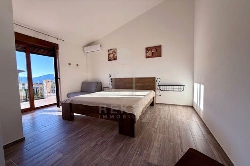 Im Erdgeschoss befindet sich ein großzügiger Wohnbereich mit offener Küche und Essplatz. Ergänzt wird die Etage durch ein Schlafzimmer und ein stilvolles Badezimmer. Im Obergeschoss erwarten Sie drei weitere Schlafzimmer und zwei Badezimmer. Zwei der Zimmer öffnen sich zu einer Terrasse mit Meerblick, der ideale Ort für ruhige Abende mit Aussicht.