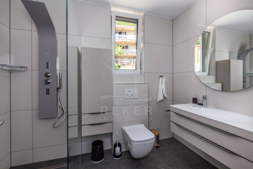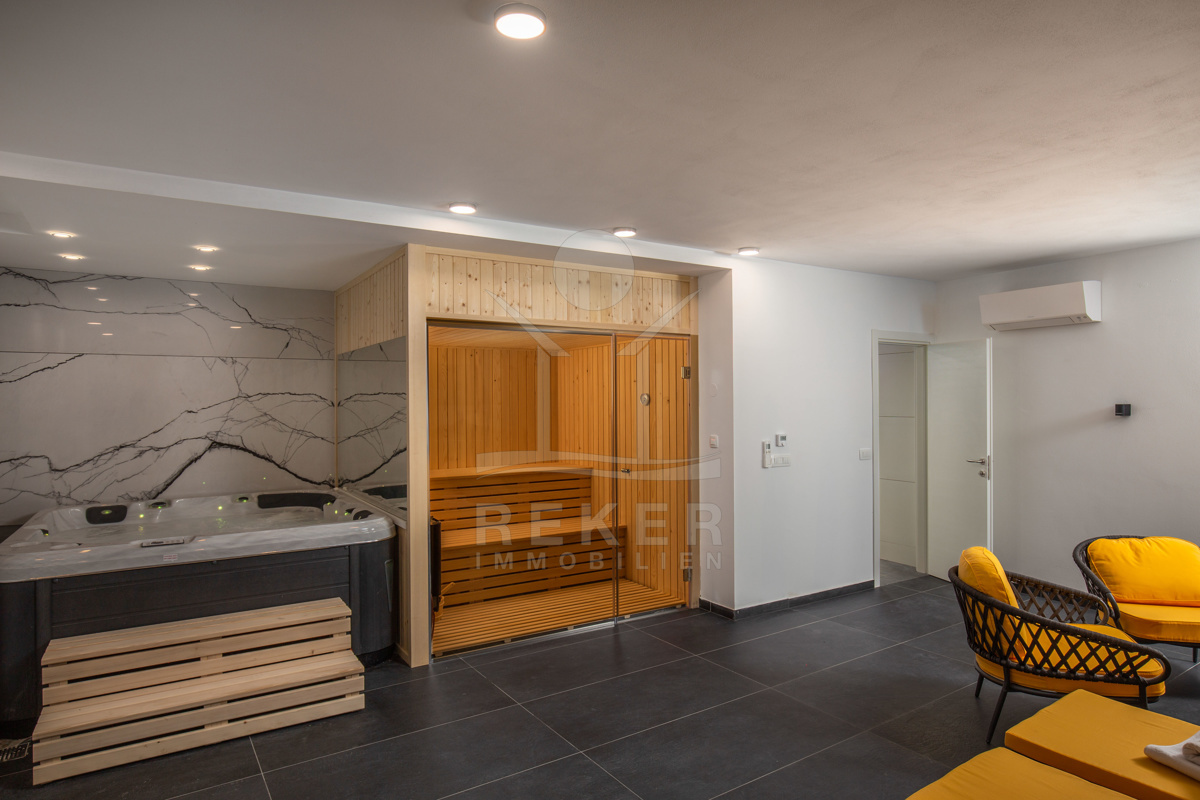 Lassen Sie sich im Unterschoss vom hauseigenen Wellnessbereich in eine perfekte Entspannung führen! Eine Sauna und ein Whirlpool werden Ihnen dabei helfen. Komplettiert wird das Untergeschoss durch ein Gäste-WC, eine Dusche und eine Waschküche.