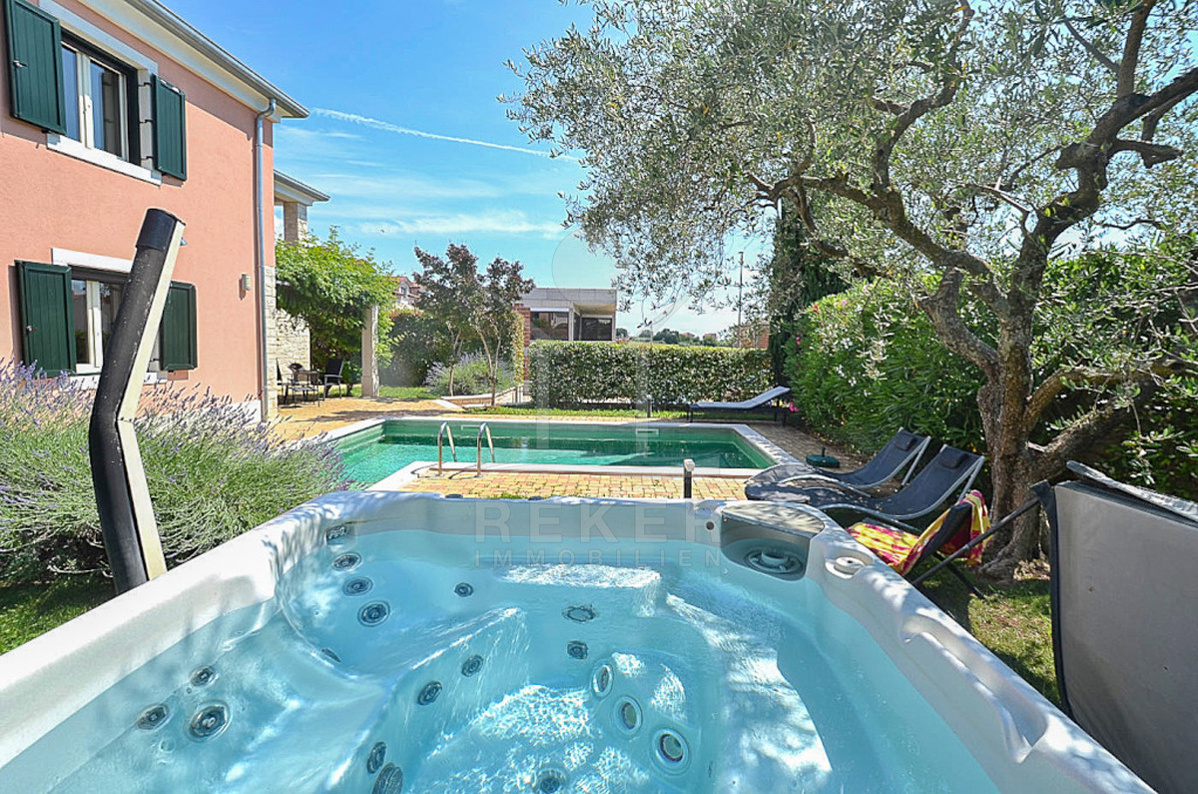 Der Außenbereich ist ein echtes Highlight: Pool, Jacuzzi, Grill, mediterrane Pflanzen. Alles da, was einen Sommertag perfekt macht. Im Garten gibt es mehrere geschützte Rückzugsorte – vom Loungebereich unter der Pergola bis zur Liegefläche unter dem Olivenbaum. Eine separate Taverne mit Grill und Sommerküche lädt zum gemeinsamen Kochen und Feiern ein. Von der großen Terrasse im Erdgeschoss haben Sie alles im Blick: Garten, Pool, Abendstimmung.