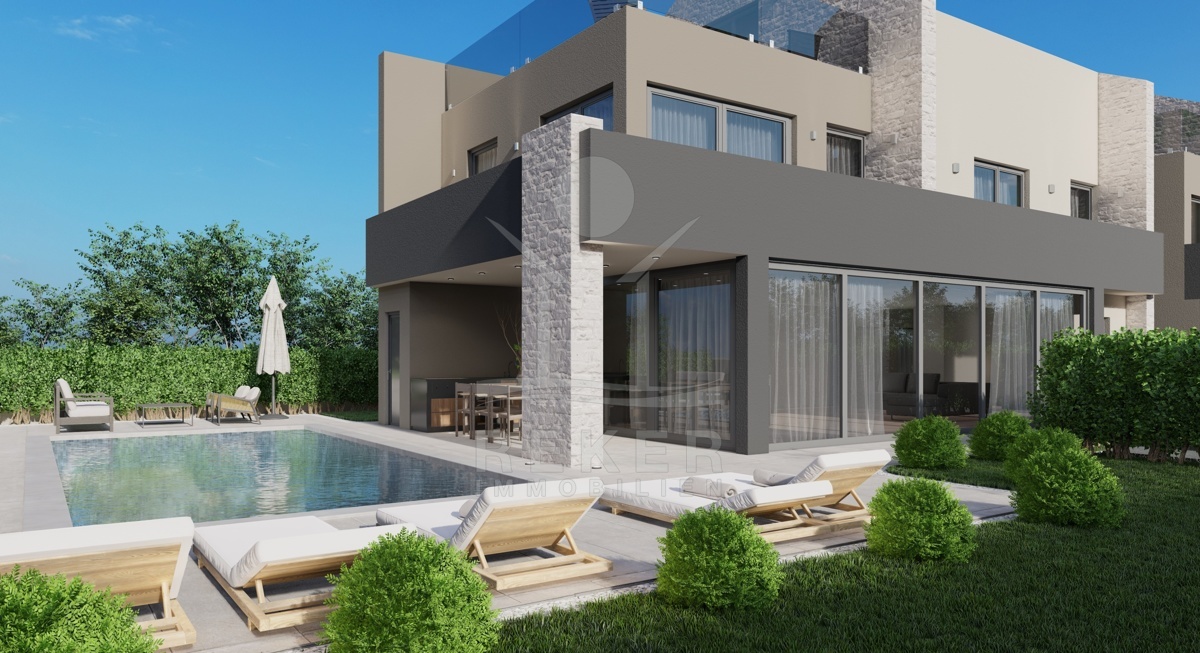 Die schöne Immobilie erstreckt sich über ein Grundstück von 485,00 m² und verfügt über einen malerischen Garten mit einer Außenküche und einem Swimmingpool. Die Villa selbst ist ein moderner Neubau aus dem Jahr 2023 mit einer Wohnfläche von 215 m2, die sich auf drei Etagen erstreckt. Diese Villa bietet eine fabelhafte, überdachte Terrasse mit Sonnenliegen und einer Außenküche.