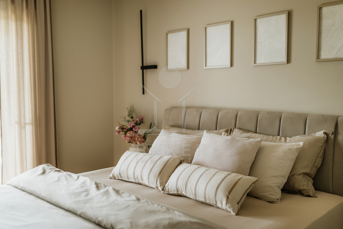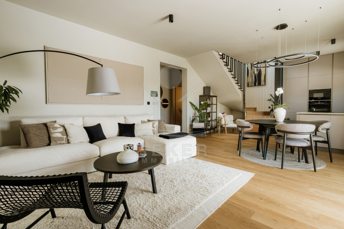 Im Erdgeschoss wohnen Sie in einem hellen Raum mit Kamin, offener Küche und Essbereich. Ein Schlafzimmer und ein Badezimmer befinden sich ebenfalls hier. Praktisch für Gäste oder für ebenerdiges Wohnen. Im Obergeschoss warten zwei weitere Schlafzimmer, jeweils mit eigenem Bad. Beide teilen sich einen 16 m² großen Balkon mit Blick in die Umgebung.
