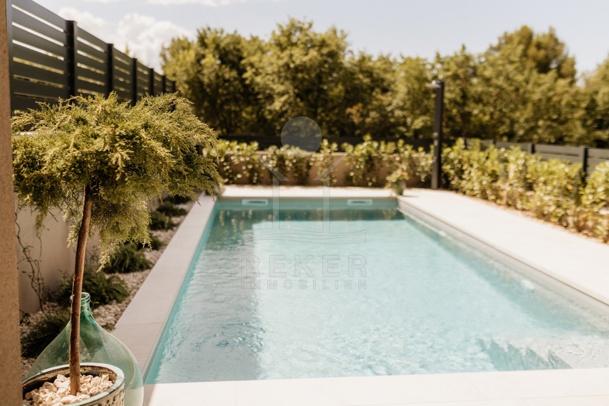 Das 350 m² große Grundstück ist sorgfältig angelegt. Rasenflächen, ein Olivenbaum und Hecken schaffen eine grüne Oase. Mittelpunkt ist der private Pool mit Sonnenterrasse. Hier entspannen Sie oder verbringen Zeit mit Familie und Freunden. Die überdachte Terrasse von 19 m² bietet Platz für einen großen Esstisch. Ergänzt wird das Angebot durch einen Grillbereich für gesellige Abende im Freien.