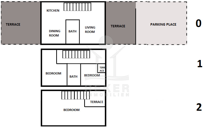 Im Erdgeschoss: eine offene Küche mit Essbereich und Wohnraum. Alles in einem. Offen, hell, klimatisiert. Plus ein Badezimmer – praktisch, wenn Gäste da sind. Im Obergeschoss warten zwei Schlafzimmer und ein weiteres Bad. Eines der Zimmer hat einen eigenen Balkon. Perfekt für die erste Tasse Kaffee am Morgen. Ganz oben im Dachgeschoss: ein drittes Schlafzimmer mit Abstellraum. Und noch ein schöner Balkon obendrauf. Mehr Privatsphäre geht kaum.