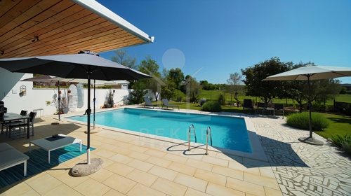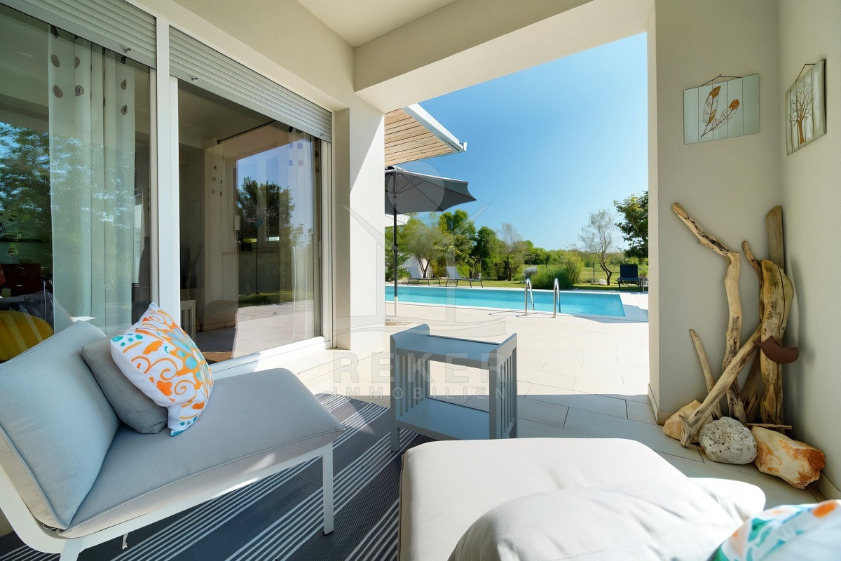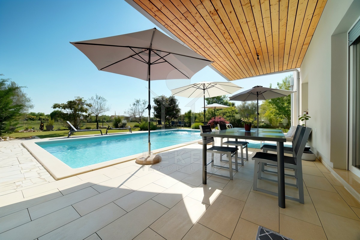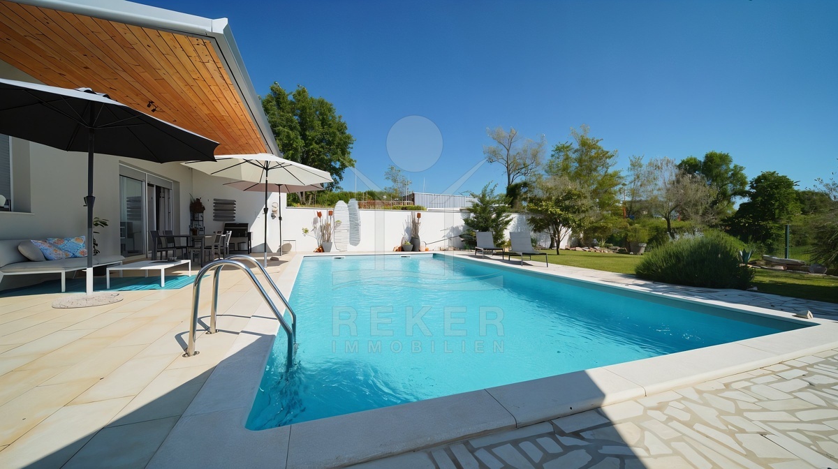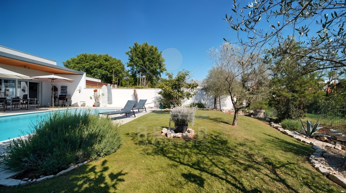 Das Grundstück umfasst 823 m² und wirkt wie eine mediterrane Oase. Oliven-, Feigen- und Kirschbäume, Kräuter und Zypressen geben dem Garten Charakter. Ein automatisches Bewässerungssystem erleichtert die Pflege. Mittelpunkt ist der 50 m² große Pool mit Sonnenterrasse, Dusche und Sonnenschirmen. Ergänzt wird er durch eine überdachte Terrasse, die Platz für Mahlzeiten und entspannte Stunden im Grünen bietet. Südwest-Ausrichtung, Pool und Garten mit mediterranem Flair. Dieses Haus vereint modernes Wohnen und Urlaubsgefühl.