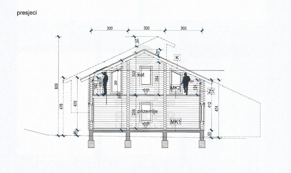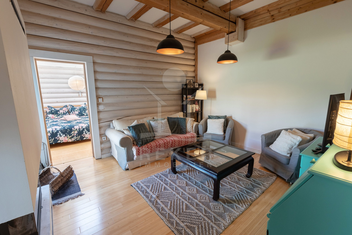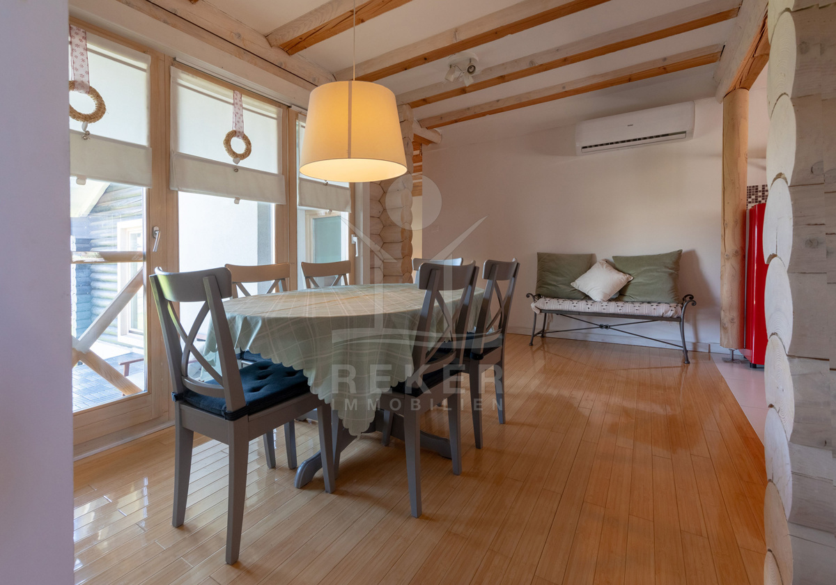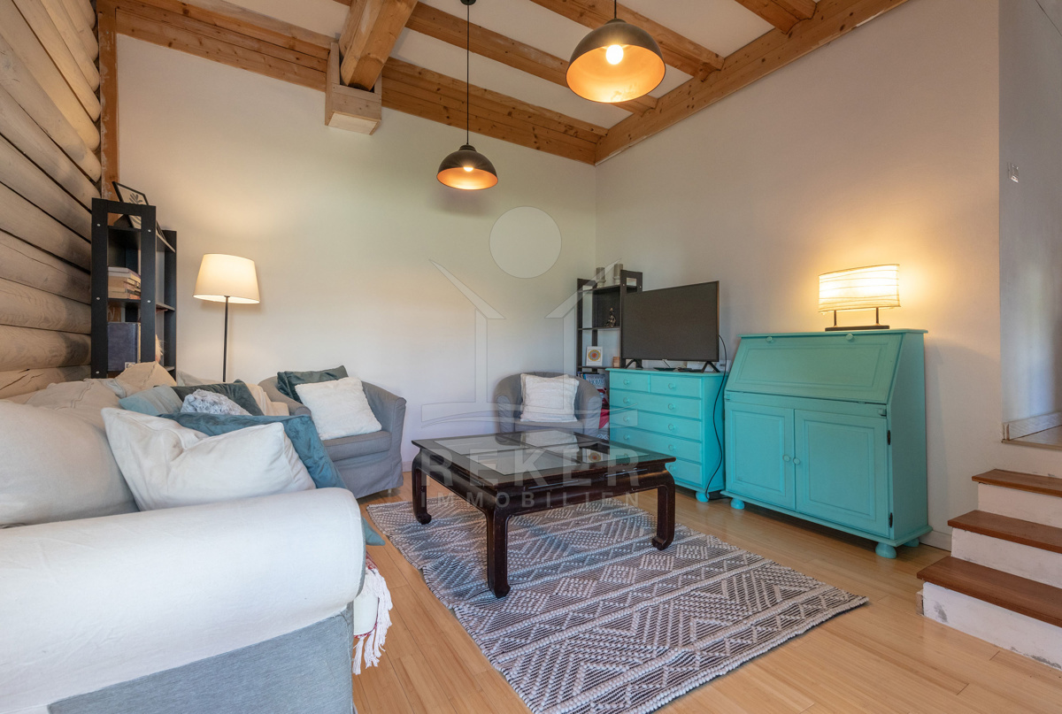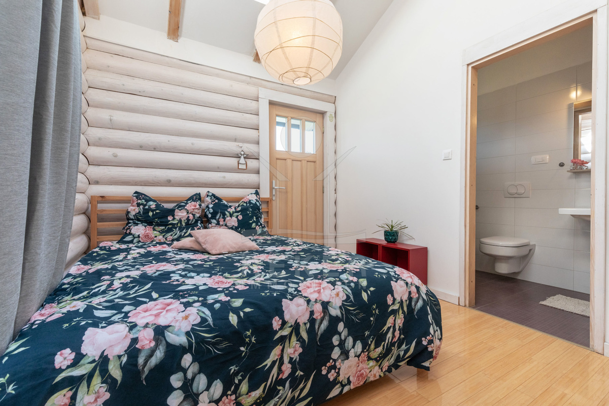 Das Obergeschoss, ein Dachgeschoss mit einer Grundfläche von 68 m2, besteht aus massiven Baumstämmen mit 23 cm Durchmesser. Derzeit in einem baufälligen Zustand, bietet es bereits installierte Installationen für eine Küche, ein Esszimmer, ein Wohnzimmer, zwei Schlafzimmer, eine Garderobe, eine Speisekammer und zwei Terrassen. Eine mögliche Galerie schafft zusätzlichen Raum für kreative Ideen und individuelle Gestaltung.