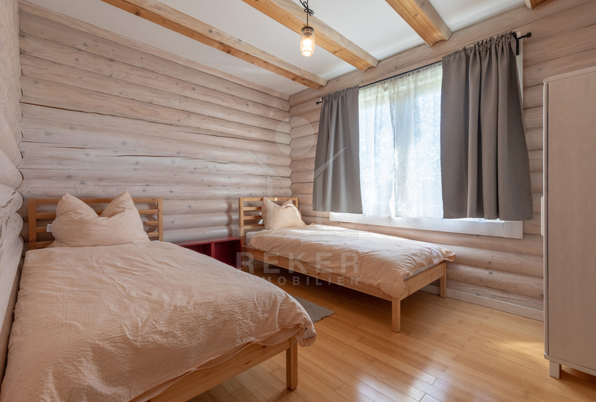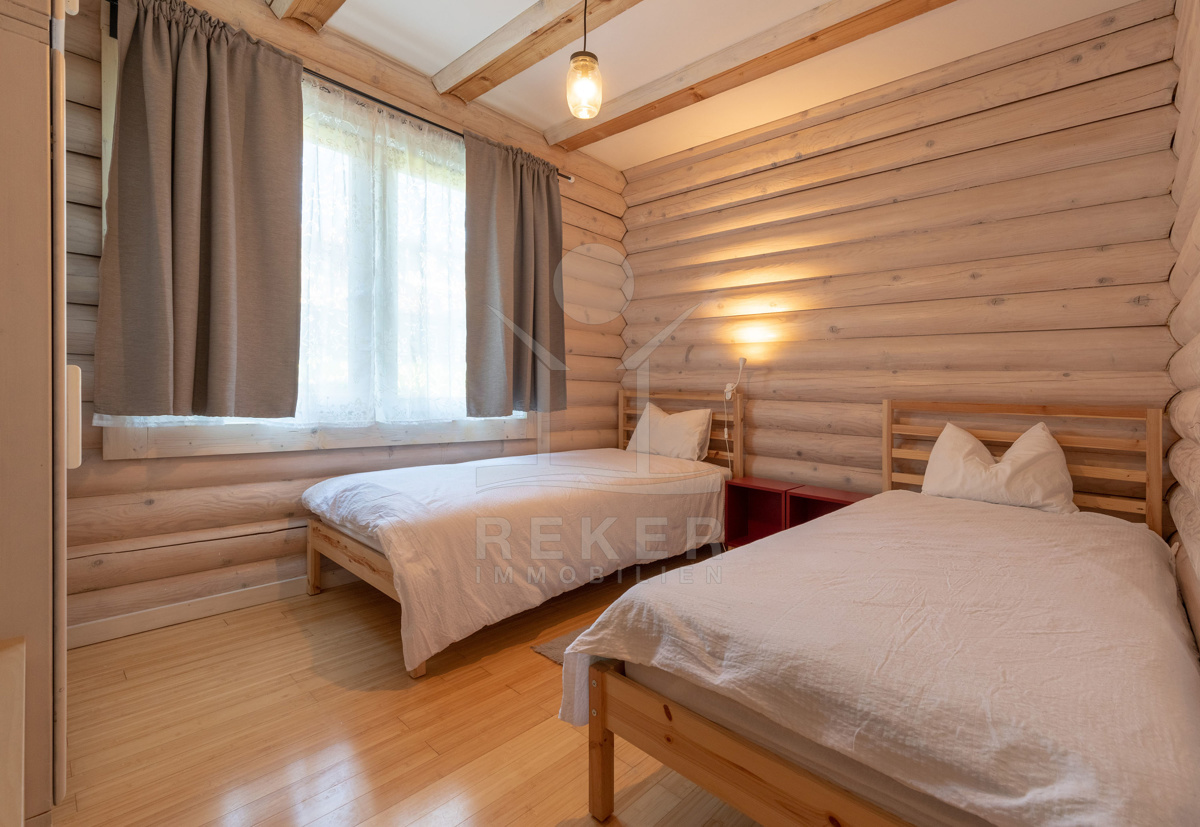 Das modern und liebevoll eingerichtete Holzhaus begeistert mit vielen schönen Details und Farbakzenten. Im Erdgeschoss erwartet Sie ein Eingangsbereich mit Treppe, ein Esszimmer, eine Küche, ein Wohnzimmer, drei Schlafzimmer, zwei Badezimmer, eine separate Toilette und zwei Terrassen.