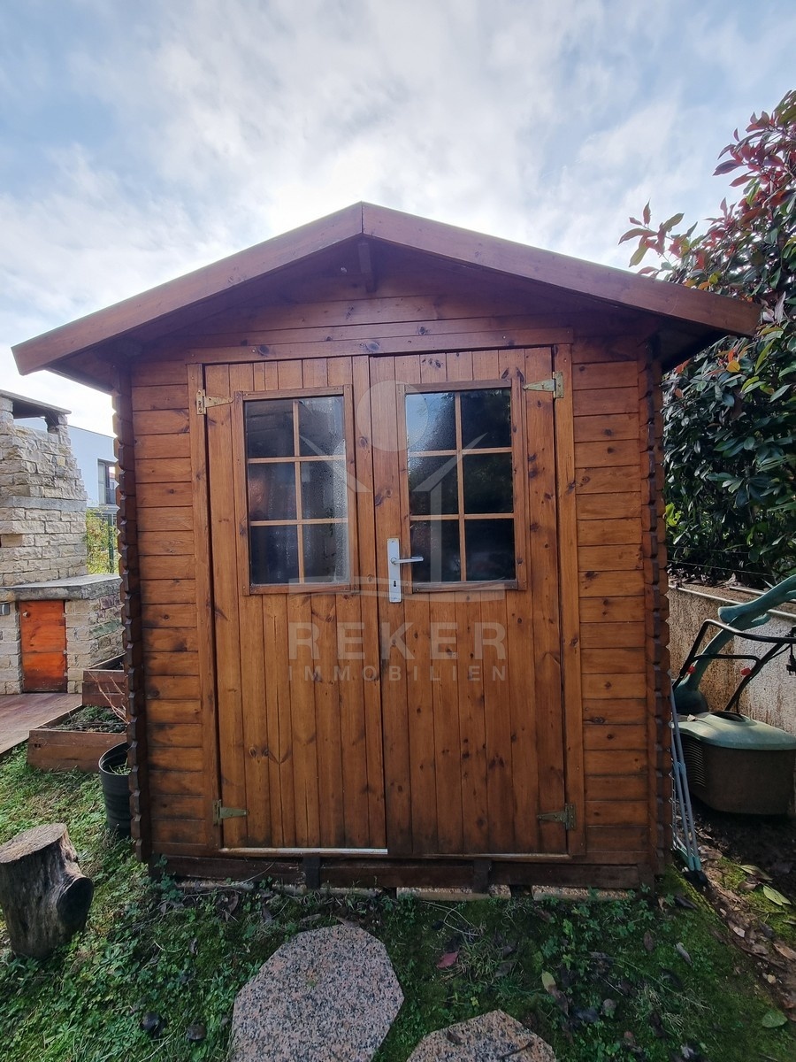 Die geschlossene Terrasse im rustikalen Stil schafft ein gemütliches Ambiente für gemeinsame Stunden mit Familie. Im Garten steht außerdem ein Steingrill bereit, der perfekt für gesellige Grillabende genutzt werden kann.