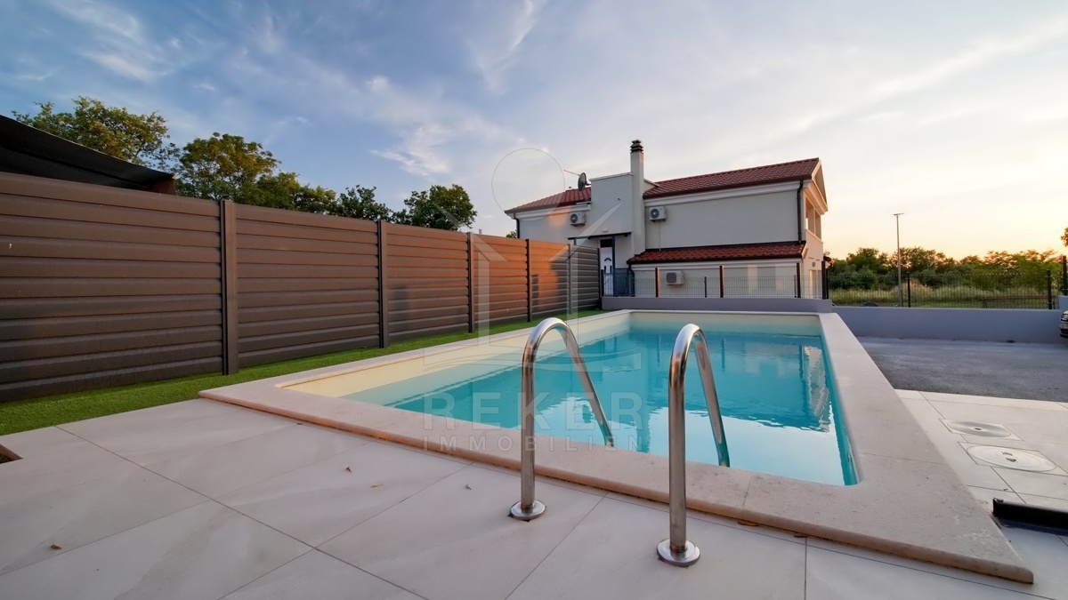 Zwischen Umag und dem Meer liegt das kleine Dorf Babići. Umgeben von Feldern, Wiesen und Reben. Hier steht dieses moderne Haus mit Pool. Ein Ort für alle, die Ruhe suchen … und trotzdem schnell am Strand sein möchten. Nur 1,6 Kilometer bis zum Wasser. Das Haus liegt am westlichen Rand der kleinen Siedlung. Von oben reicht der Blick bis zum Meer.