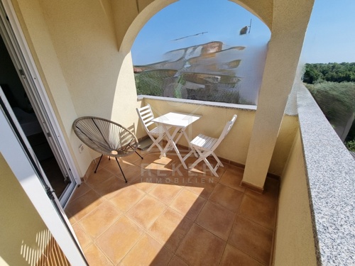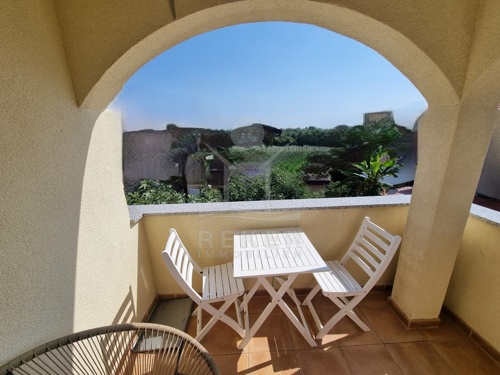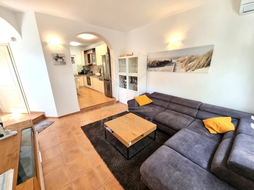 Die Wohnfläche beträgt 85,9 m² und verteilt sich auf zwei Ebenen. Im Erdgeschoss finden Sie eine helle Eingangshalle, ein großzügiges Wohnzimmer mit Zugang zur Terrasse, eine Küche mit Essbereich und ein Gäste-WC. Im Obergeschoss warten zwei Schlafzimmer, eines davon mit Balkon, sowie ein Badezimmer mit Fußbodenheizung. Drei Klimaanlagen, PVC-Fenster mit Moskitonetzen und helle Fliesen sorgen für angenehmes Wohnen.