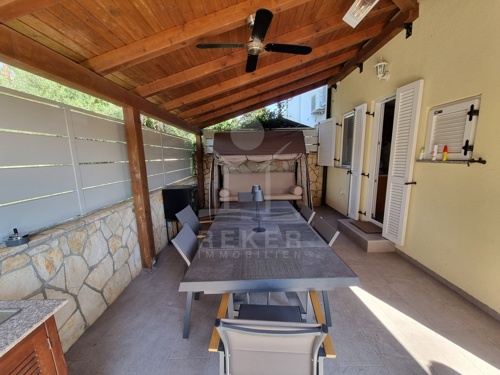 Das Grundstück mit 142,5 m² ist liebevoll angelegt. Ein Oliven- und ein Feigenbaum schaffen mediterranes Flair. Dazu eine sonnige Sitzecke und eine überdachte Terrasse mit Sommerküche, gut geeignet für Mahlzeiten im Freien. Für erholsame Momente steht im Garten ein großer Jacuzzi bereit, abgeschirmt und mit viel Privatsphäre. Ein kleines Gartenhaus sorgt für Stauraum.
