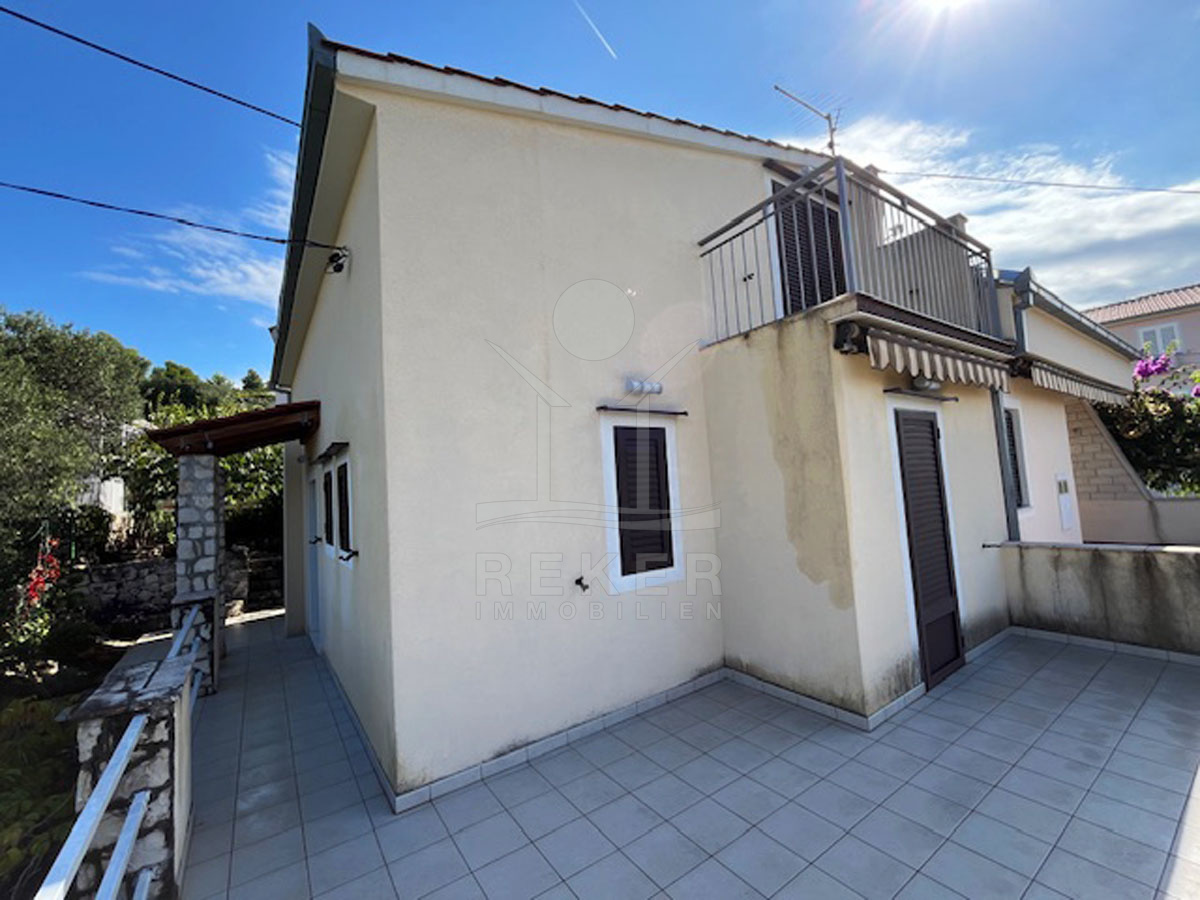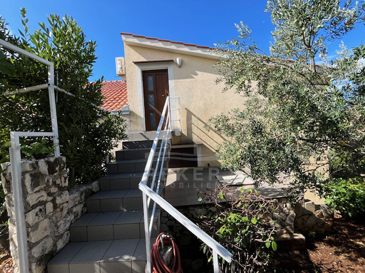 Die Haushälfte befindet sich auf der malerischen Südseite der Insel Čiovo, nur 150 Meter vom glasklaren Meer entfernt. Die unmittelbare Umgebung ist von einer üppigen Vegetation geprägt, mit dichten Pinienwäldern und Olivenhainen, die ein idyllisches Ambiente schaffen. Das Ortszentrum ist lediglich 700 Meter entfernt und bietet Ihnen Zugang zu gemütlichen Cafés, Restaurants und kleinen Geschäften, die das lokale Flair widerspiegeln. Die Insel Čiovo, die durch eine Brücke mit der Altstadt von Trogir verbunden ist, ist berühmt für ihre natürlichen Schönheiten und das reiche kulturelle Erbe. Hier können Sie in zauberhaften Buchten baden oder schnorcheln und die entspannte Atmosphäre genießen. Die beliebte Wallfahrtskirche Prizidnica, eine architektonische Besonderheit, ist nur einen Fußweg entfernt und lädt zu Erkundungen ein.