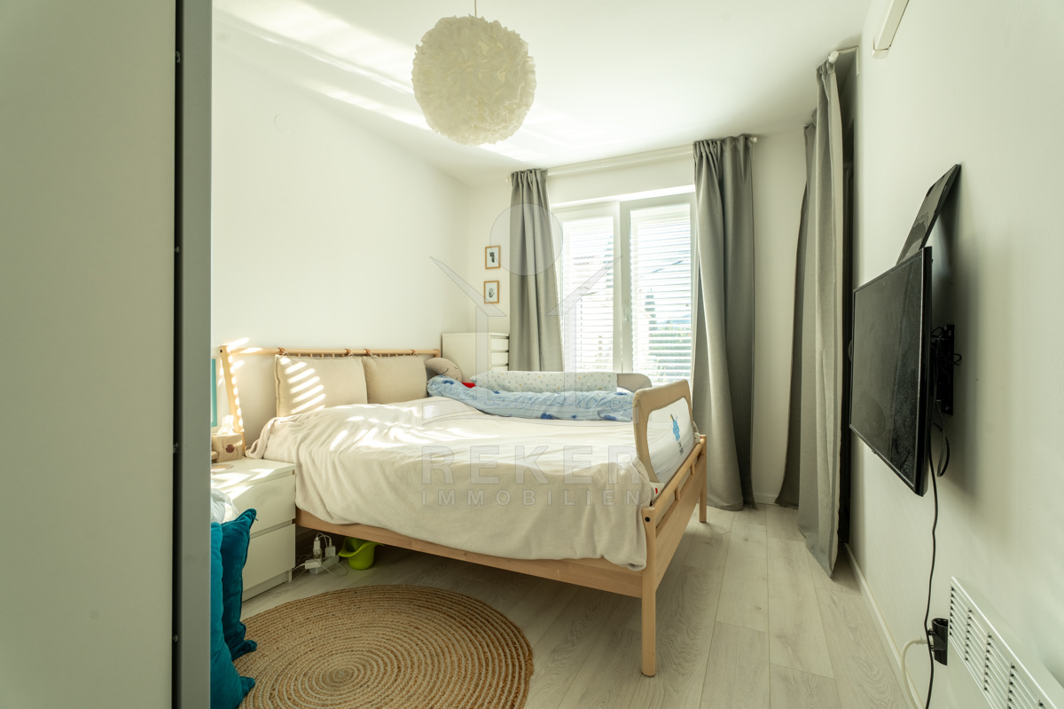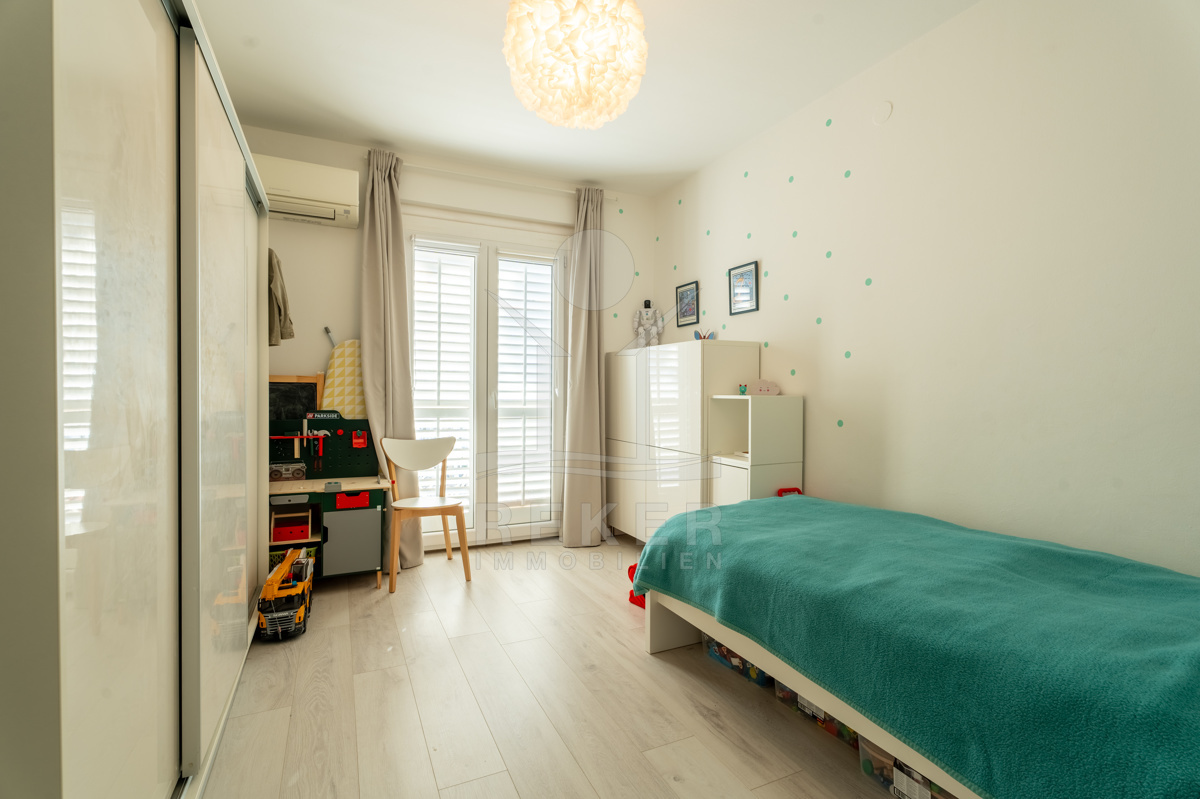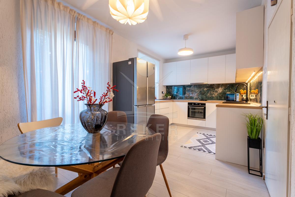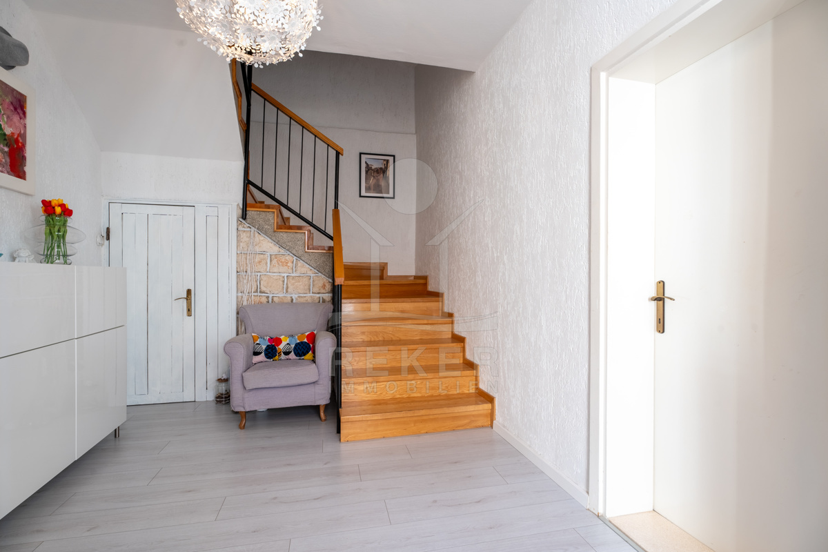 Die mit Klimaanlage ausgestattete und möblierte Wohnung bietet vielseitige Nutzungsmöglichkeiten. Im Untergeschoss dient der ca. 38 m² große Keller bereits als Arbeitsraum, der zusätzliche Funktionalität bietet. Im Erdgeschoss befindet sich ein Eingangsbereich, ein offener Wohn-, Ess- und Küchenbereich.