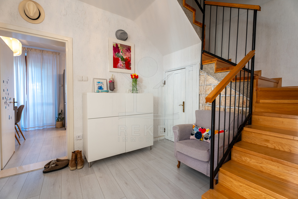 Das Obergeschoss und der zweite Stock bilden eine schöne Zweizimmerwohnung mit insgesamt 135 m² Wohnfläche. Von hier aus gelangen Sie auf eine Terrasse mit Blick auf die Umgebung.