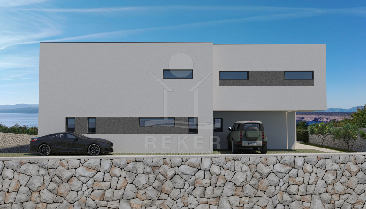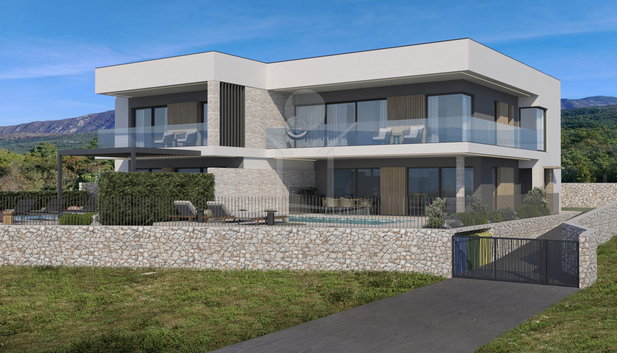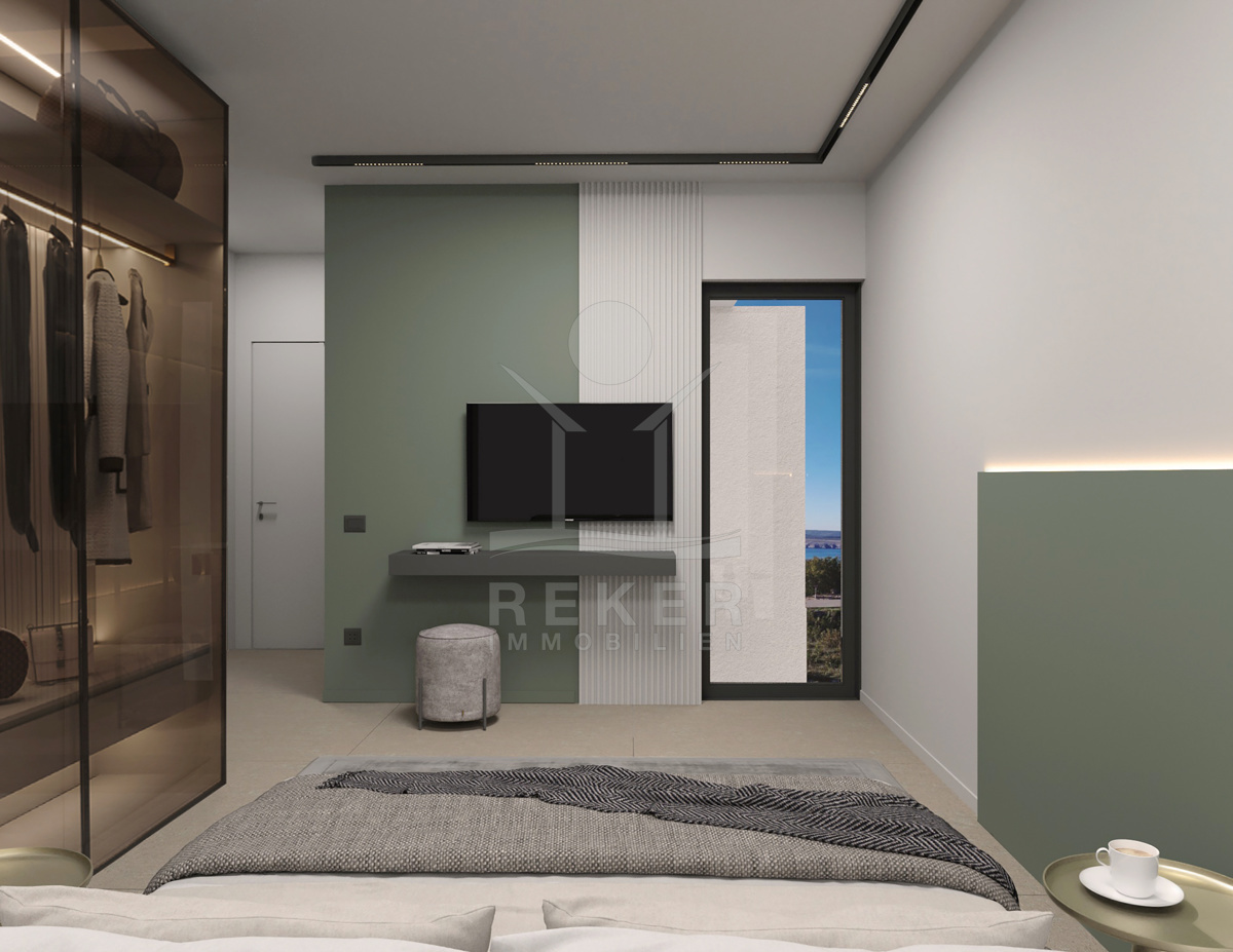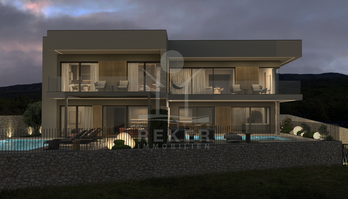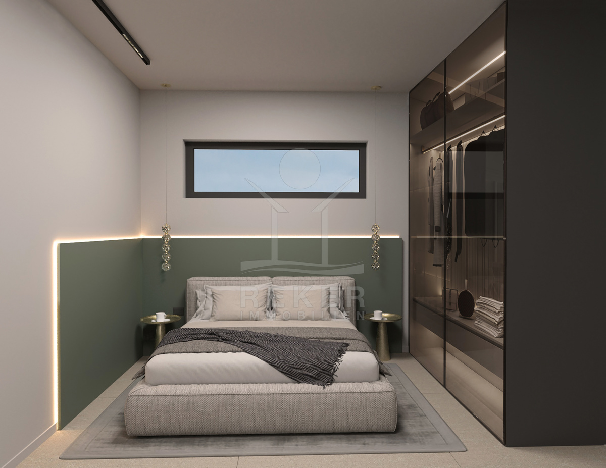 Im Obergeschoss erwarten Sie 2 weitere Schlafzimmer, ebenfalls mit eigenem Bad, sowie ein offen gestaltetes Wohnzimmer mit integrierter Küche und Essbereich. Hier genießen Sie den Zugang zu einer überdachten Terrasse mit atemberaubendem Panoramablick auf das Meer und die Insel Krk.