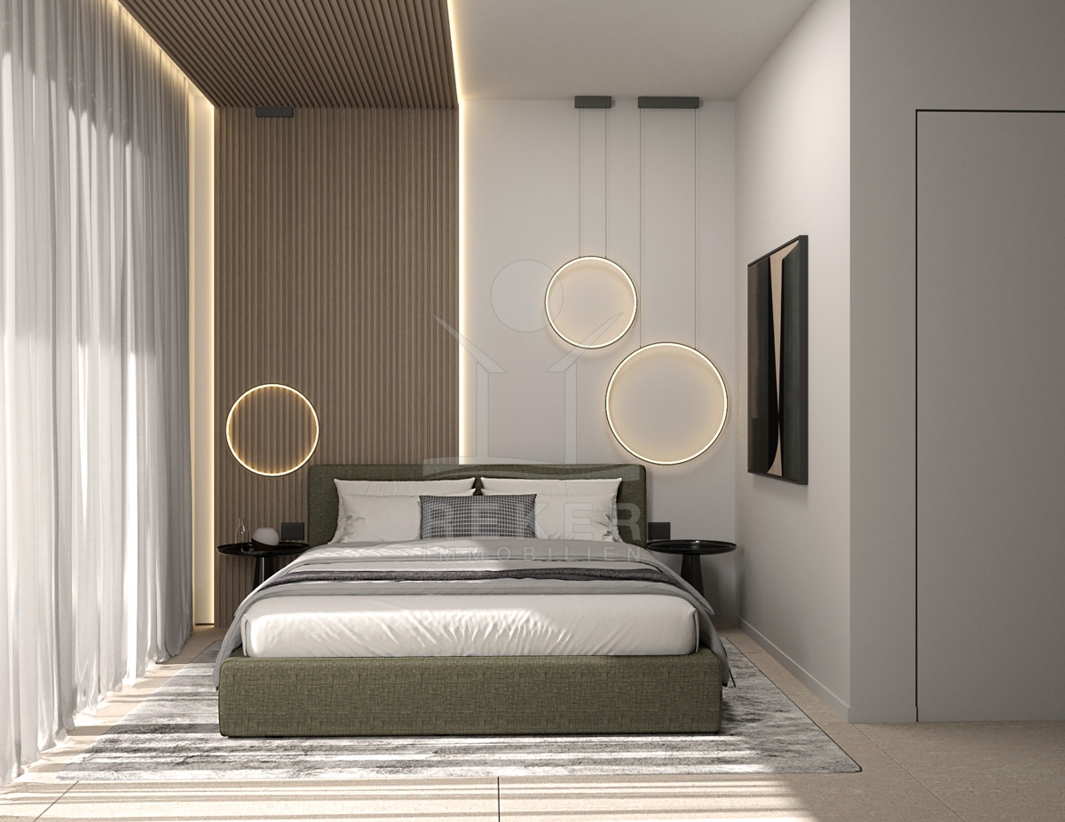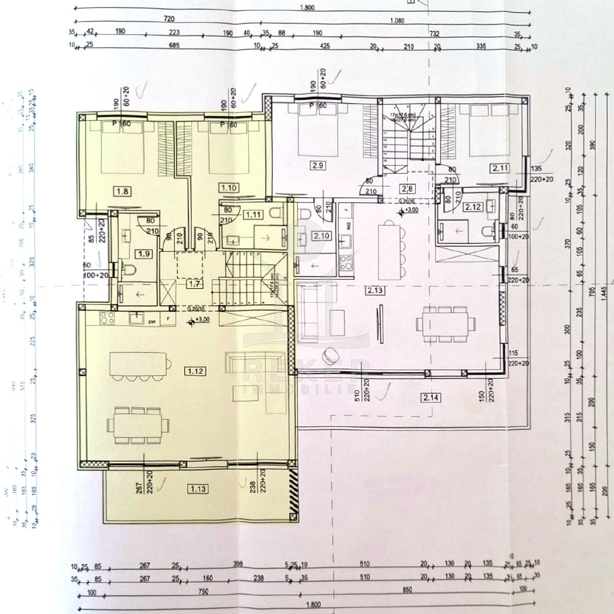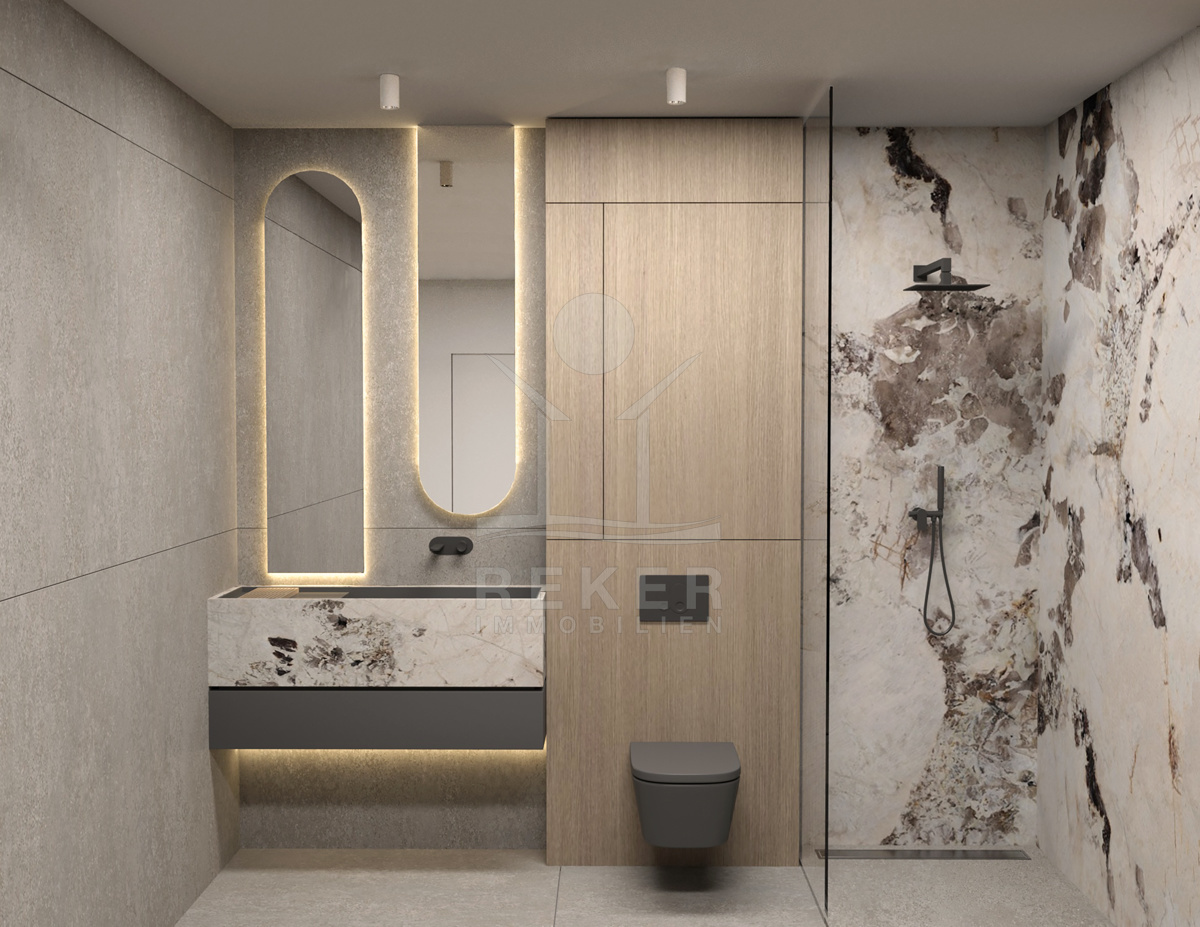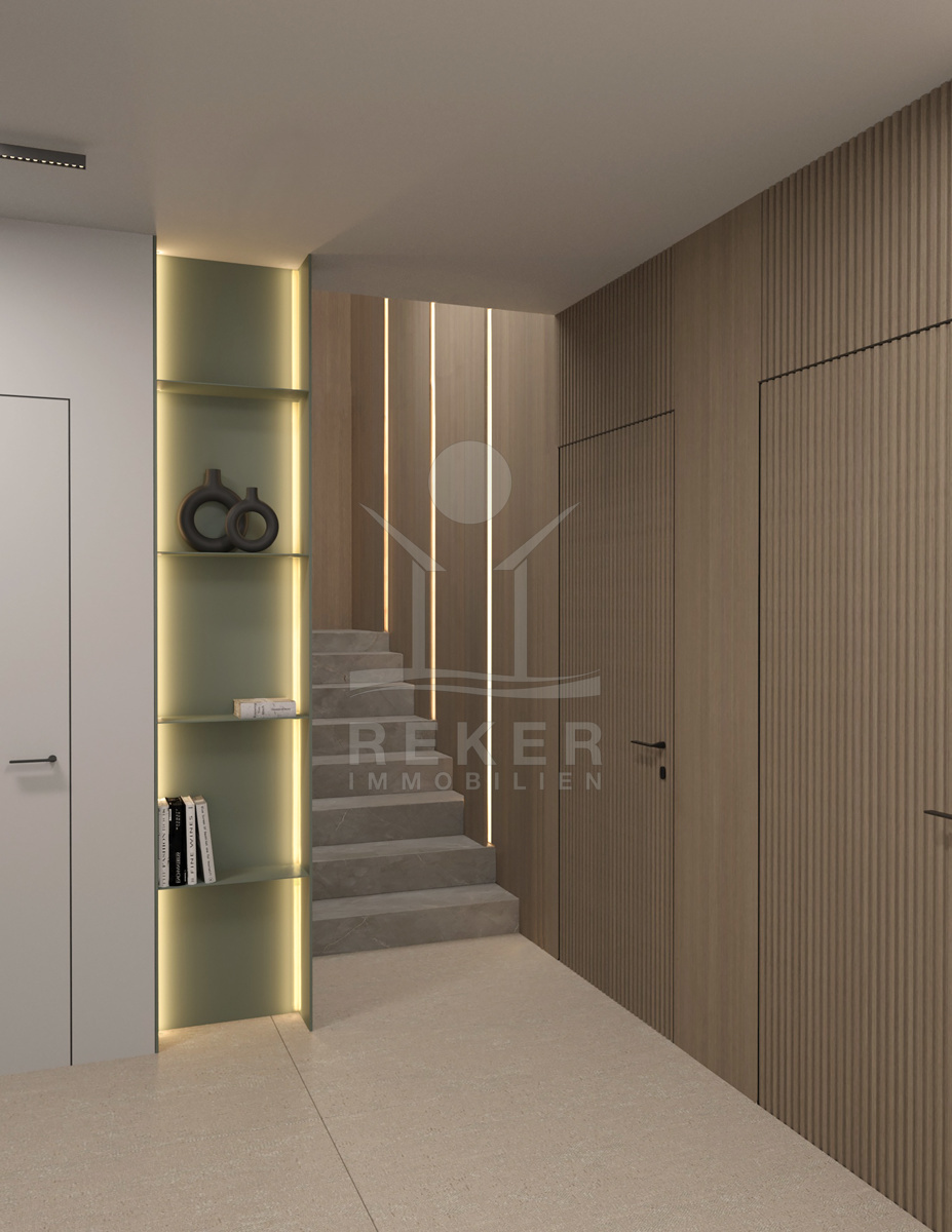 Im Obergeschoss erwarten Sie 2 weitere Schlafzimmer, ebenfalls mit eigenem Bad, sowie ein offen gestaltetes Wohnzimmer mit integrierter Küche und Essbereich. Hier genießen Sie den Zugang zu einer überdachten Terrasse mit atemberaubendem Panoramablick auf das Meer und die Insel Krk.