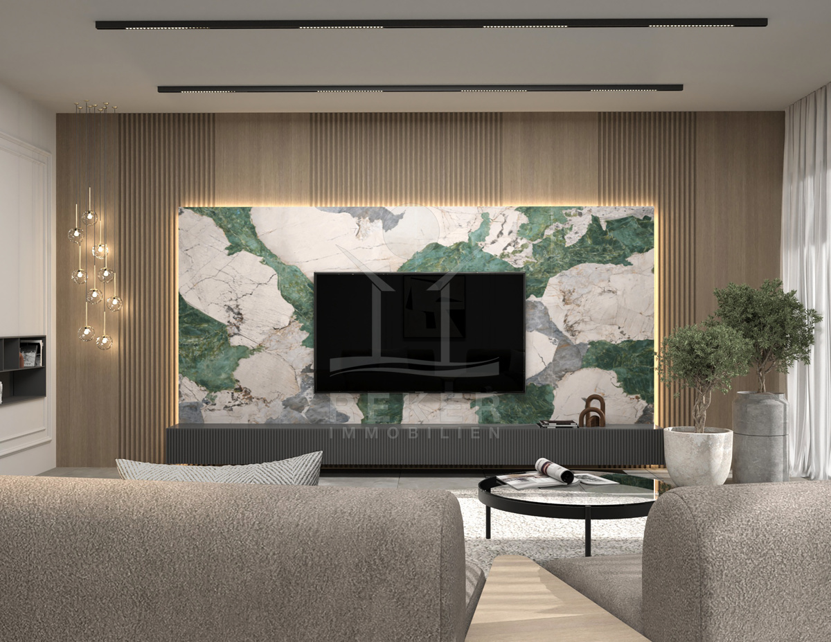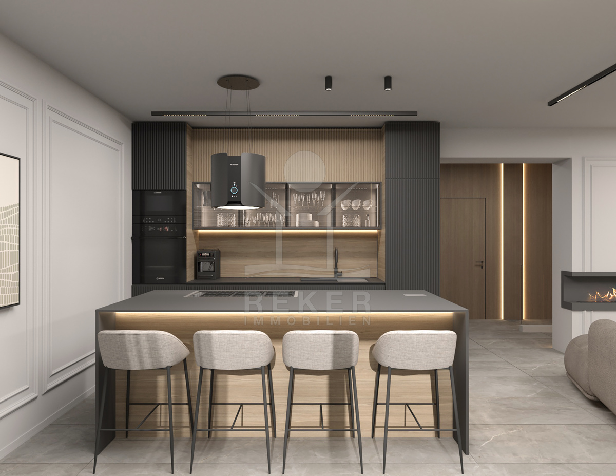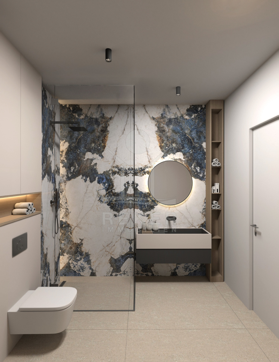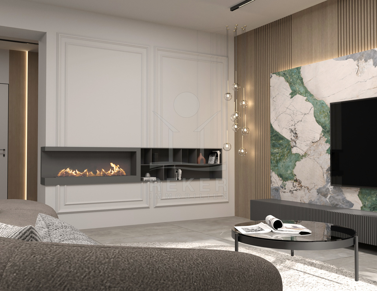 Im Obergeschoss erwarten Sie 2 weitere Schlafzimmer, ebenfalls mit eigenem Bad, sowie ein offen gestaltetes Wohnzimmer mit integrierter Küche und Essbereich. Hier genießen Sie den Zugang zu einer überdachten Terrasse mit atemberaubendem Panoramablick auf das Meer und die Insel Krk.