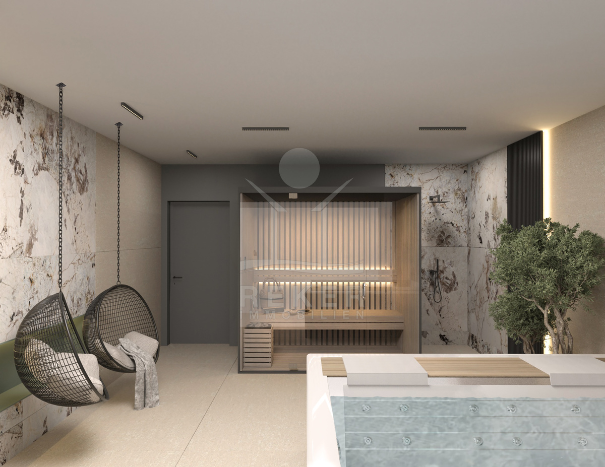 Die schöne Haushälfte erstreckt sich über 2 Etagen und bietet im Erdgeschoss eine einladende Eingangshalle, einen geräumigen Abstellraum, ein Schlafzimmer mit eigenem Bad und einen beeindruckenden Wellnessbereich mit Fitnessraum, Whirlpool und Sauna. Von hier aus gelangen Sie direkt zur Terrasse, dem Swimmingpool und der gepflegten Liegewiese im eingezäunten Garten.