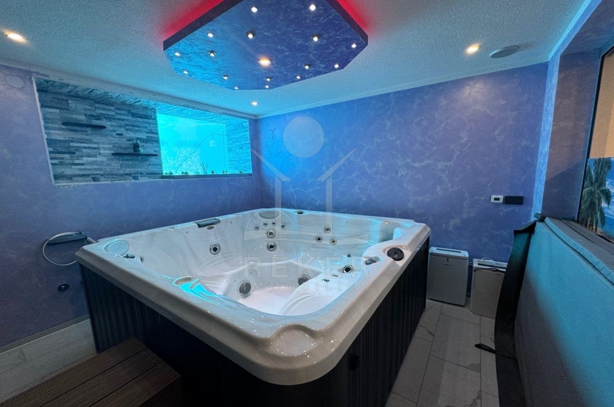 Das Untergeschoss beherbergt einen großen Aufenthaltsraum - eine Taverne für gesellige Runden. Zudem erwartet Sie ein Wellnessbereich mit Jacuzzi, Sauna, einem Badezimmer mit Dusche und einem WC. Großzügige Aufteilung und erstklassige Ausstattung sorgen für Entspannung und Genuss.