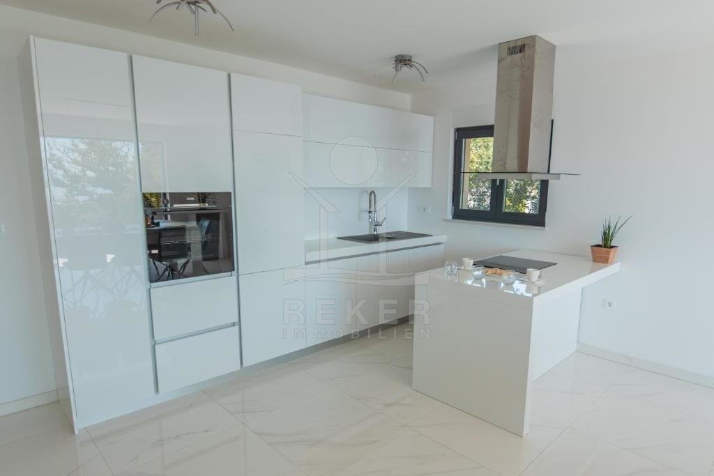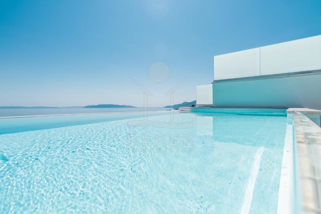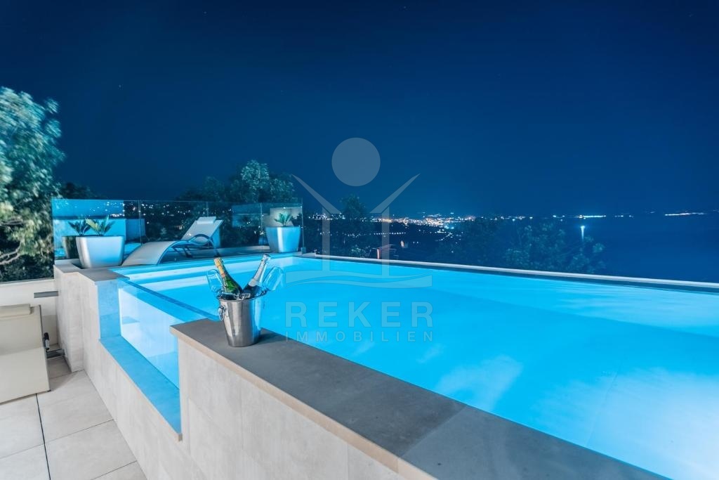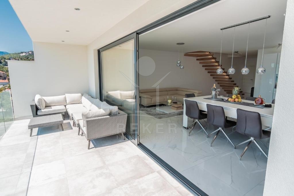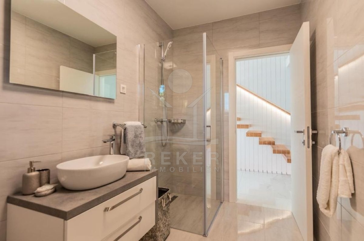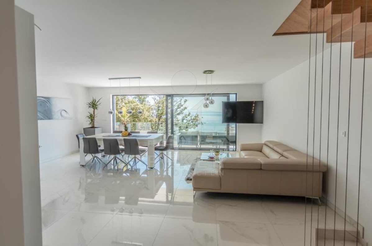 Im Obergeschoss erwartet Sie ein großzügiger offener Wohn-, Ess- und Küchenbereich. Eine riesige Fensterfront mit Schieberelementen bietet eine atemberaubende Aussicht auf das Meer. Von hier aus gelangen Sie auch auf eine überdachte Terrasse mit Loungeecke, wo Sie den Blick auf das Meer in vollen Zügen genießen können. Im ersten Stock befindet sich ein weiteres Schlafzimmer mit eigenem Badezimmer, das exklusiven Komfort bietet.
